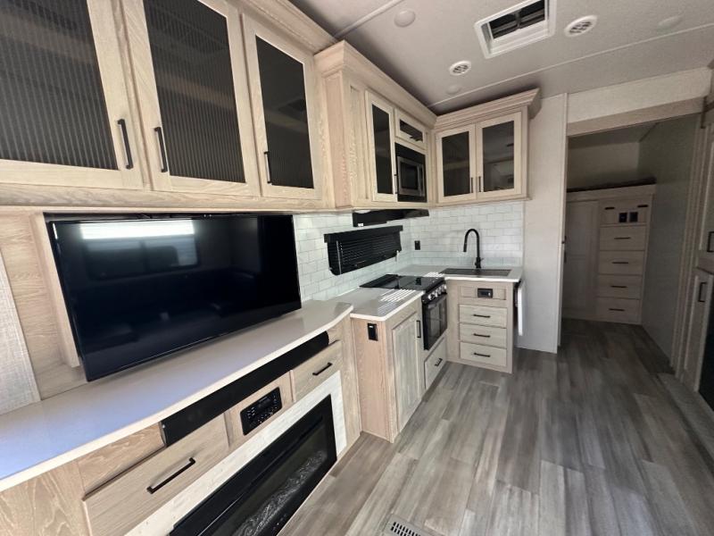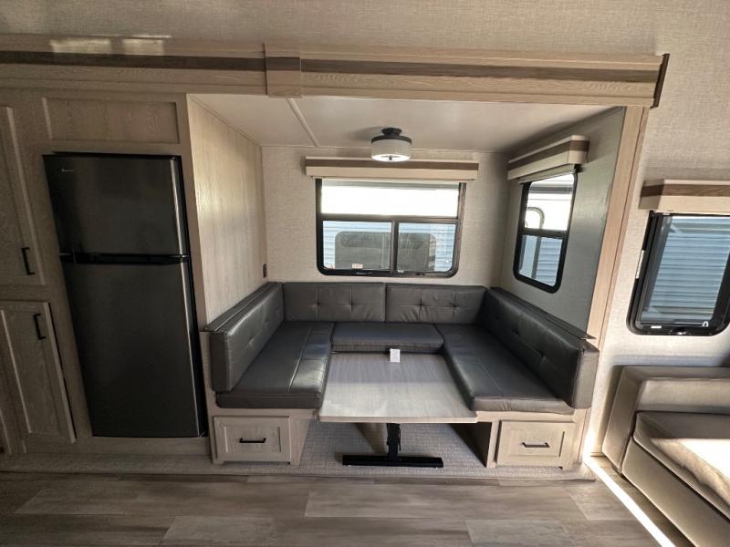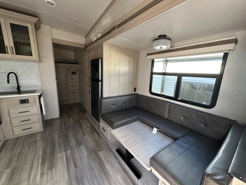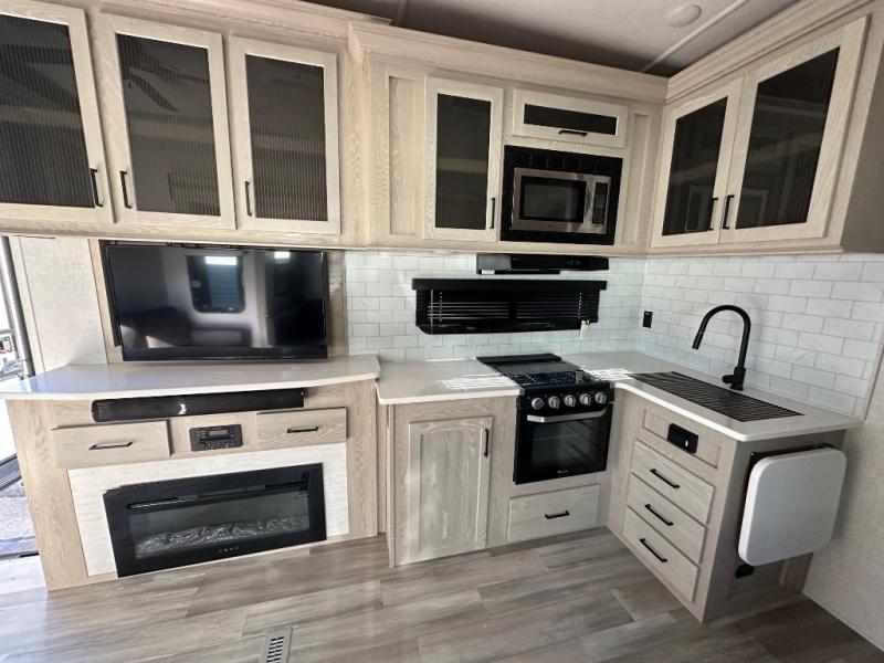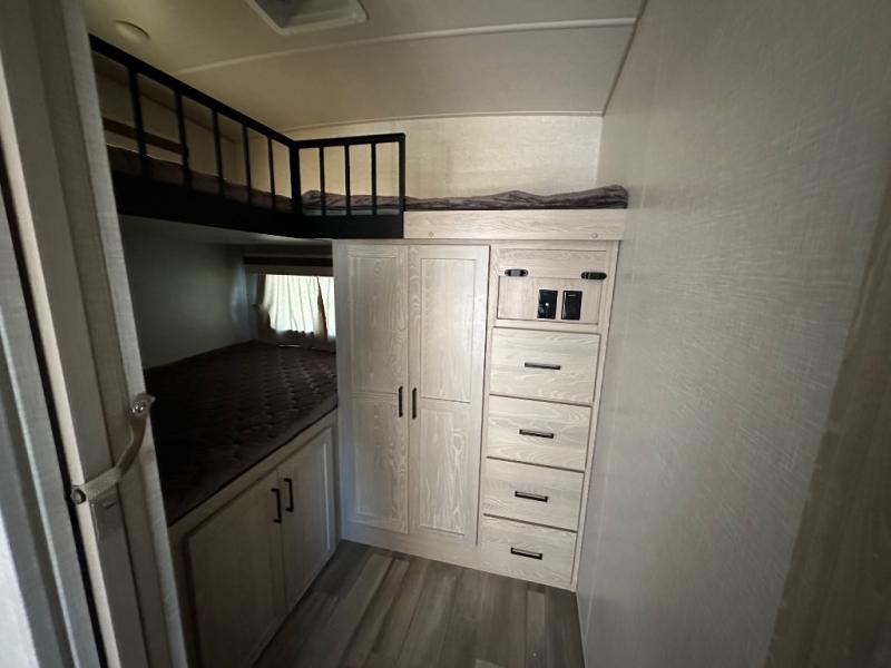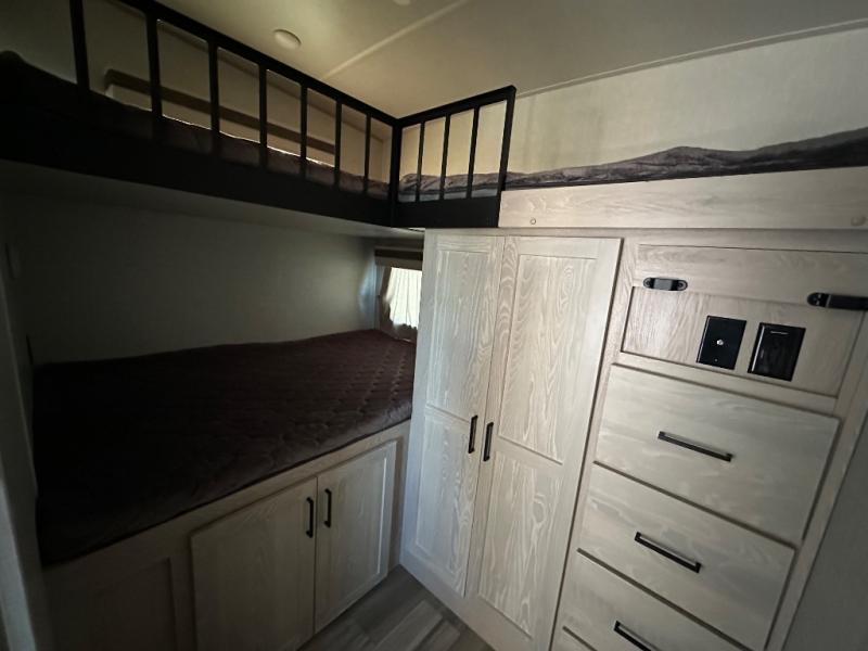 Looking to travel with your family and friends and need lots of space for everyone? This Ultra Lite offers a master suite with a queen bed, a wardrobe slide that stretches into the double entry bathroom, plus more storage, and on the opposite side of the fifth wheel there is a private bunkhouse with triple bunks, and storage. The main living and kitchen area includes a slide out which offers a king U-shaped dinette to dine at, play games with friends, and provides sleeping if needed, plus an 11 cu. ft. refrigerator and a pantry. There is a hide-a-bed sofa as well, and an LED TV with fireplace below to enjoy when inside. The cook will have full amenities indoors plus an outside kitchen and a griddle to make more meals while enjoying the outdoors and the 20' power awning.