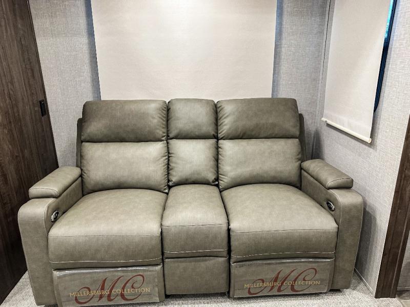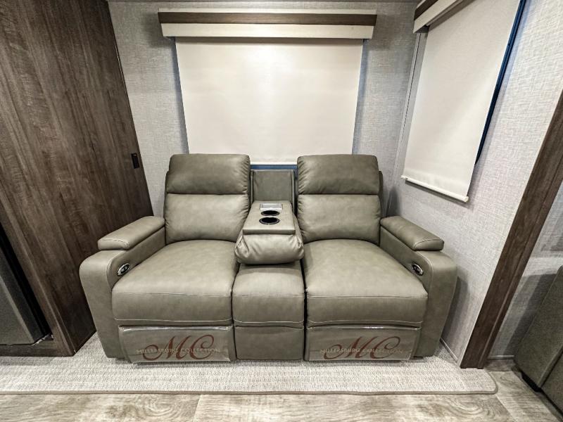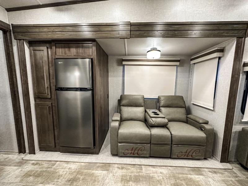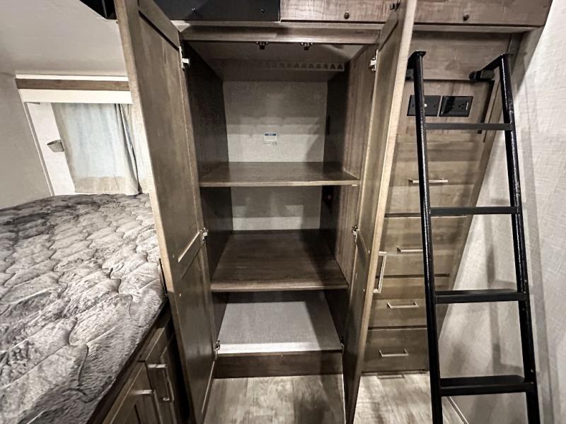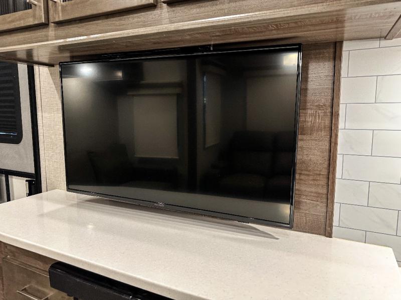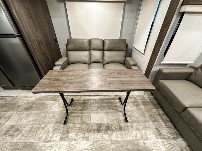 Looking to travel with your family and friends and need lots of space for everyone? This Ultra Lite offers a master suite with a queen bed, a wardrobe slide that stretches into the double entry bathroom, plus more storage, and on the opposite side of the fifth wheel there is a private bunkhouse with triple bunks, and storage. The main living and kitchen area includes a slide out which offers a king U-shaped dinette to dine at, play games with friends, and provides sleeping if needed, plus an 11 cu. ft. refrigerator and a pantry. There is a hide-a-bed sofa as well, and an LED TV with fireplace below to enjoy when inside. The cook will have full amenities indoors plus an outside kitchen and a griddle to make more meals while enjoying the outdoors and the 20' power awning.
