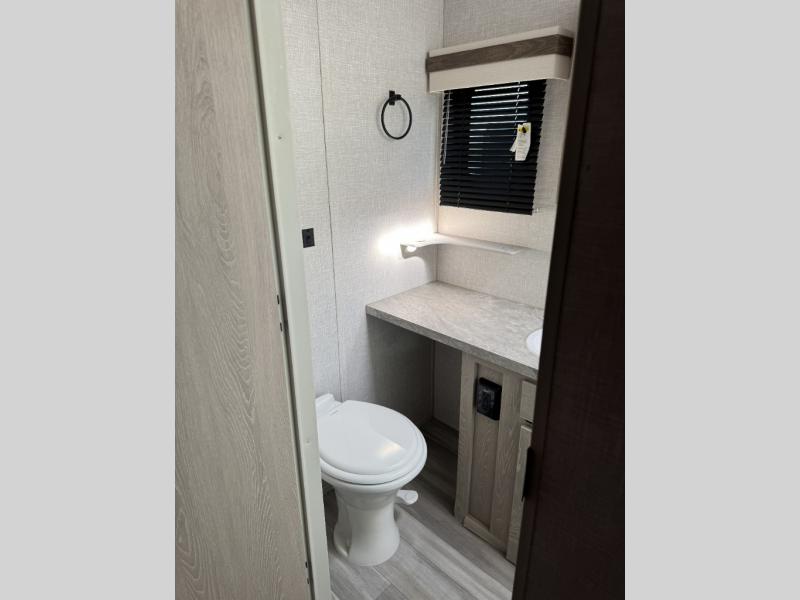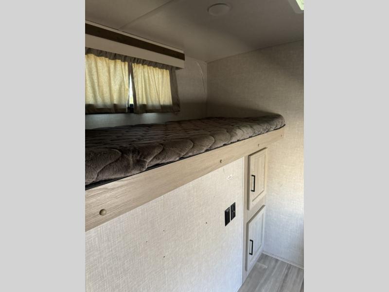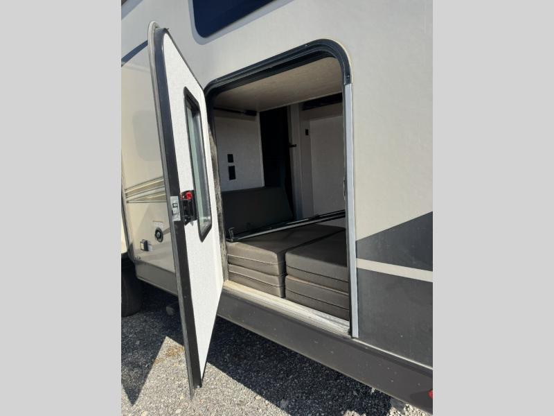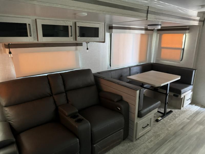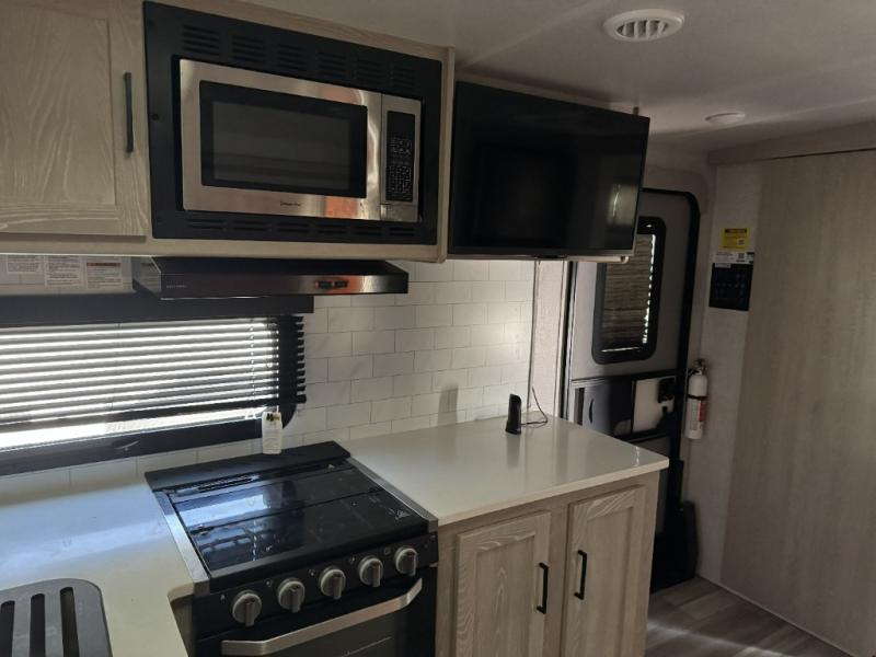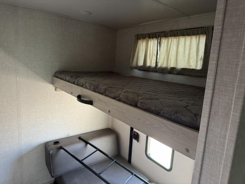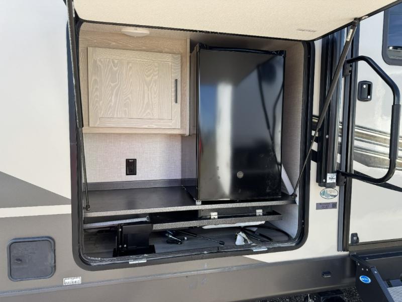 Go camping to explore the outdoors, to enjoy the scenery and do it all over again thanks to the comfort of your own trailer at the campsite! From dual entry making entering and exiting easy to the private rear bunkhouse with two bunks and a Play Cube sofa plus the spacious private bedroom up front, you might not want to return home. You will find lots of storage in the front bedroom, plus a queen bed slide and the second entry, and the full bathroom has access from the main living and kitchen area. Everyone can relax on the theater seating or U-shaped dinette while the cook uses the L-shaped kitchen area with full amenities to make meals. And the exterior gives you an outside kitchen, a griddle, plus storage including a bike door that allows you to stow things from the outside to the inside under the bunk.