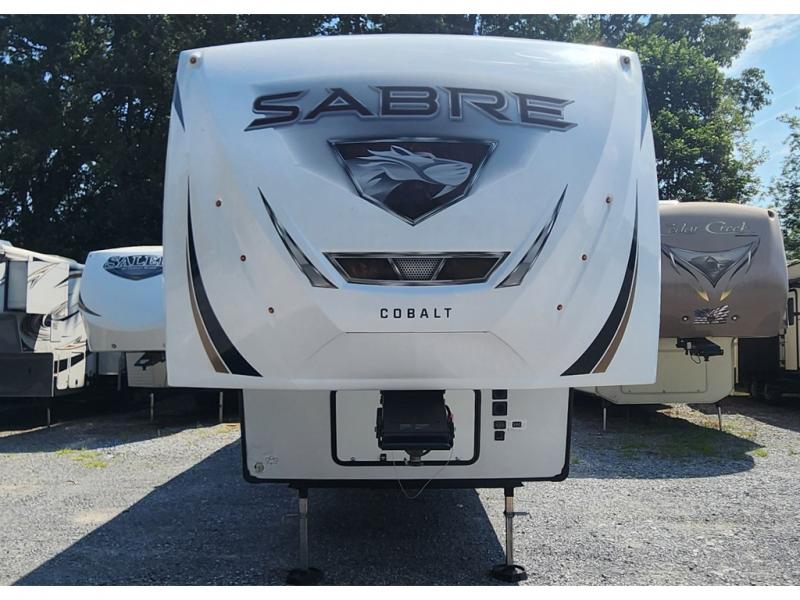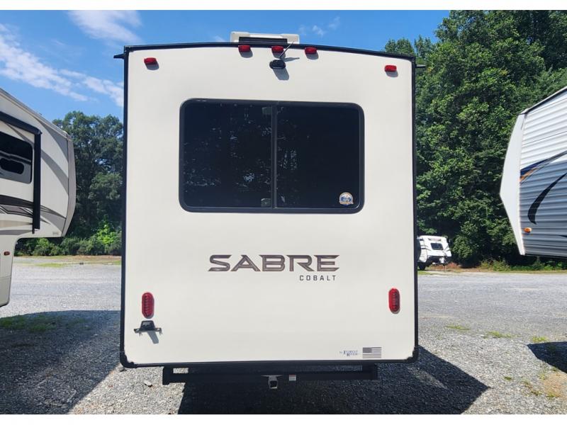 You will experience luxurious camping trips at an affordable price with any one of these Forest River Sabre fifth wheels! These models are durable and ready to travel anytime of the year thanks to features like the high-gloss gel-coat front cap with LED lighting, the PVC roof membrane, and the forced air underbelly with enclosed gate valves. The electric auto-leveling system makes setting up easy and safe, and the adjustable power awning with LED lighting will create an inviting outdoor living space. Each model includes a universal docking station which includes a black tank flush and an outside shower, and the backlit "Secure Step" landing for you to enter and exit the unit safely. Inside, you will love the design of the ambient accent lighting above the crown molding in the living area, the real wood lumbercore cabinetry, and the vintage gaslight decorative lighting!