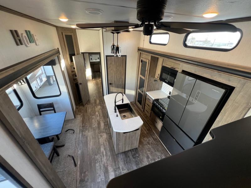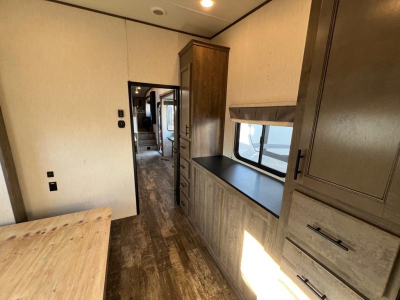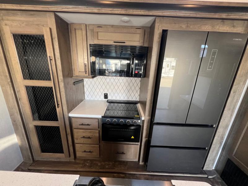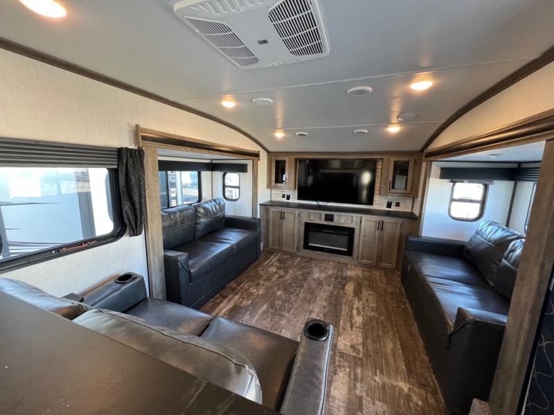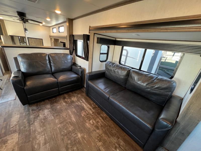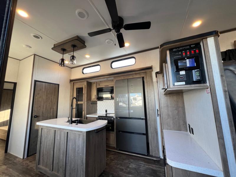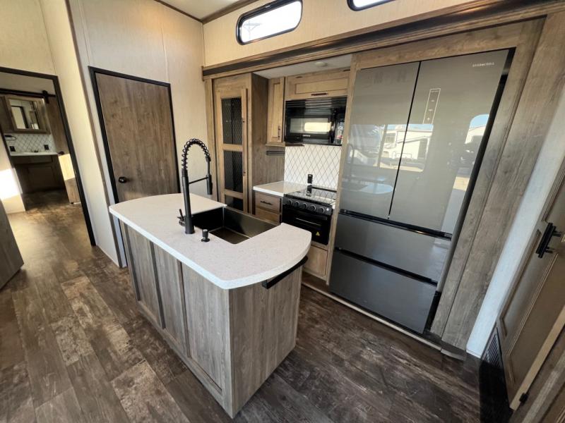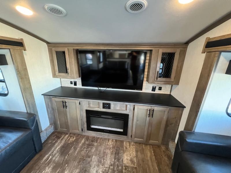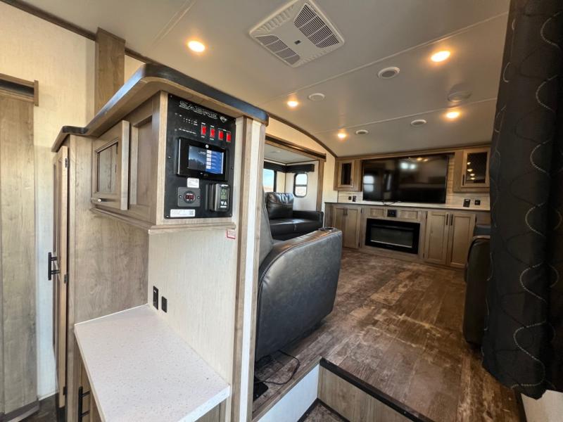 This Sabre fifth wheel with a full and half bath is sure to be a crowd pleaser! The front living area is the perfect place for everyone to visit each other comfortably on the two tri-fold sofas that can be transformed into extra sleeping spaces, or at the theater seating for complete relaxation. You will also find an entertainment center with a fireplace and a residential-size LED TV. This Sabre kitchen is packed out with convenient features, such as a 12V refrigerator with French doors, a kitchen island, and a lighted pantry with motion sensors. The rear master suite has access to its very own full bathroom with a double-sink vanity for two to get ready at once and a wardrobe that is prepped for the optional washer and dryer to be added for convenience!