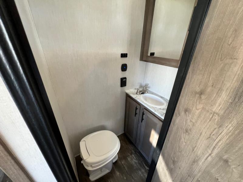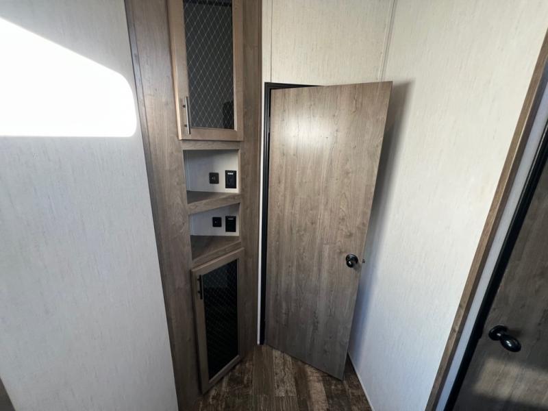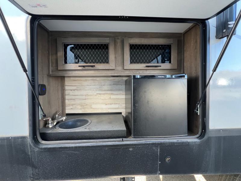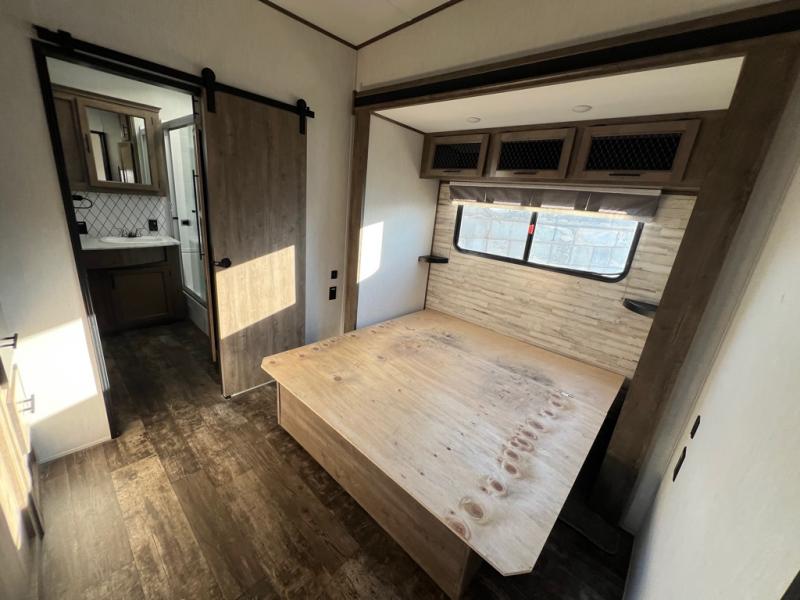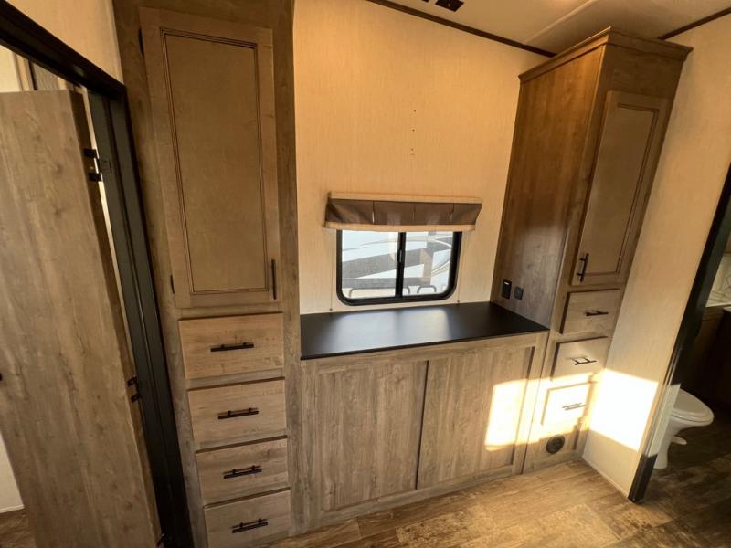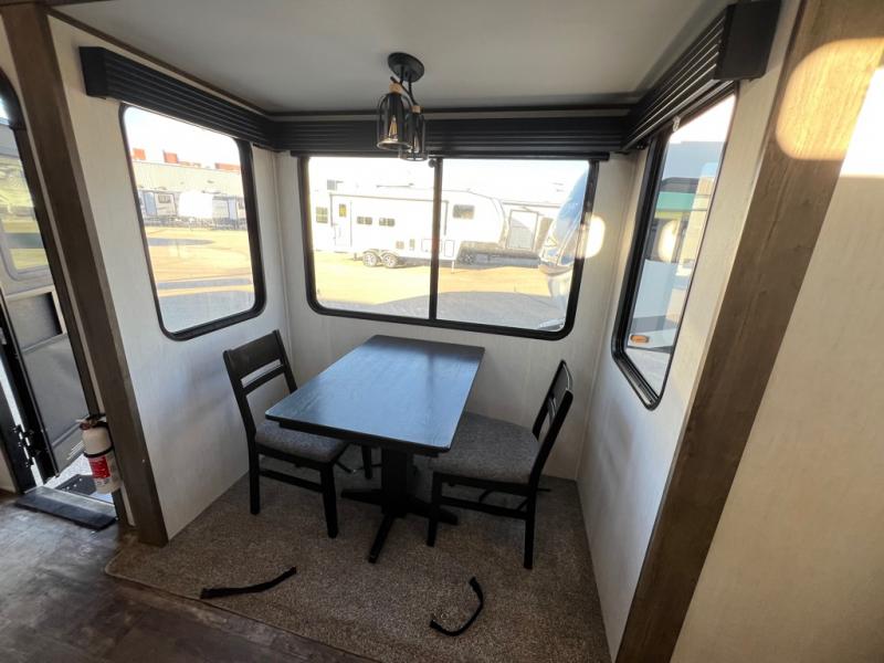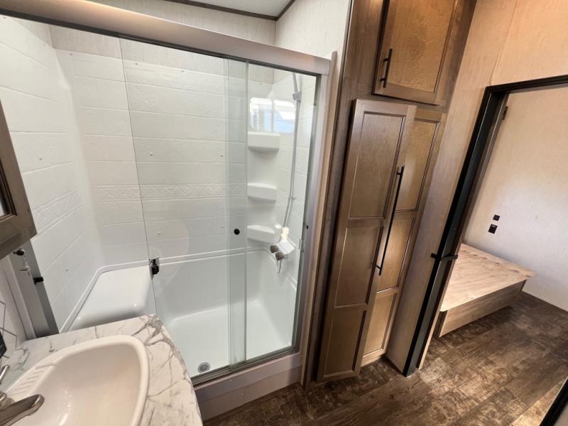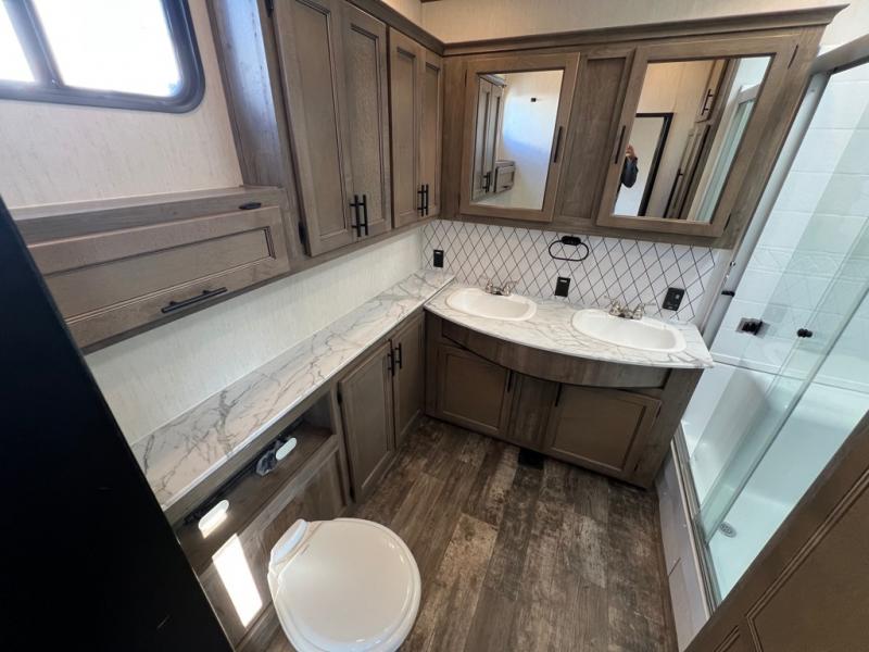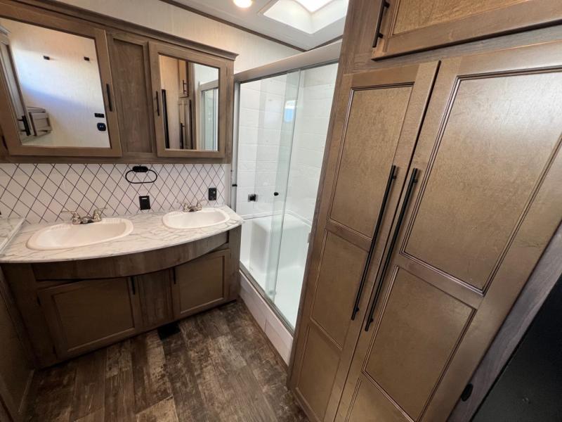 This Sabre fifth wheel with a full and half bath is sure to be a crowd pleaser! The front living area is the perfect place for everyone to visit each other comfortably on the two tri-fold sofas that can be transformed into extra sleeping spaces, or at the theater seating for complete relaxation. You will also find an entertainment center with a fireplace and a residential-size LED TV. This Sabre kitchen is packed out with convenient features, such as a 12V refrigerator with French doors, a kitchen island, and a lighted pantry with motion sensors. The rear master suite has access to its very own full bathroom with a double-sink vanity for two to get ready at once and a wardrobe that is prepped for the optional washer and dryer to be added for convenience!