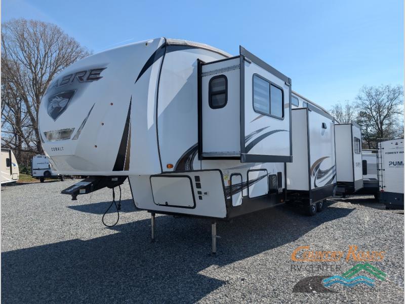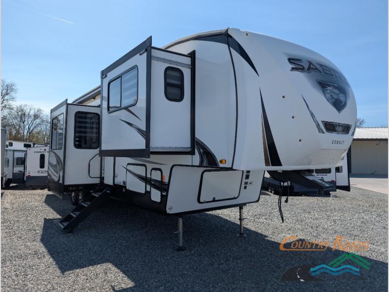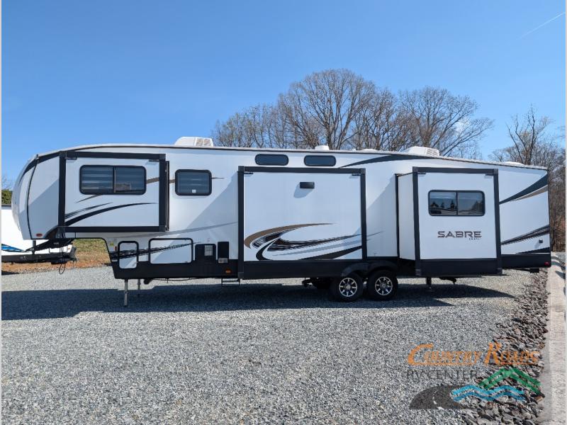 You will experience luxurious camping trips at an affordable price with any one of these Forest River Sabre fifth wheels! These models are durable and ready to travel anytime of the year thanks to features like the high-gloss gel-coat front cap with LED lighting, the PVC roof membrane, and the forced air underbelly with enclosed gate valves. The electric auto-leveling system makes setting up easy and safe, and the adjustable power awning with LED lighting will create an inviting outdoor living space. Each model includes a universal docking station which includes a black tank flush and an outside shower, and the backlit "Secure Step" landing for you to enter and exit the unit safely. Inside, you will love the design of the ambient accent lighting above the crown molding in the living area, the real wood lumbercore cabinetry, and the vintage gaslight decorative lighting!