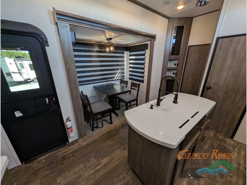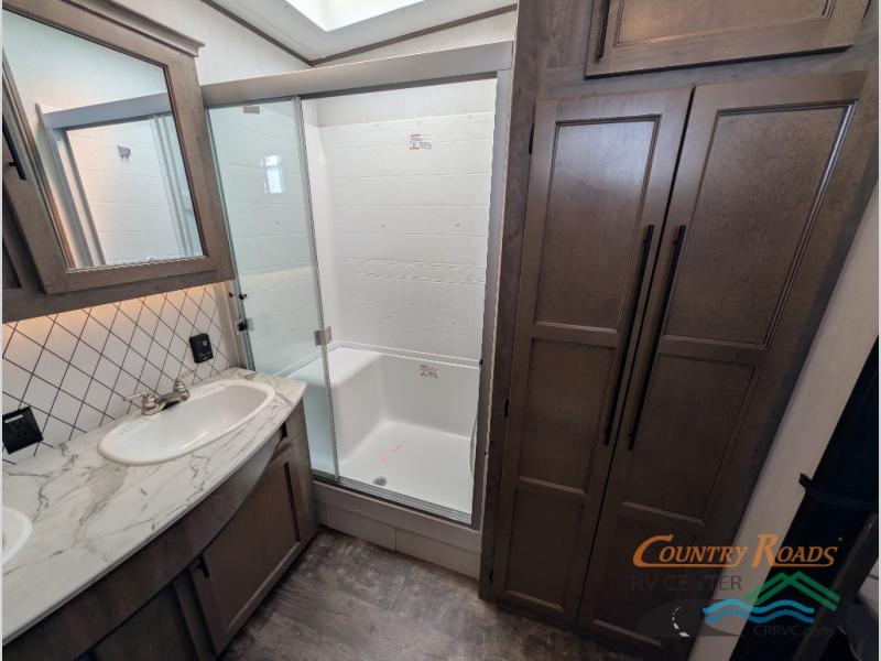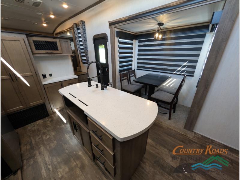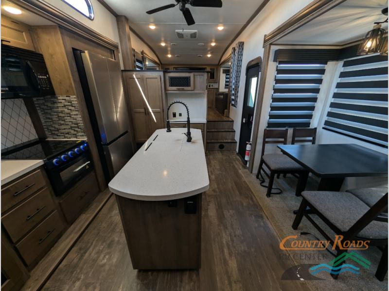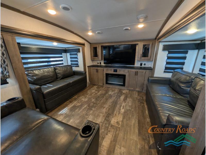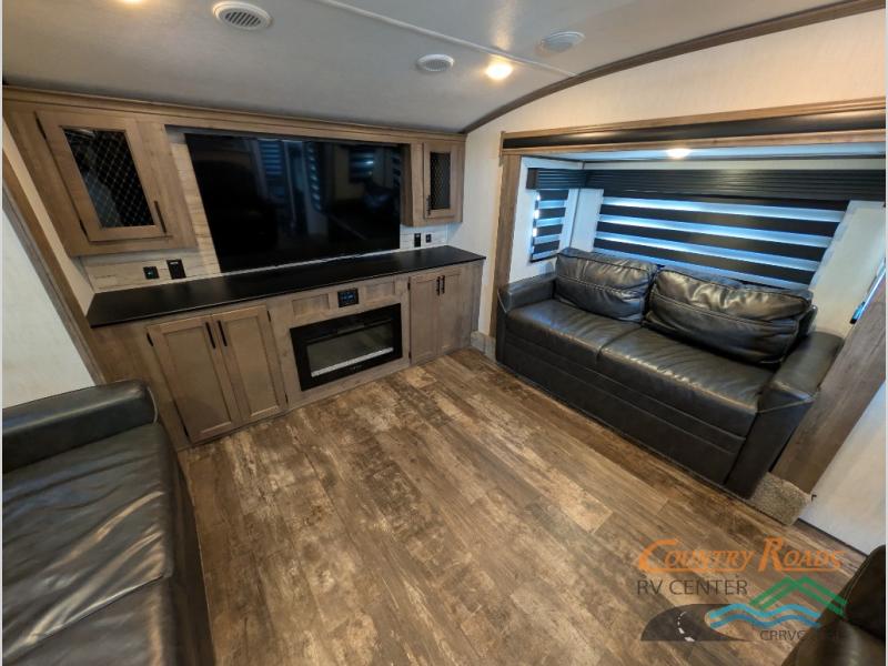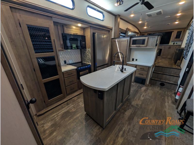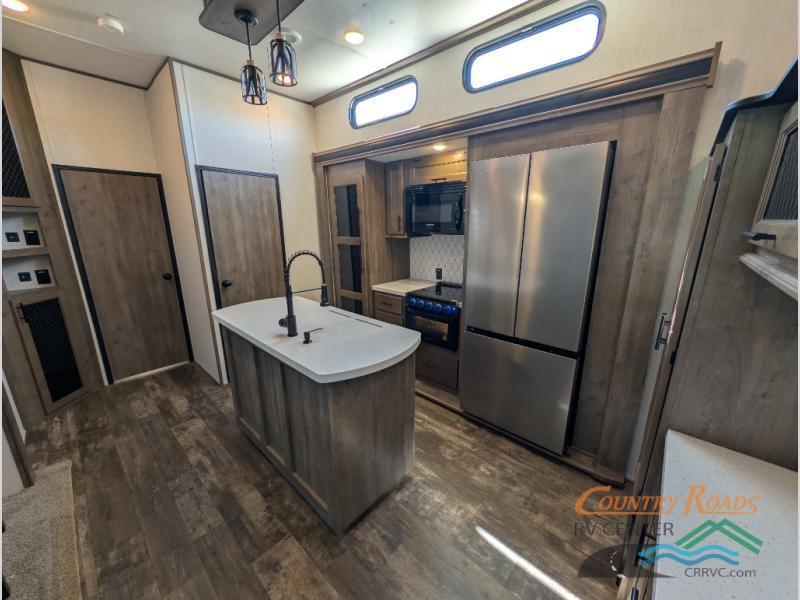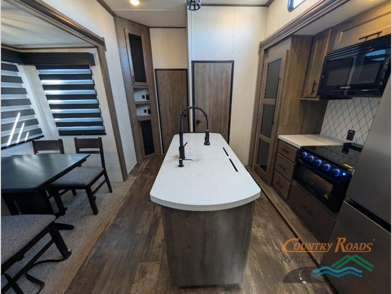 This Sabre fifth wheel with a full and half bath is sure to be a crowd pleaser! The front living area is the perfect place for everyone to visit each other comfortably on the two tri-fold sofas that can be transformed into extra sleeping spaces, or at the theater seating for complete relaxation. You will also find an entertainment center with a fireplace and a residential-size LED TV. This Sabre kitchen is packed out with convenient features, such as a 12V refrigerator with French doors, a kitchen island, and a lighted pantry with motion sensors. The rear master suite has access to its very own full bathroom with a double-sink vanity for two to get ready at once and a wardrobe that is prepped for the optional washer and dryer to be added for convenience!