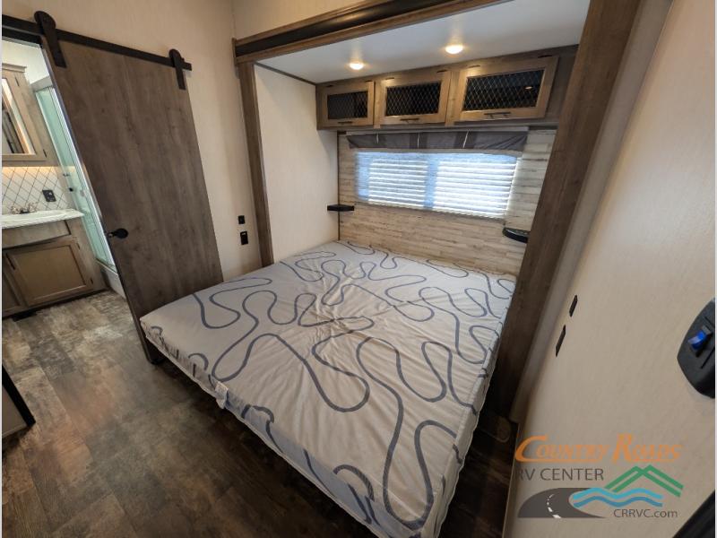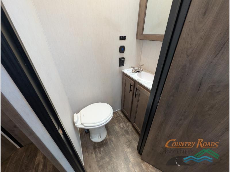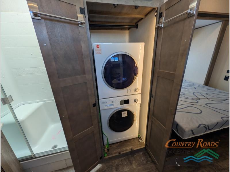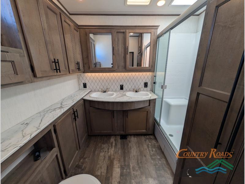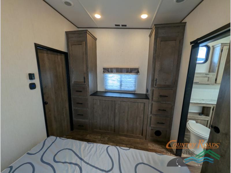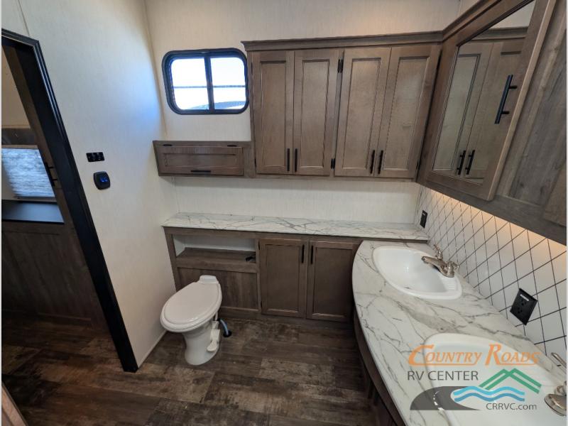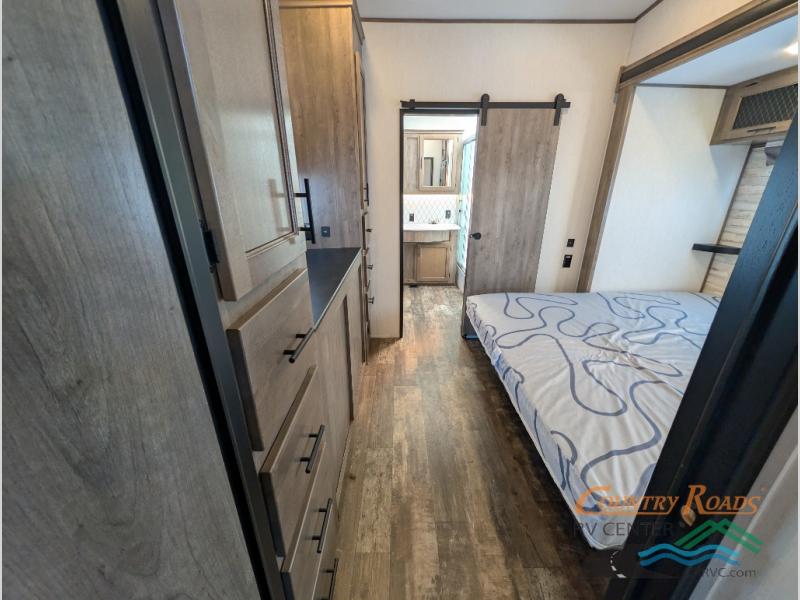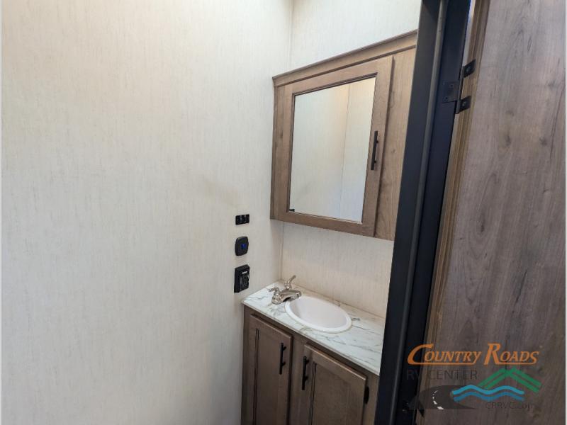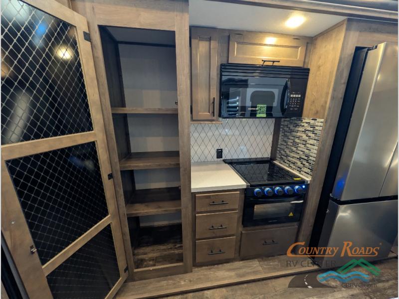 This Sabre fifth wheel with a full and half bath is sure to be a crowd pleaser! The front living area is the perfect place for everyone to visit each other comfortably on the two tri-fold sofas that can be transformed into extra sleeping spaces, or at the theater seating for complete relaxation. You will also find an entertainment center with a fireplace and a residential-size LED TV. This Sabre kitchen is packed out with convenient features, such as a 12V refrigerator with French doors, a kitchen island, and a lighted pantry with motion sensors. The rear master suite has access to its very own full bathroom with a double-sink vanity for two to get ready at once and a wardrobe that is prepped for the optional washer and dryer to be added for convenience!