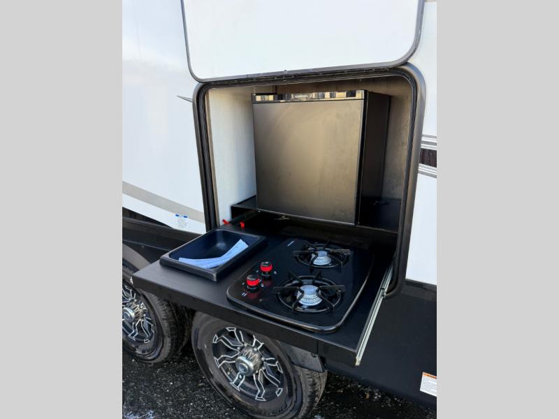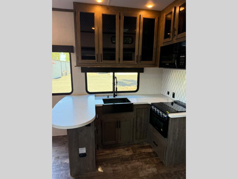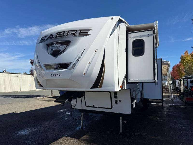 You will experience luxurious camping trips at an affordable price with any one of these Forest River Sabre fifth wheels! These models are durable and ready to travel anytime of the year thanks to features like the high-gloss gel-coat front cap with LED lighting, the PVC roof membrane, and the forced air underbelly with enclosed gate valves. The electric auto-leveling system makes setting up easy and safe, and the adjustable power awning with LED lighting will create an inviting outdoor living space. Each model includes a universal docking station which includes a black tank flush and an outside shower, and the backlit "Secure Step" landing for you to enter and exit the unit safely. Inside, you will love the design of the ambient accent lighting above the crown molding in the living area, the real wood lumbercore cabinetry, and the vintage gaslight decorative lighting!