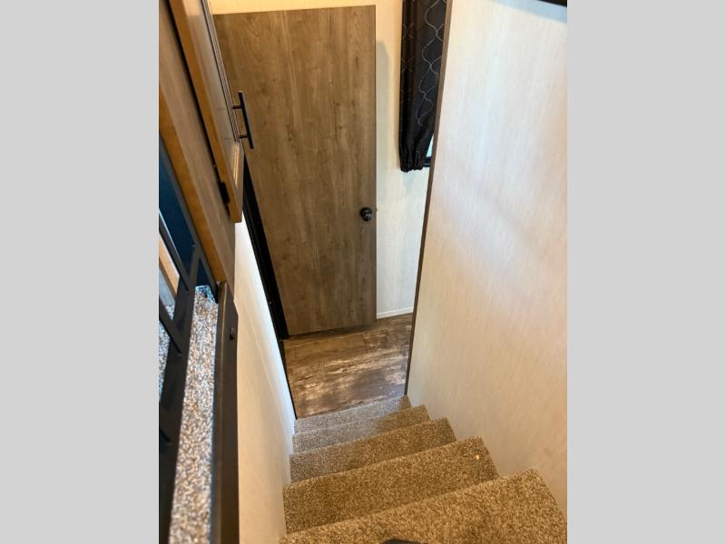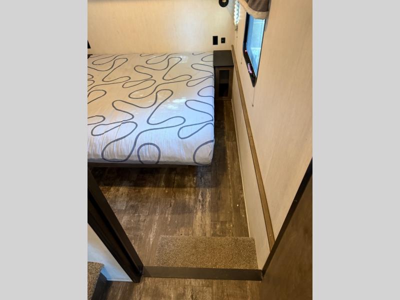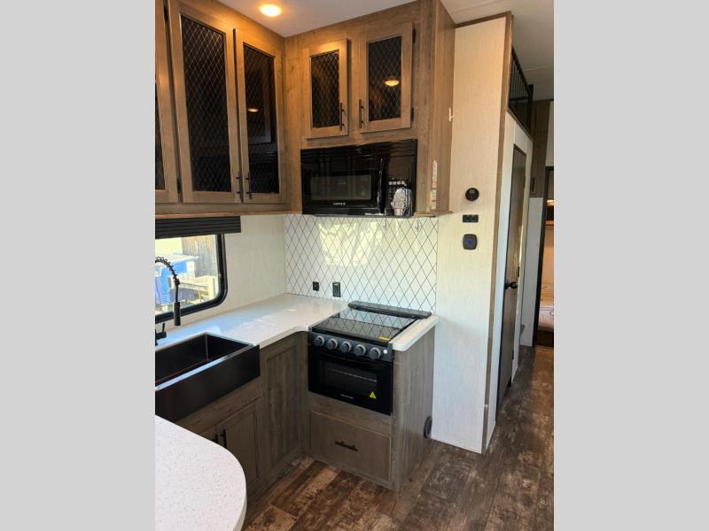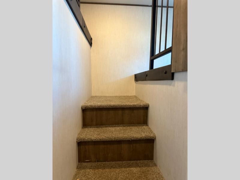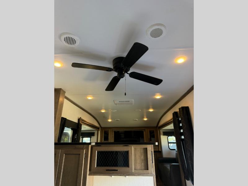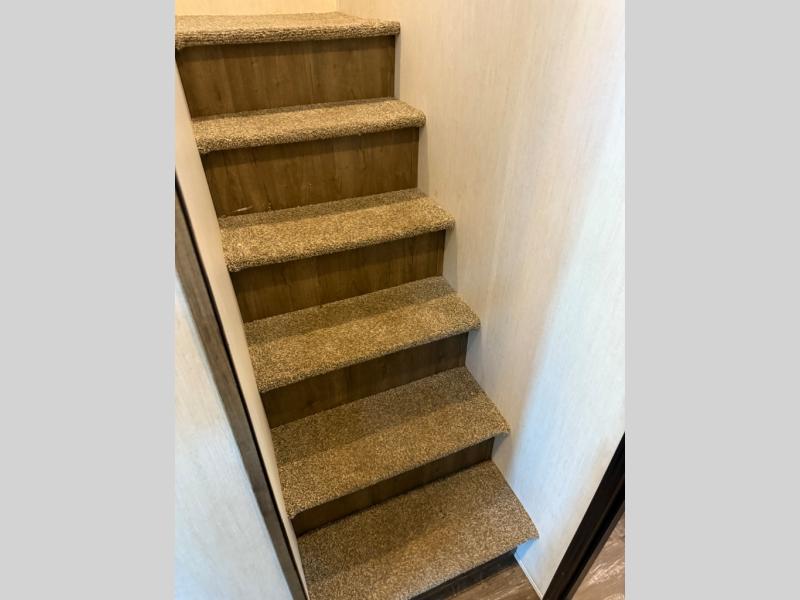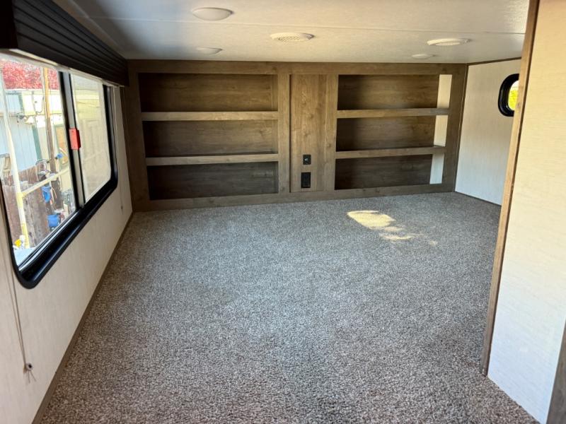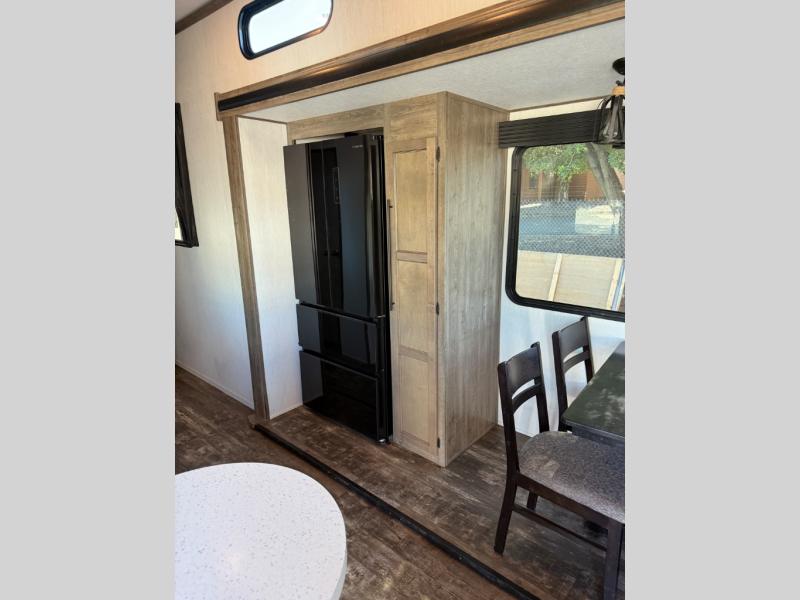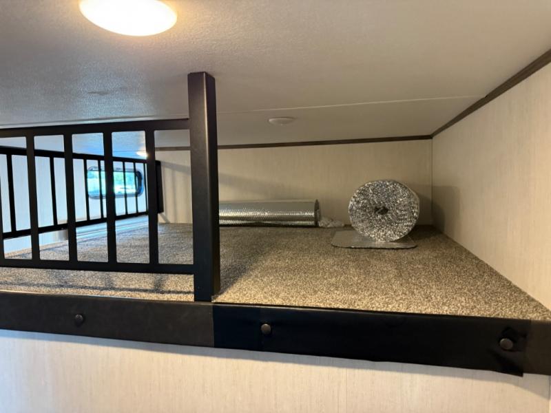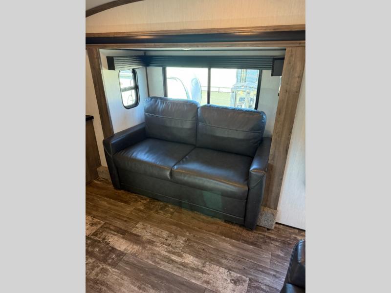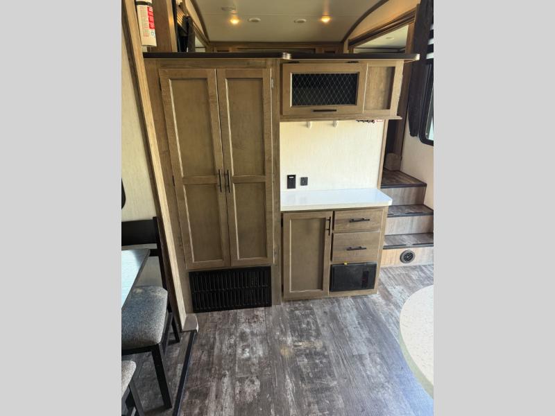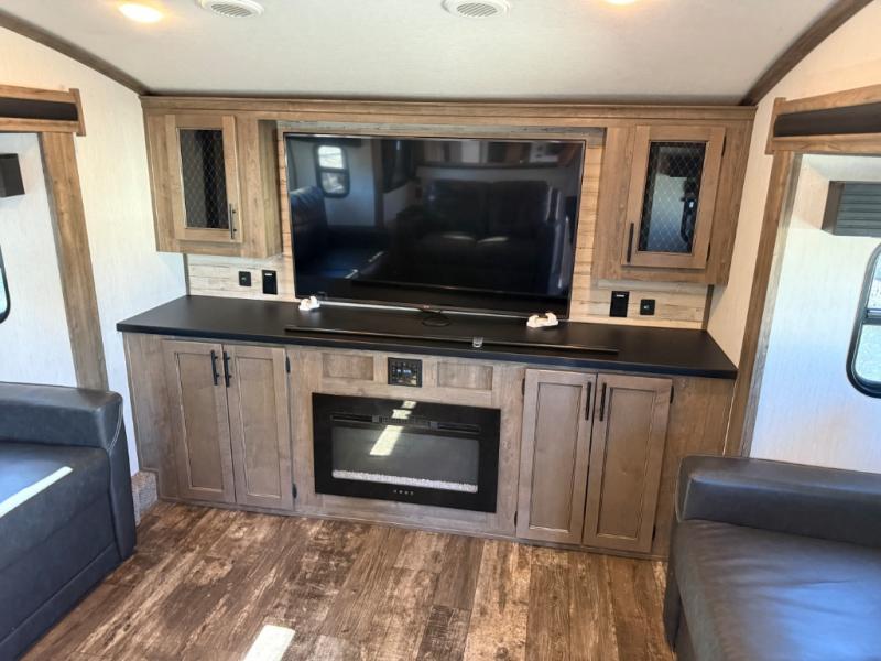 There is only one word that can describe this Sabre fifth wheel: fabulous! You will be amazed by the amount of comfortable convenience that is scattered all throughout this model for you and your family or friends. From the tri-fold sofa slides, the theater seats, the fireplace and entertainment center in the front living room to the rear bedroom with its queen bed and wardrobe slide out, you will always have a place to relax and unwind. Not only that, but there is also a large loft area up above the bedroom and bath which has sleeping space, storage, a wardrobe, and railing. The cook will enjoy the 12V refrigerator with French doors and pantry for all of your food storage needs, and the free-standing table with chairs is the perfect place to sit down and enjoy a delicious meal or play board games.