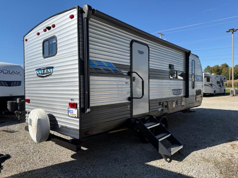 Set your sights on this Salem travel trailer that can comfortably sleep four people which makes it the perfect unit for a small family. After you've set up camp and had a look around the campground, come back to this unit to enjoy lunch or take a quick rest. The chef of the family can cook on the three-burner cooktop or make something quick in the microwave, and the 8' chaise lounge will be a perfect spot to relax or play a game of cards. You'll appreciate the full rear bath that includes a walk-in shower and a closet for extra towels. This unit also features a front private bedroom with a queen bed that you are sure to love, and you'll find plenty of storage space throughout, including an exterior pass-through compartment for the fishing poles.