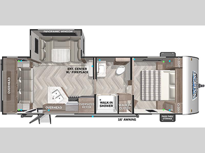 This travel trailer is packed full of features, but is still lightweight coming in at just over 5,000 lbs.! You will feel right at home in the front master bedroom with a queen bed that has closets on either side, CPAP storage, and a walk-in closet to keep your clothes looking their best. The walk-through bathroom has a walk-in shower with fiberglass surround and a skylight above for added natural lighting as you get ready. The U-shaped dinette slide has a panoramic window for you to enjoy your beautiful scenery as you eat dinner, and there is a fireplace at the entertainment center for a relaxing evening indoors. There is a pass-through storage area to store your outdoor camping gear, and a 16' power awning and exterior speakers to crank up the tunes!