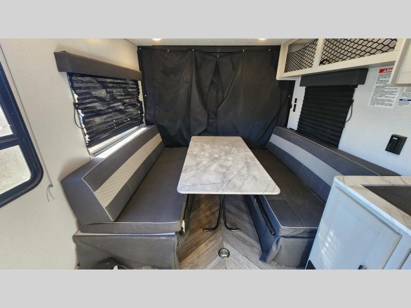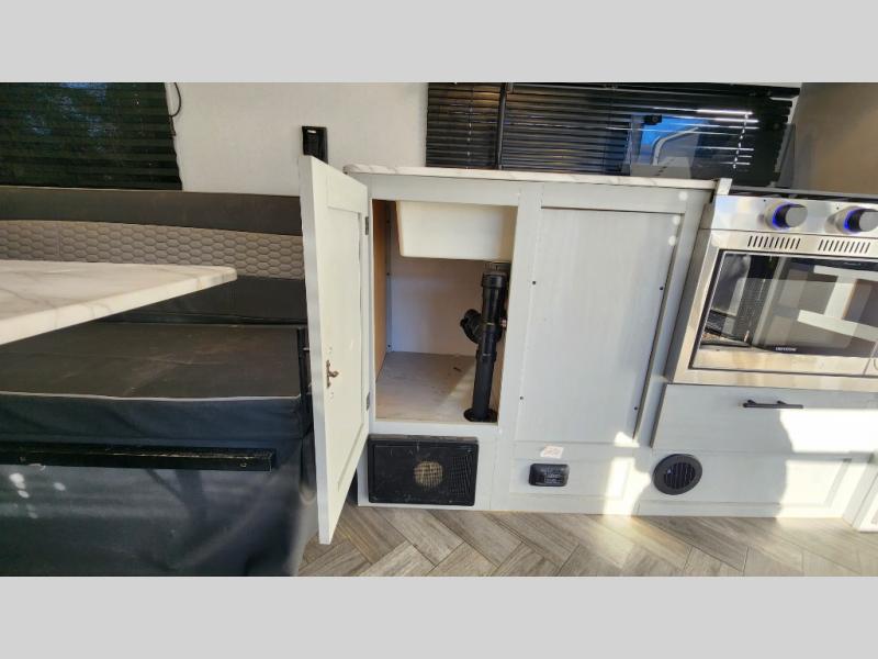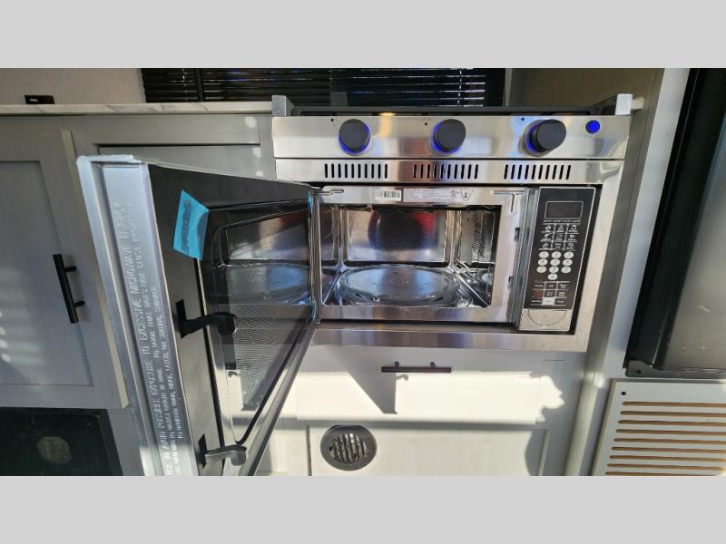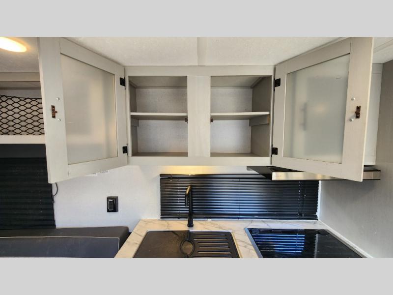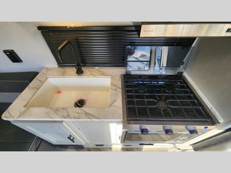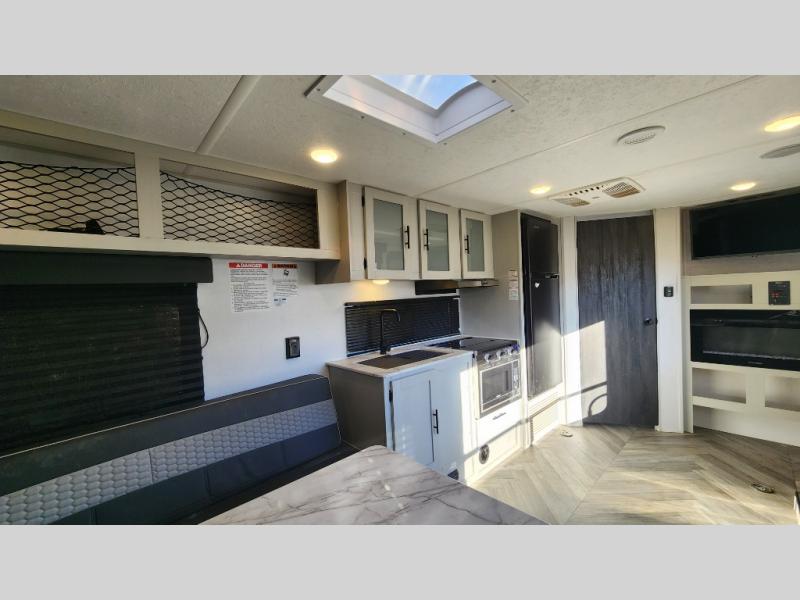 Step inside and unwind in a cozy, thoughtfully designed interior. The private front queen bed ensures restful nights, while the residential-style kitchen makes meal prep easy. A microwave, cooktop, refrigerator, and deep stainless-steel sink give you everything you need to stay fueled for the road ahead.