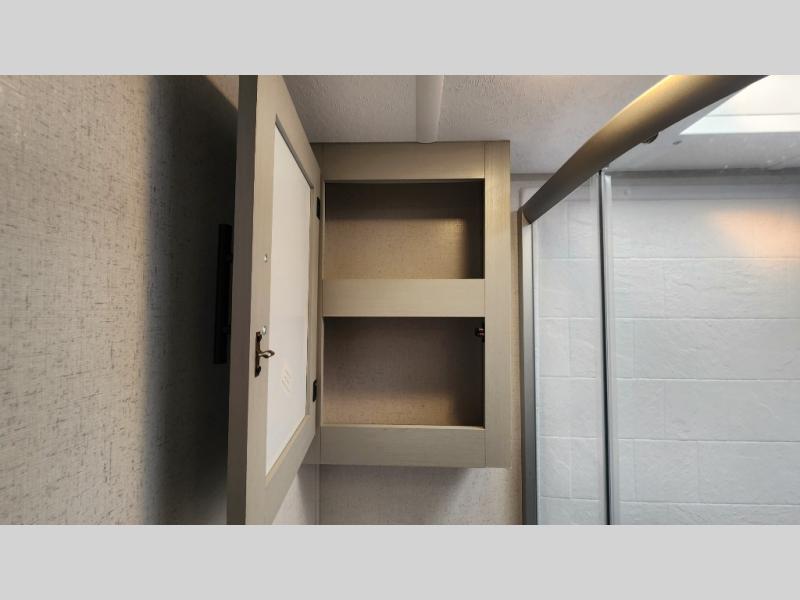 The spacious bathroom features a radius shower, toilet, and vanity, providing the perfect place to refresh after a long day outdoors. With ducted air conditioning, efficient heating, and smart storage throughout, the Salem FSX Platinum 260RTX keeps you comfortable wherever you roam.
