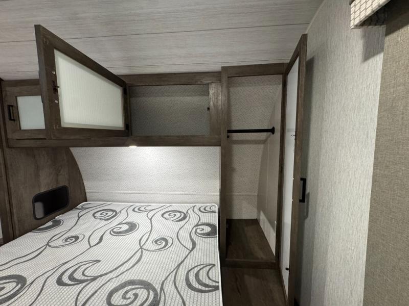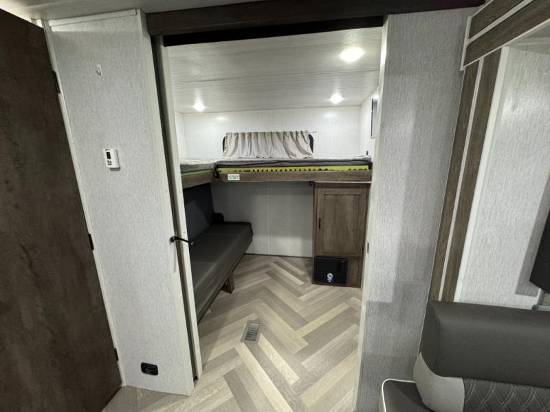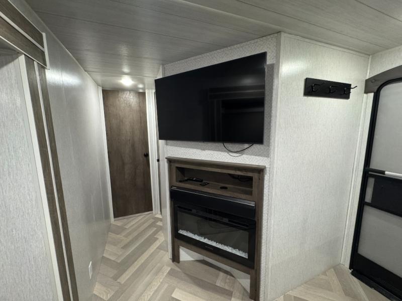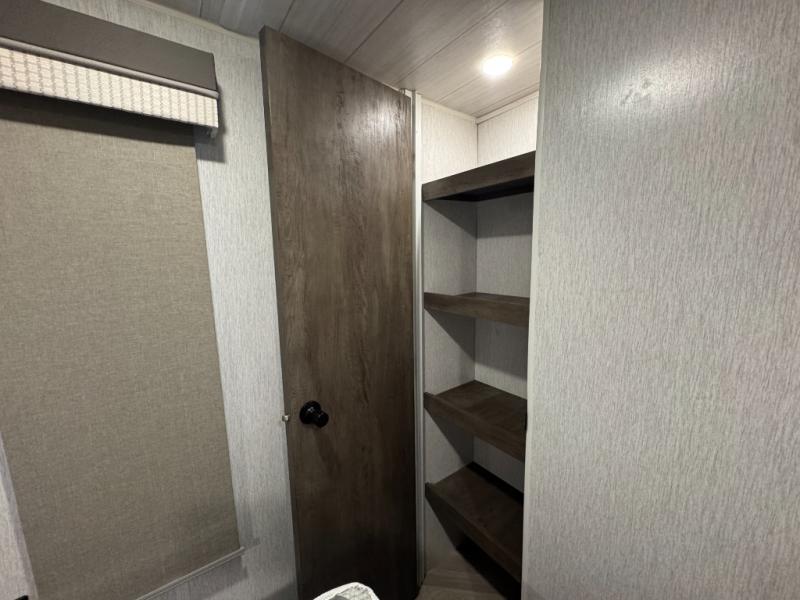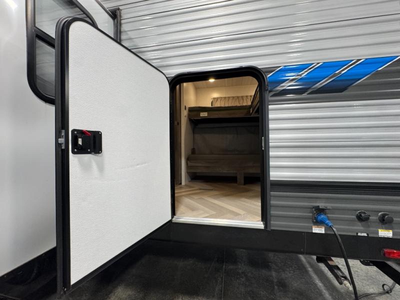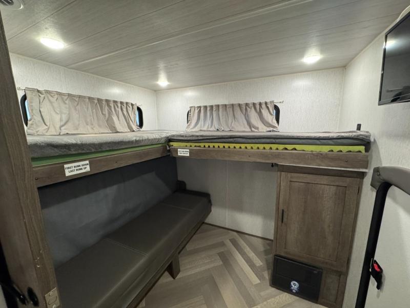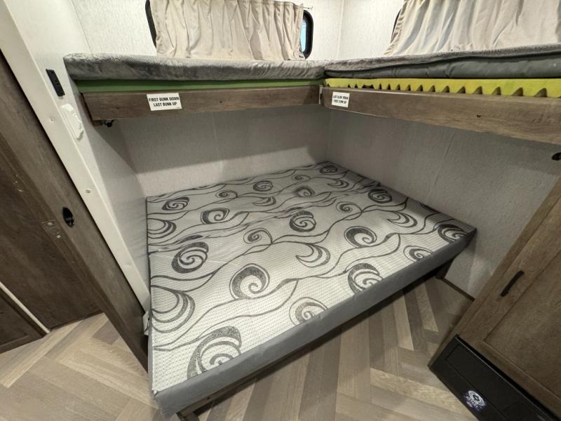 Pack your bags and have the best family vacation in this Salem travel trailer! The kiddos will have their own privacy with the rear private bunkhouse with two bunk beds above a Versa queen bed and a bike door for easy access. You will have your own privacy with the front private bedroom which has wardrobes on either side of the queen bed and a closet to store your clothes, plus a hamper to keep dirty clothes separate. Keep everyone's bellies full with the three burner cooktop, the walk-in pantry, and the countertop extension or you can breathe in some fresh air while cooking at the outside camp kitchen. The Versa U-shaped dinette and Versa lounge not only offer comfortable places to dine and relax, but also sleeping spaces when they are converted!