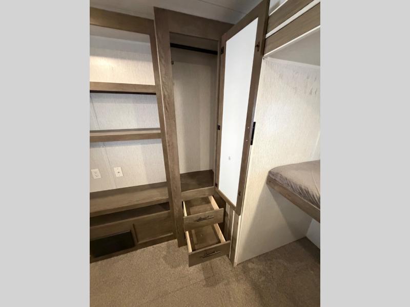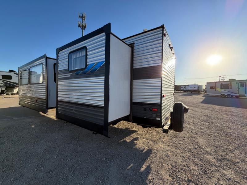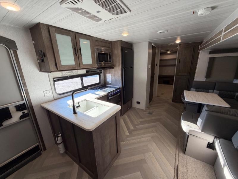 The rear private bunkhouse in this Salem travel trailer is super accommodating for your kids or your overnight guests! It has two opposing slides which provide extra floor space and a full-width closet/entertainment center which delivers extra space for backpacks and tennis shoes. The front private bedroom will be perfect for mom and dad with its queen bed and dual closets, and any additional guests can sleep on the Versa Lounge or U-shaped dinette. Everyone will enjoy their own space when it's time to freshen up in the full bath with a walk-in shower, and the chef of the group will have all the appliances needed to make meals each day. And don't forget about the outdoor kitchen for outdoor fun!