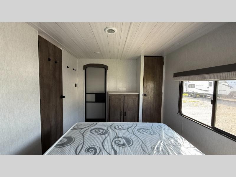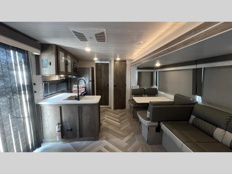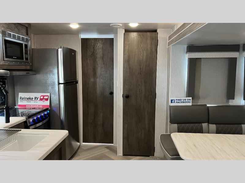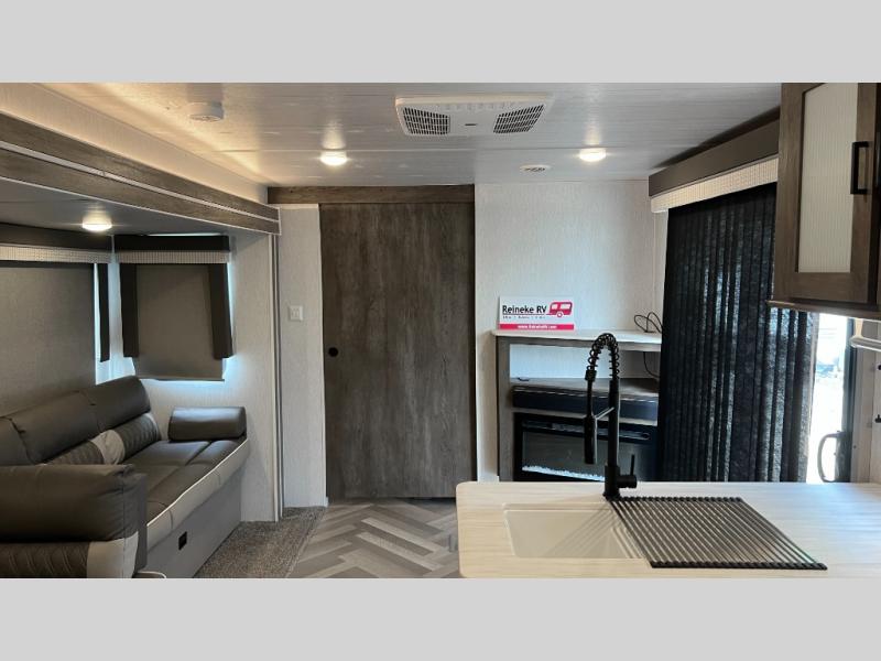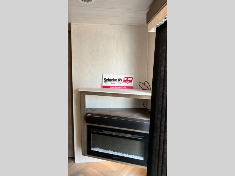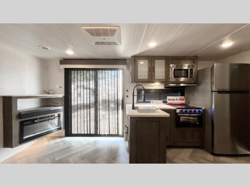 After you've had a long day of sightseeing and adventuring, you will certainly appreciate having this Salem travel trailer to come back to! If you aren't ready to stay indoors for the night, you can keep the party going outside under the 18' awning, and if you need any extra lawn chairs, you can grab them from the pass-through storage compartment. And, you don't have to stop enjoying a good fire just because you have to go inside because the interior fireplace will provide great ambiance. There are dual entry doors which will definitely come in handy when camping with a large group, and there is plenty of seating space on the booth dinette and versa lounge in the main living area.
