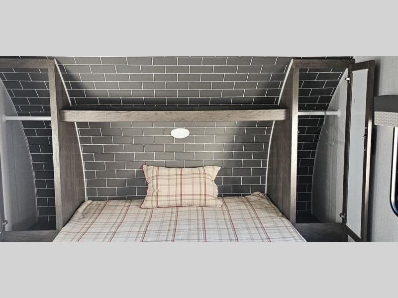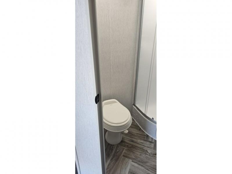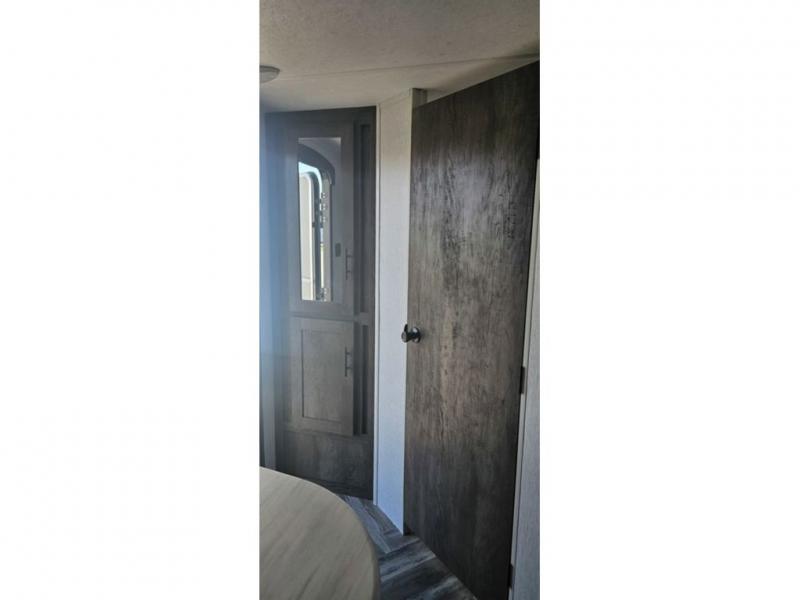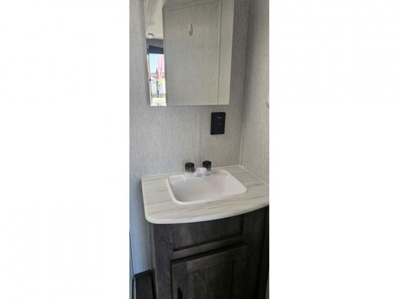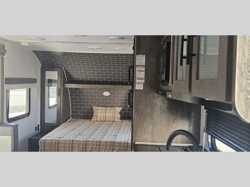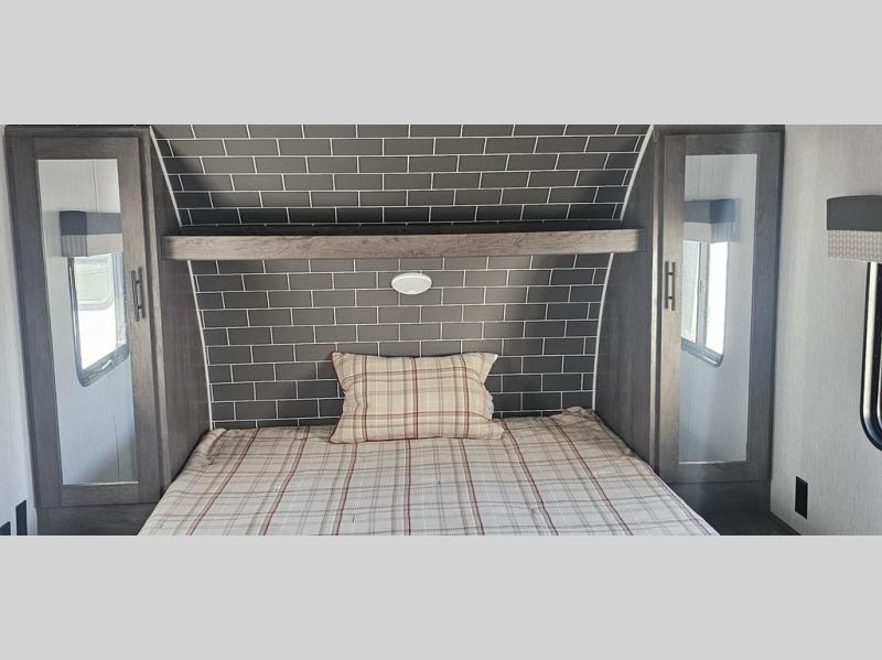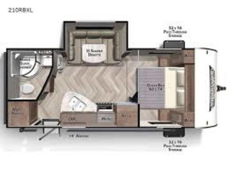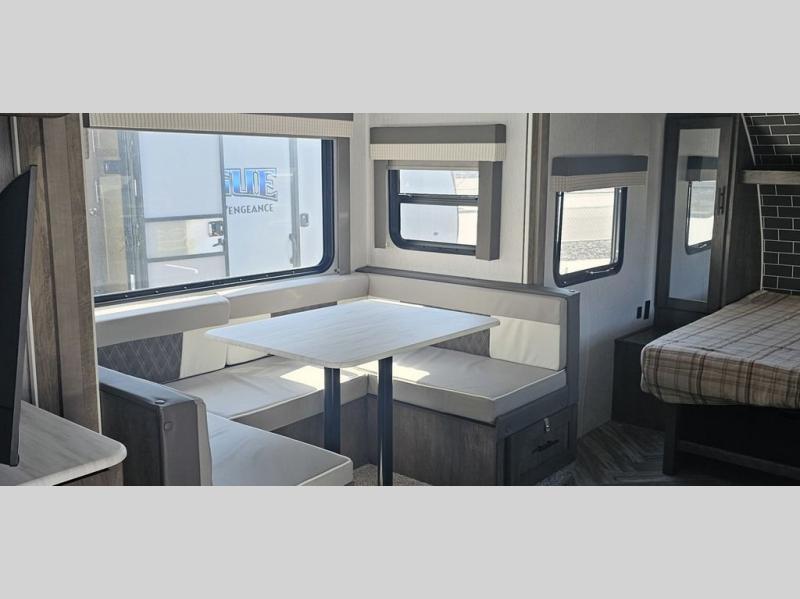 Pick your favorite campsite and load up this travel trailer for a fun weekend getaway! There is a wardrobe/pantry big enough to store your favorite snacks and a three burner cooktop for you to create delicious home cooked meals. The U-shaped dinette slide is not only great for enjoying your meals at or playing card games, but also for transforming into an extra sleeping space. The rear corner bathroom has everything you will need to end each night feeling squeaky clean including a radius glass shower. The front RV queen bed welcomes you to enjoy a good night's rest in privacy when you draw the privacy curtain and wardrobes to keep your clothes looking their best!