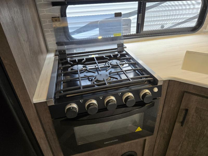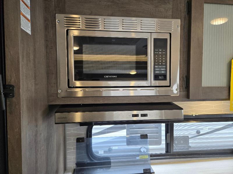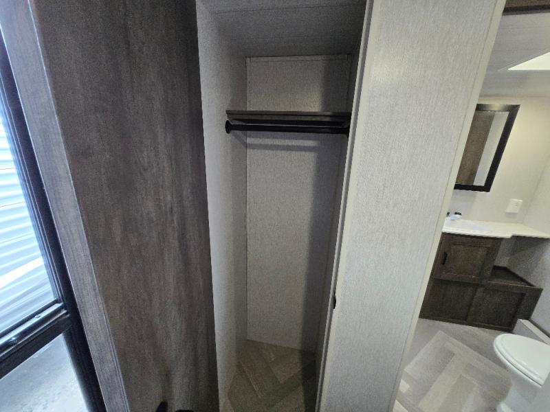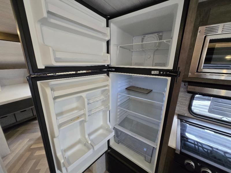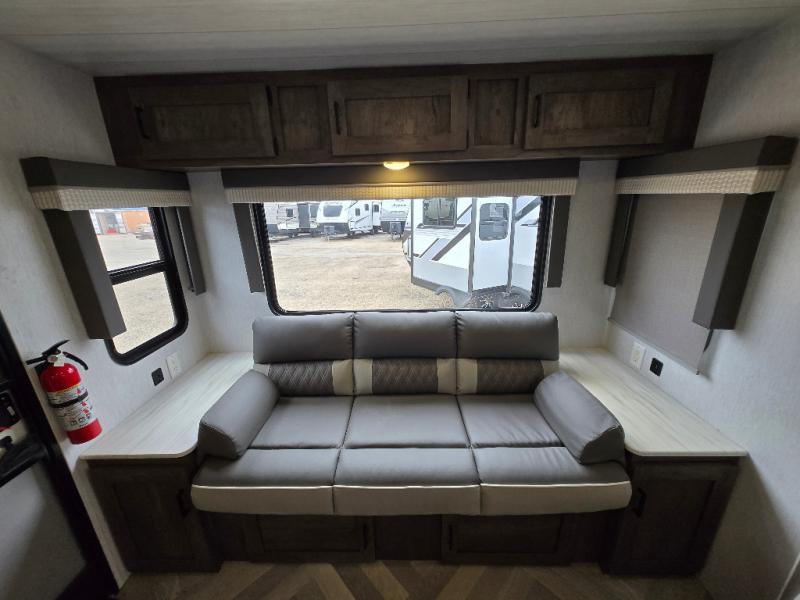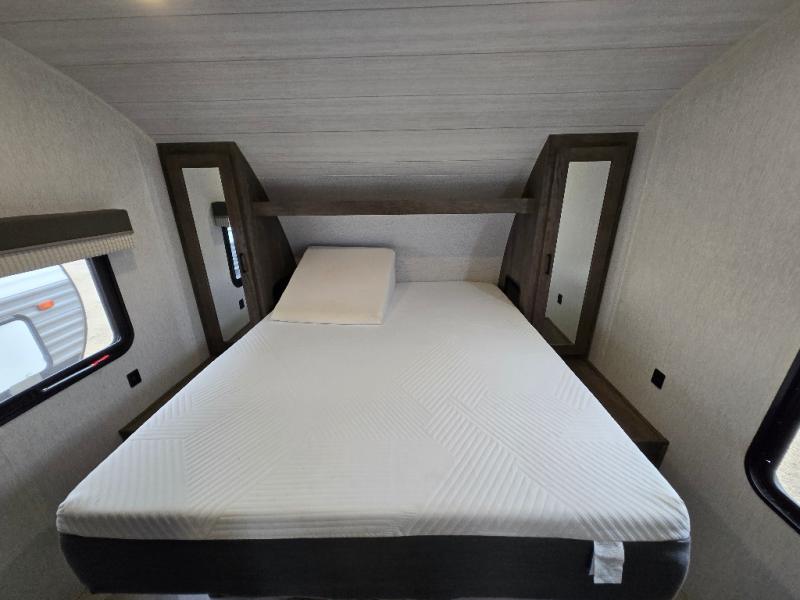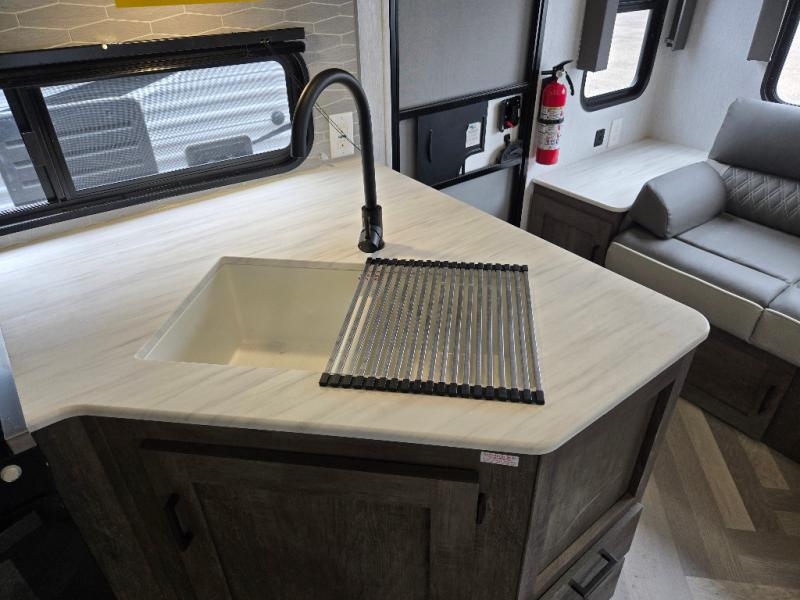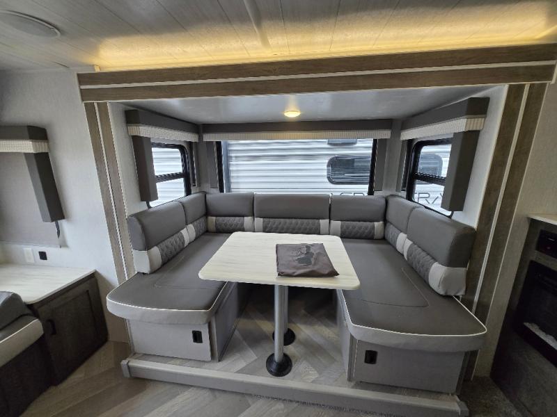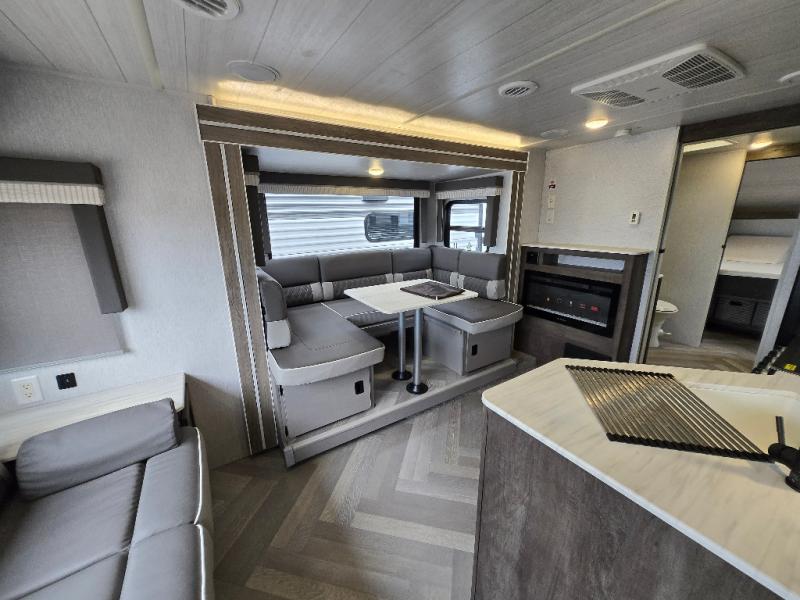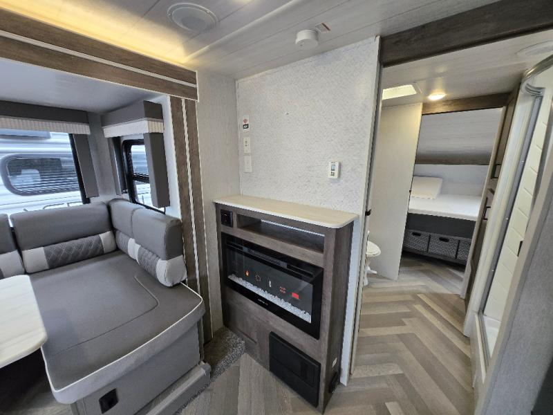 This travel trailer is packed full of features, but is still lightweight coming in at just over 5,000 lbs.! You will feel right at home in the front master bedroom with a queen bed that has closets on either side, CPAP storage, and a walk-in closet to keep your clothes looking their best. The walk-through bathroom has a walk-in shower with fiberglass surround and a skylight above for added natural lighting as you get ready. The U-shaped dinette slide has a panoramic window for you to enjoy your beautiful scenery as you eat dinner, and there is a fireplace at the entertainment center for a relaxing evening indoors. There is a pass-through storage area to store your outdoor camping gear, and a 16' power awning and exterior speakers to crank up the tunes!