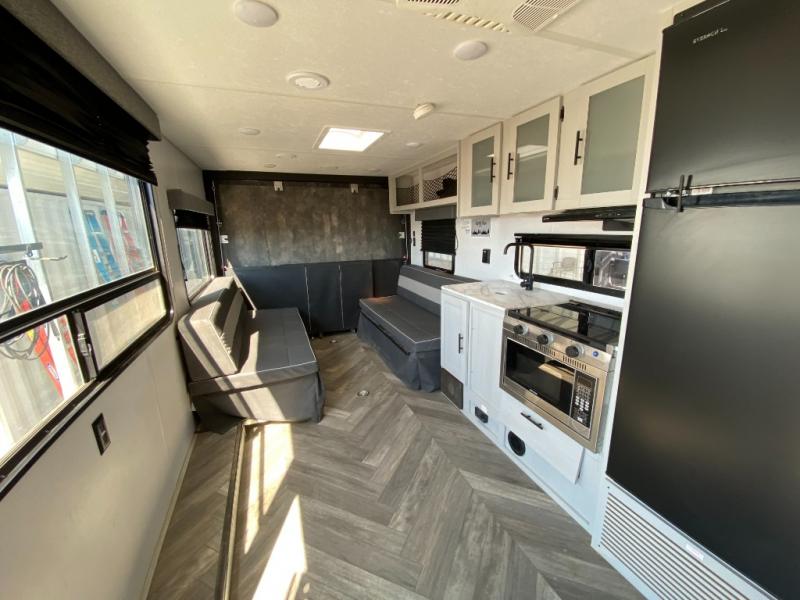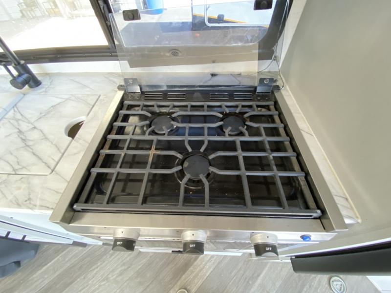 You're going to love camping with the family in this toy hauler! It features a front private bedroom with a queen bed that has wardrobes on either side to keep your clothes looking nice. It also has an entrance into the walk-through bathroom which has a neo-angled shower and a wardrobe to store your towels close by. After you have prepared a delicious home cooked meal with the three burner cooktop, you can head to the rear flip out sofas with a 30" x 70" free standing table in between to enjoy your meals at. The rear 88" x 75" ramp door makes it easy to load and unload your toys, and the pass-through storage area is big enough to store your outdoor camping gear!
