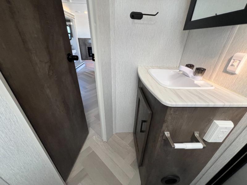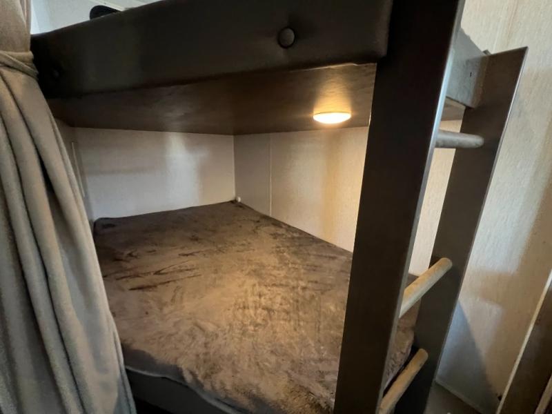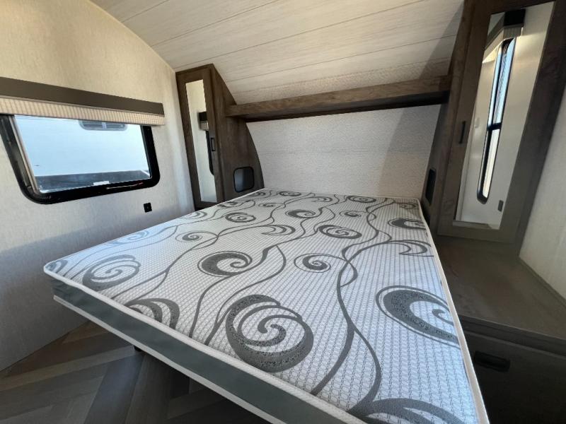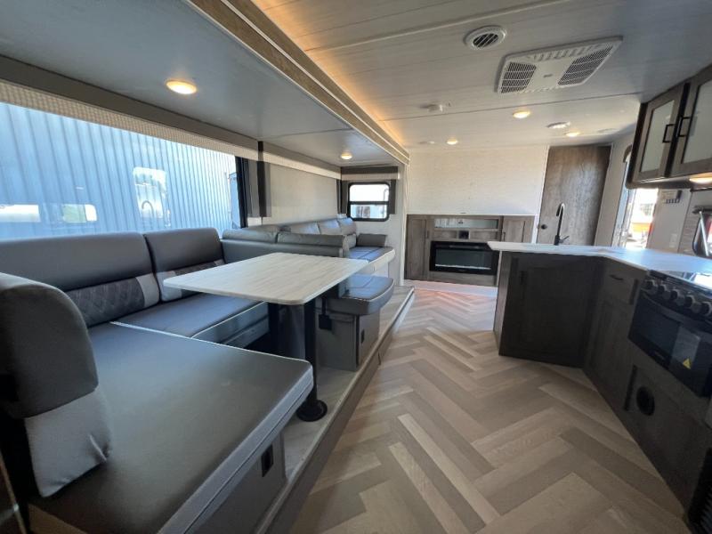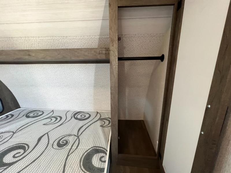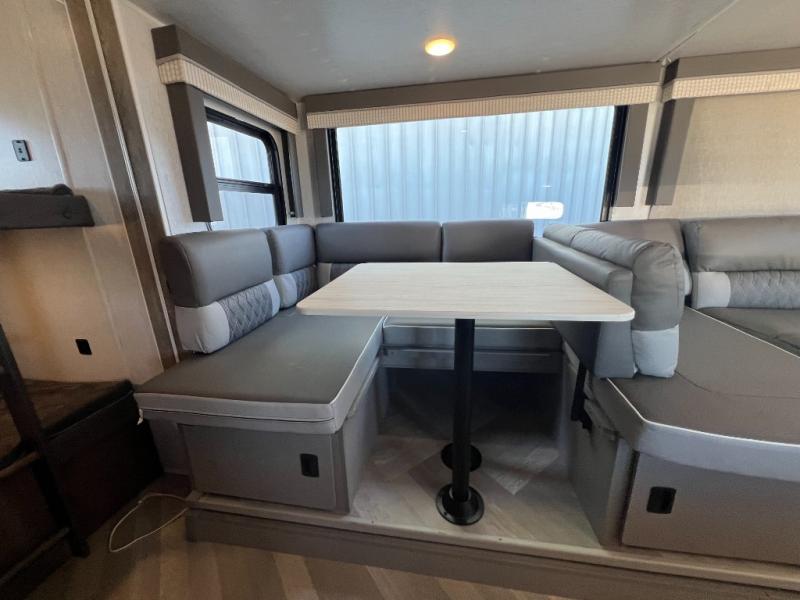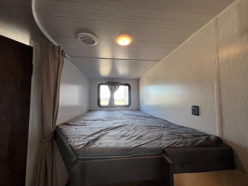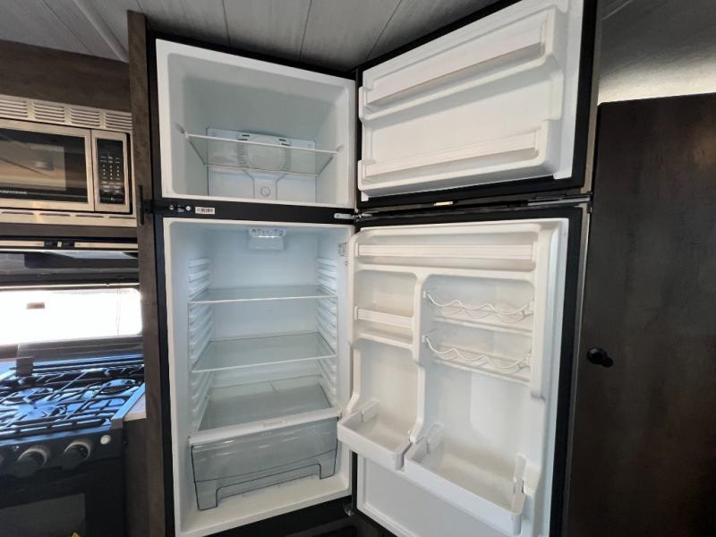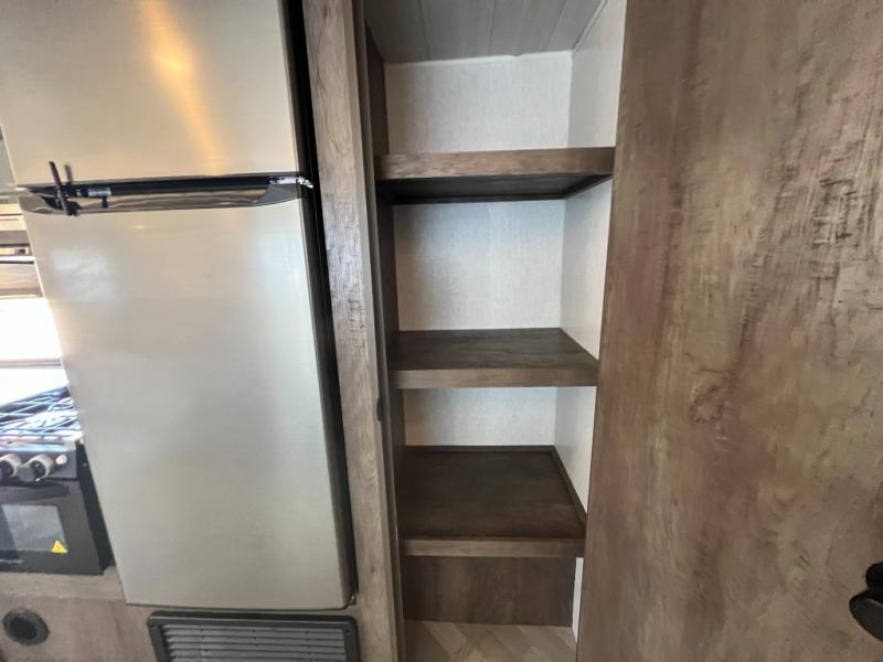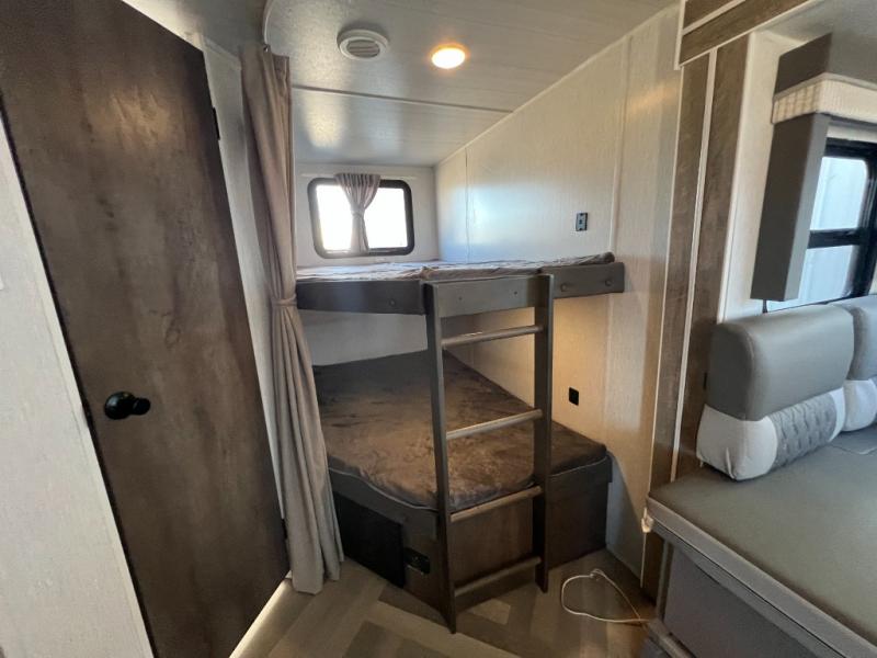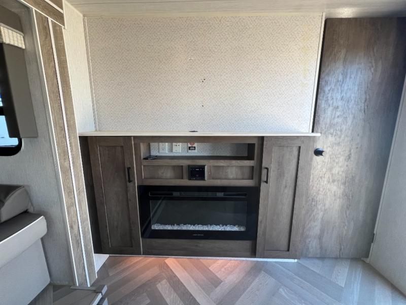 Step inside this dual entry travel trailer and see just how fun your next camping trip will be! The rear corner bathroom has a tub/shower for you to start each morning feeling clean and fresh, and it even has an entrance/exit door to the unit so you can get back outside faster. The kids will love sleeping on the corner bunk beds and you will love having your own privacy with the front private bedroom. The sofa is next to the entertainment center with a fireplace for a relaxing evening indoors, and the U-shaped dinette is ready for you to enjoy a meal, play a card game or transform into an extra sleeping space. Everyone can store their favorite snacks and drinks either inside the walk-in pantry or in the 6 cu. ft. gas/electric refrigerator.