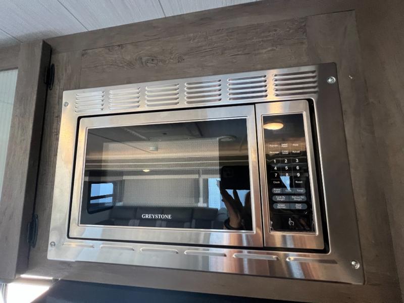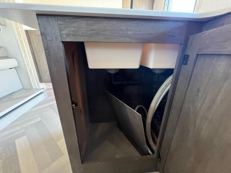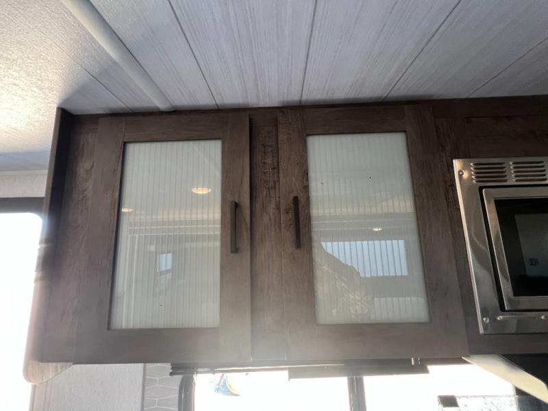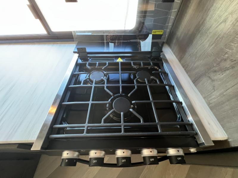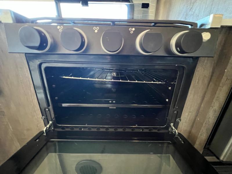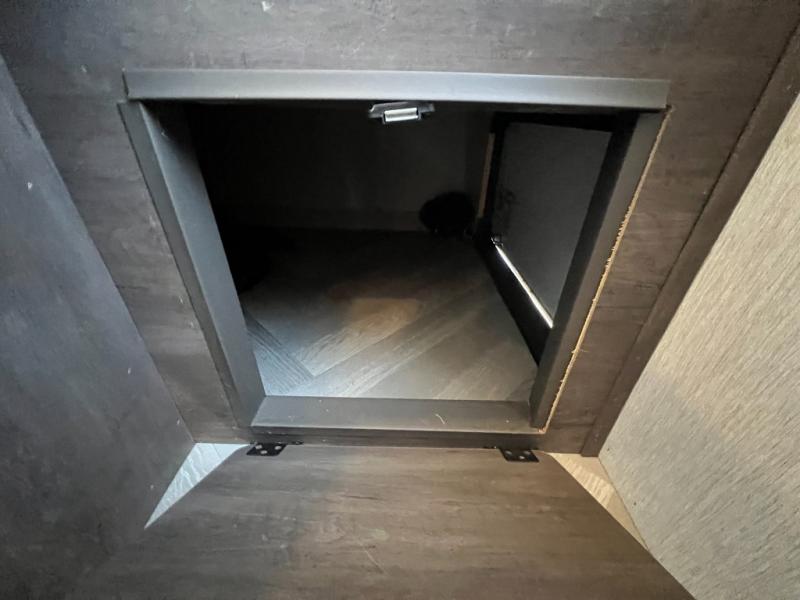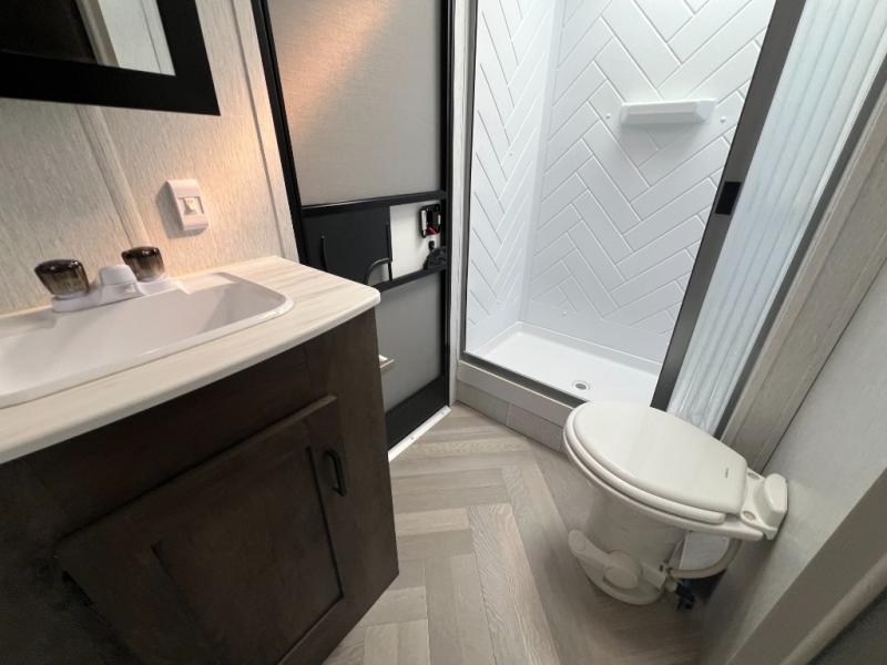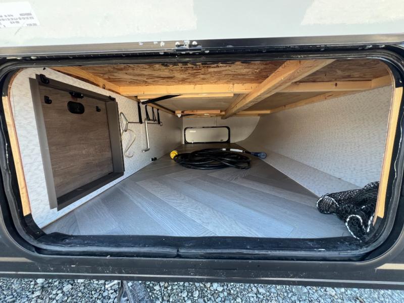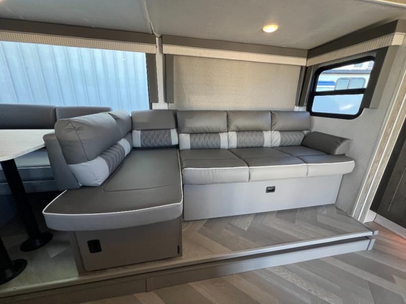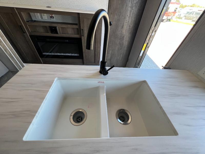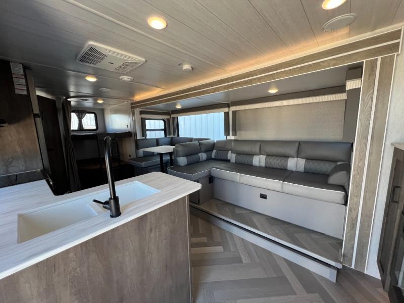 Step inside this dual entry travel trailer and see just how fun your next camping trip will be! The rear corner bathroom has a tub/shower for you to start each morning feeling clean and fresh, and it even has an entrance/exit door to the unit so you can get back outside faster. The kids will love sleeping on the corner bunk beds and you will love having your own privacy with the front private bedroom. The sofa is next to the entertainment center with a fireplace for a relaxing evening indoors, and the U-shaped dinette is ready for you to enjoy a meal, play a card game or transform into an extra sleeping space. Everyone can store their favorite snacks and drinks either inside the walk-in pantry or in the 6 cu. ft. gas/electric refrigerator.