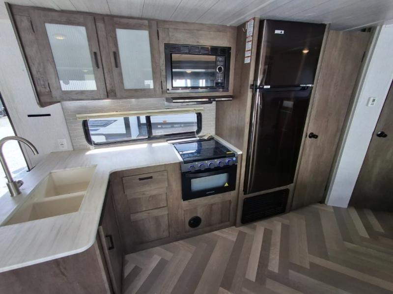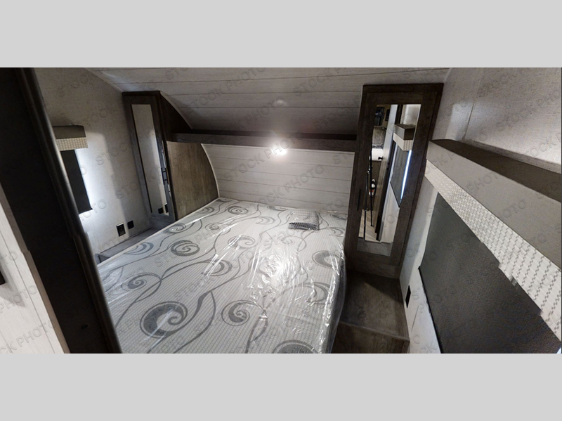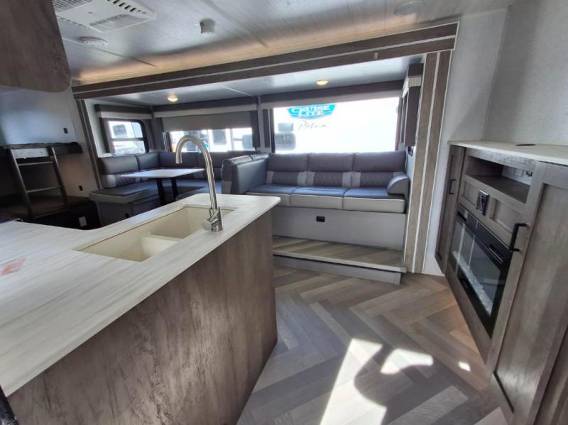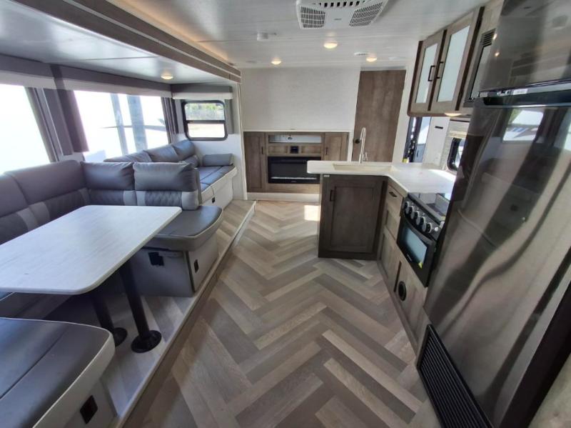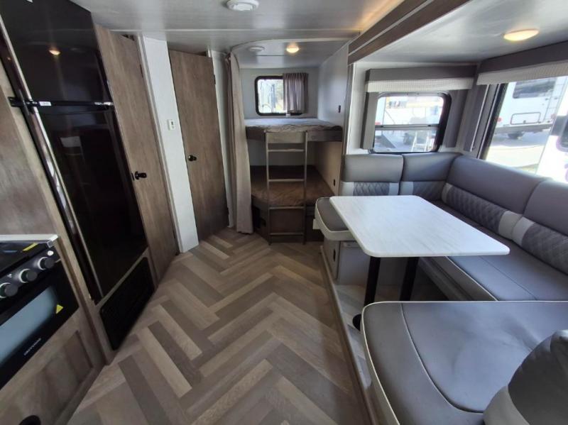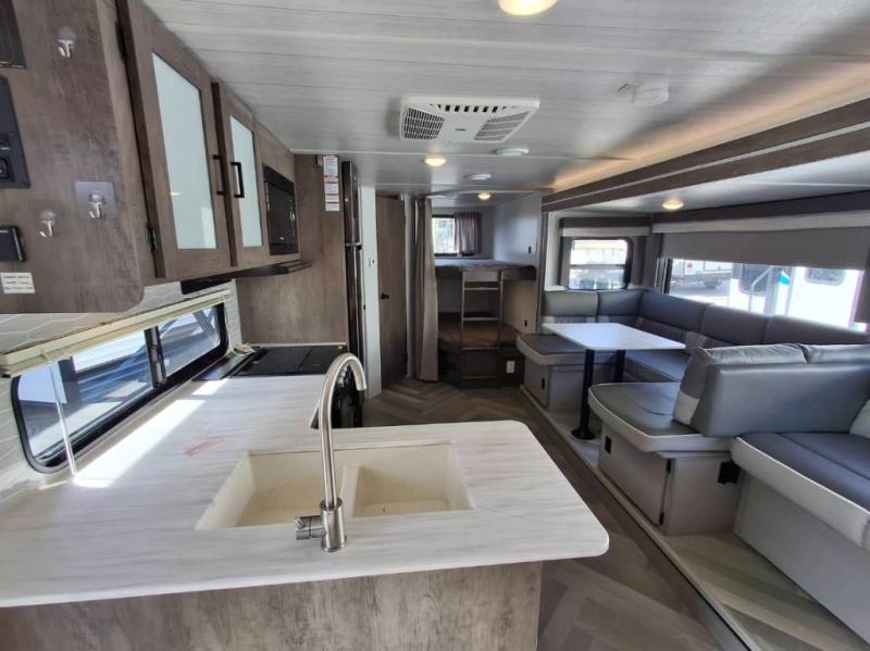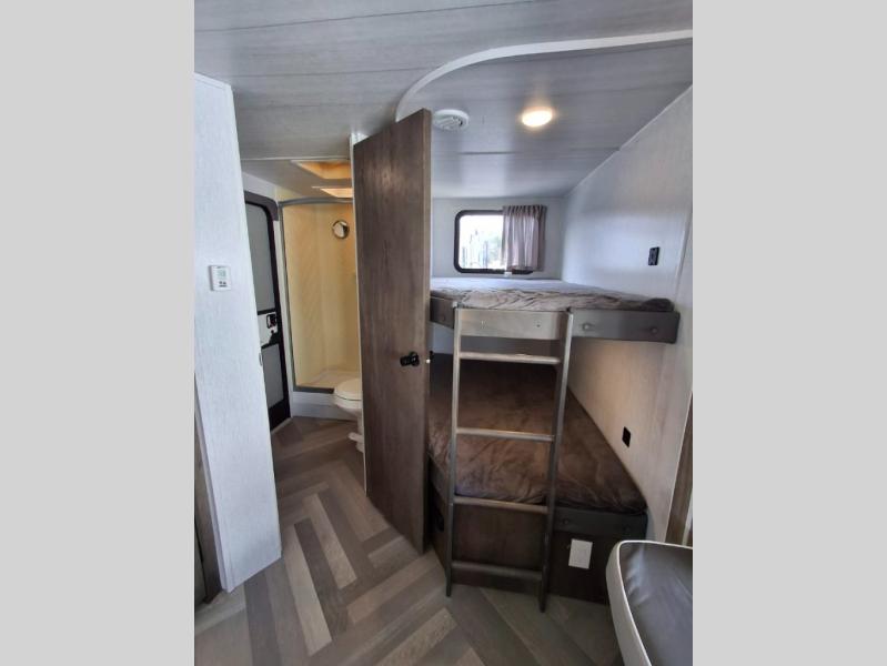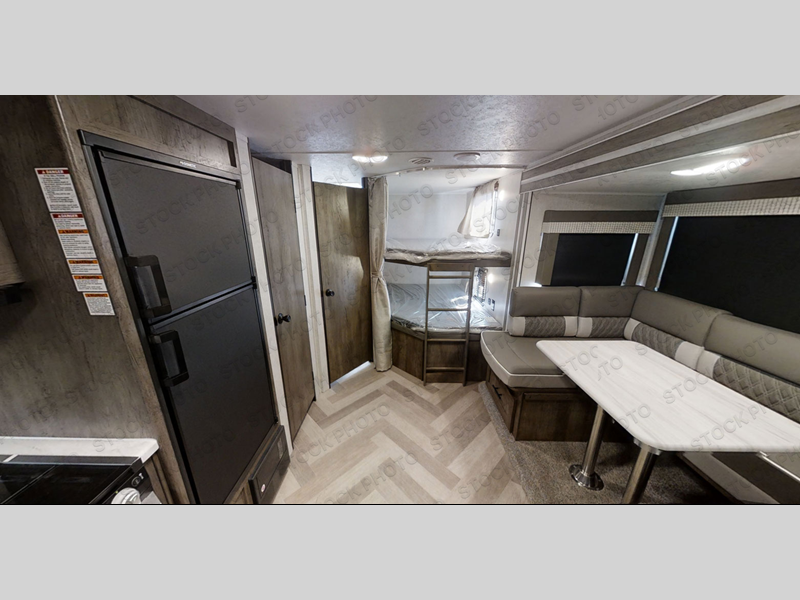 Step inside this dual entry travel trailer and see just how fun your next camping trip will be! The rear corner bathroom has a tub/shower for you to start each morning feeling clean and fresh, and it even has an entrance/exit door to the unit so you can get back outside faster. The kids will love sleeping on the corner bunk beds and you will love having your own privacy with the front private bedroom. The sofa is next to the entertainment center with a fireplace for a relaxing evening indoors, and the U-shaped dinette is ready for you to enjoy a meal, play a card game or transform into an extra sleeping space. Everyone can store their favorite snacks and drinks either inside the walk-in pantry or in the 6 cu. ft. gas/electric refrigerator.