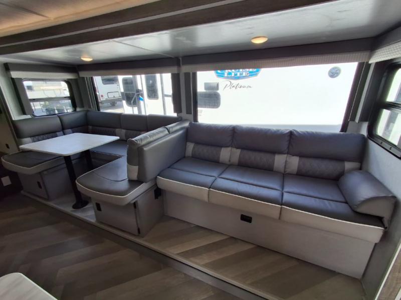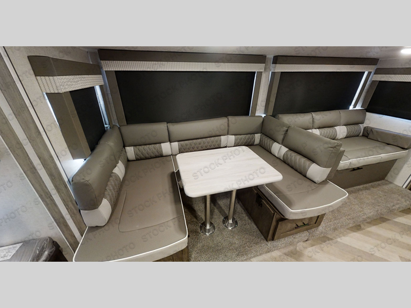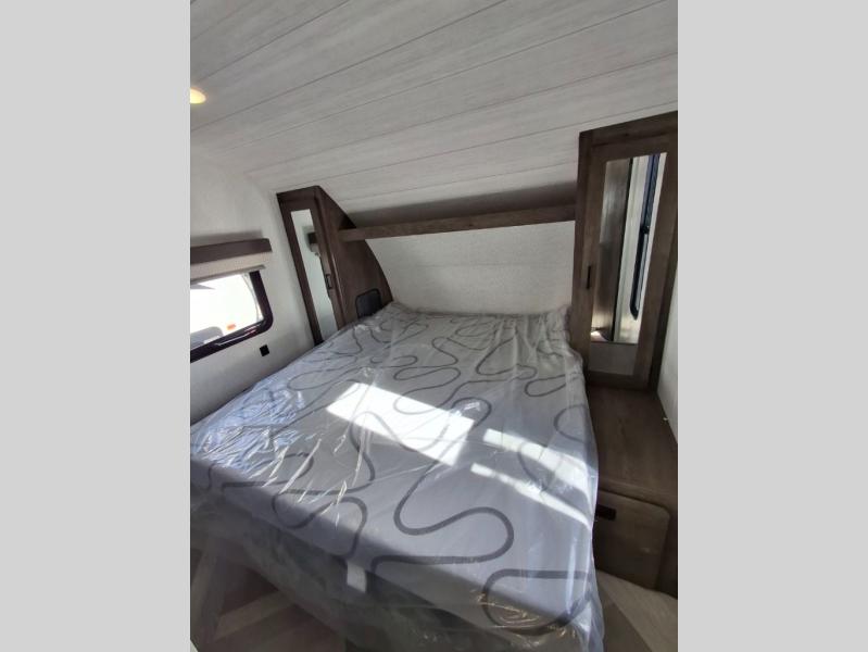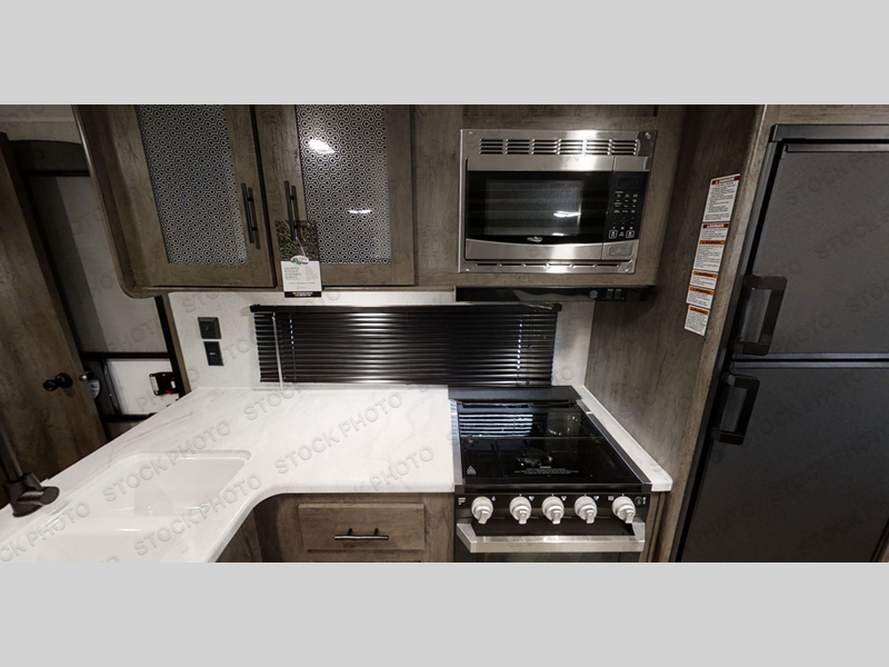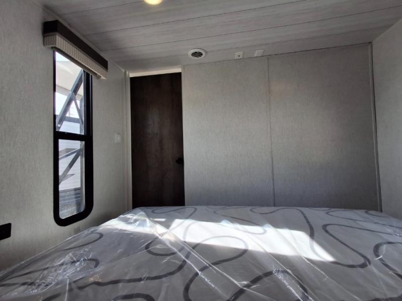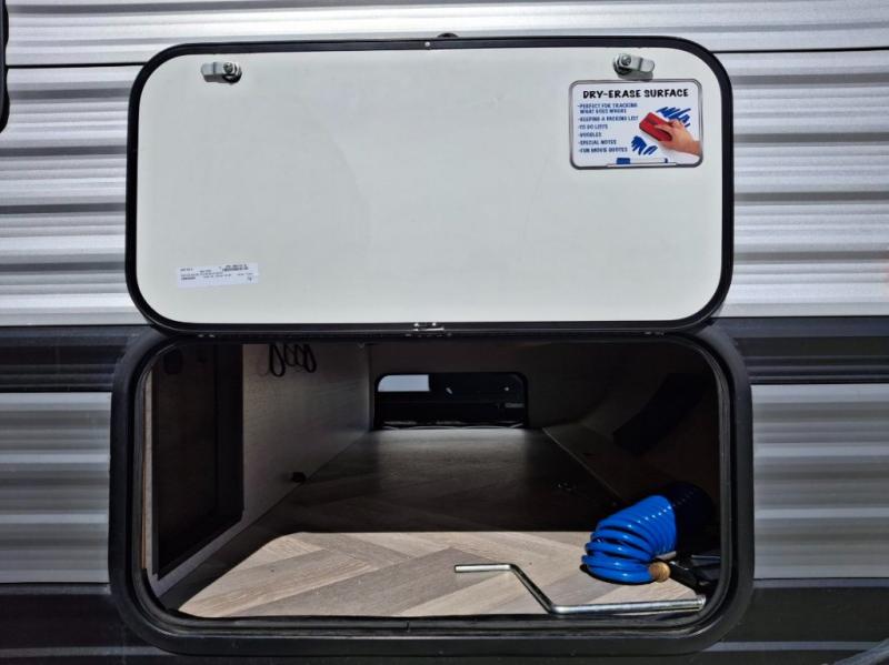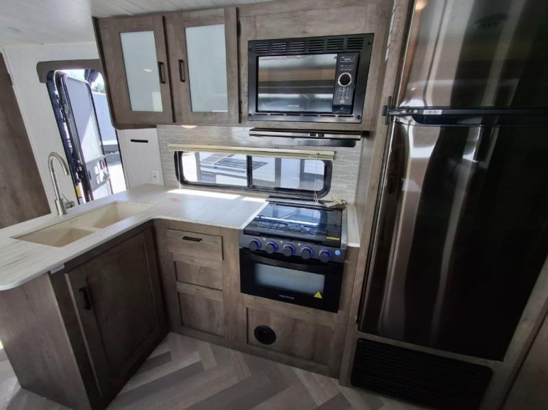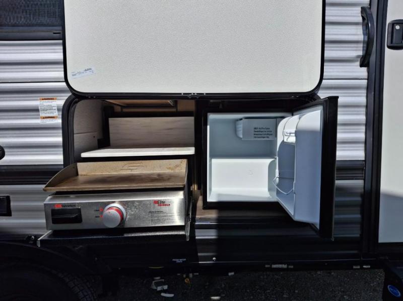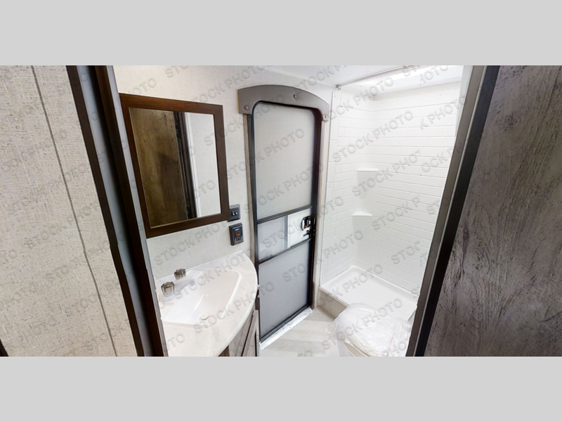 Step inside this dual entry travel trailer and see just how fun your next camping trip will be! The rear corner bathroom has a tub/shower for you to start each morning feeling clean and fresh, and it even has an entrance/exit door to the unit so you can get back outside faster. The kids will love sleeping on the corner bunk beds and you will love having your own privacy with the front private bedroom. The sofa is next to the entertainment center with a fireplace for a relaxing evening indoors, and the U-shaped dinette is ready for you to enjoy a meal, play a card game or transform into an extra sleeping space. Everyone can store their favorite snacks and drinks either inside the walk-in pantry or in the 6 cu. ft. gas/electric refrigerator.
