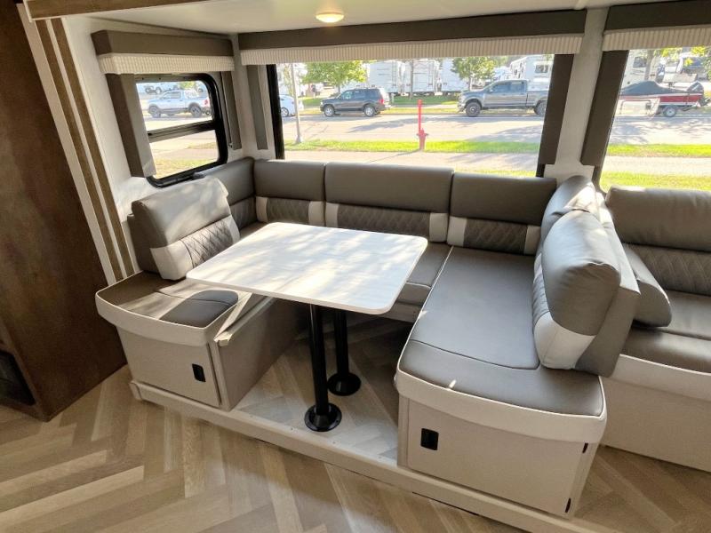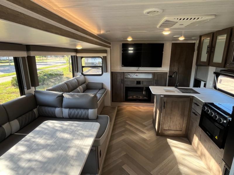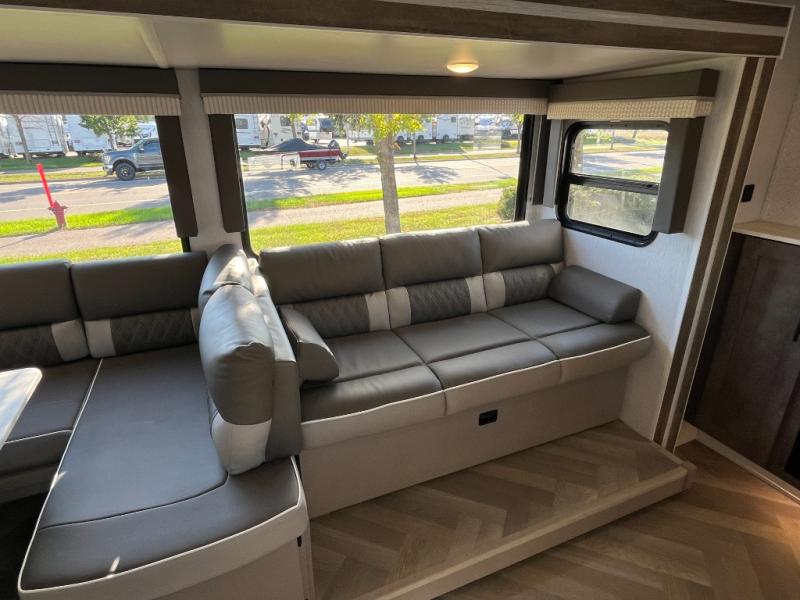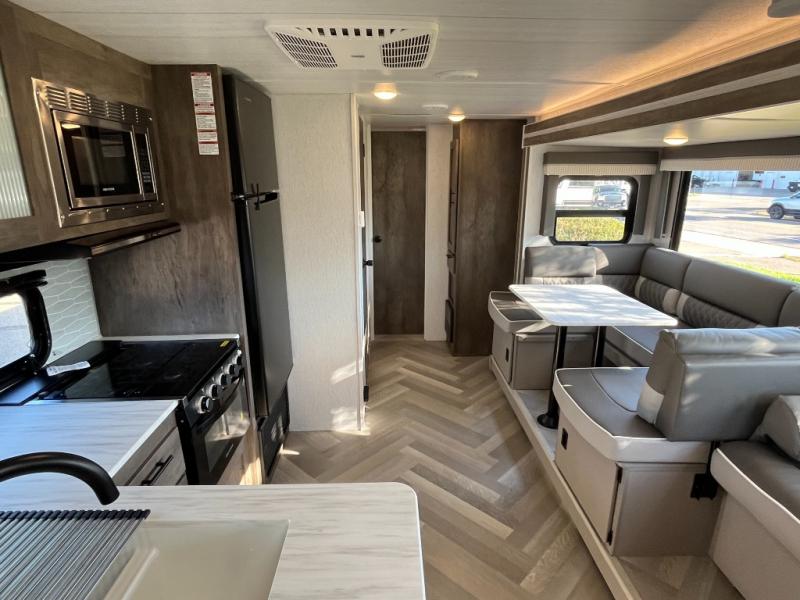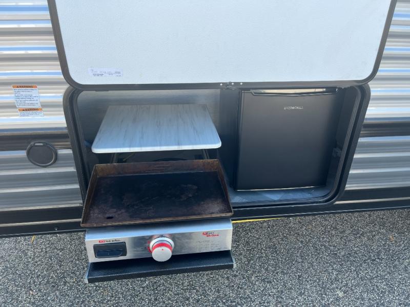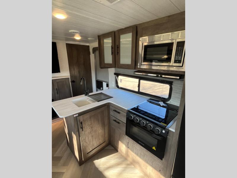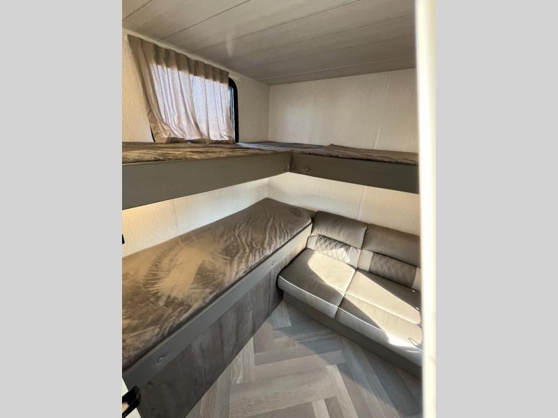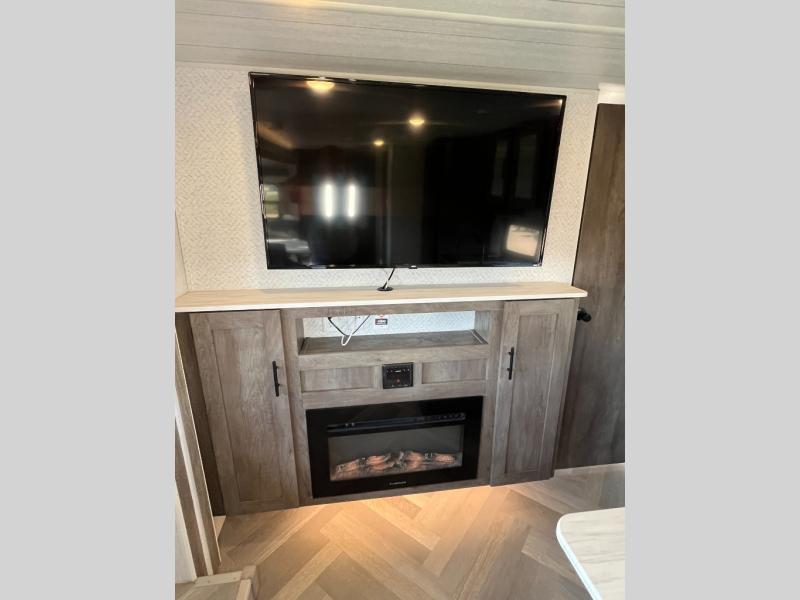 This versatile bunkhouse travel trailer is big enough for the whole family, but still light in weight by weighing in at 6,000 lbs.! The private bunkhouse has a set of 30" x 74" bunk beds and a 30" x 74" bunk bed above a Jiffy sofa. Just outside the bunkhouse is a pantry big enough to store everyone's favorite snacks, and the full bathroom with a walk-in shower. The three burner cooktop is just waiting for you to create a delicious meal, and the U-shaped dinette welcomes you to enjoy your meal in comfort, plus there is a large panoramic window for you to look out at your beautiful scenery. After you have stuffed yourself full, you can head to the Versa-lounge and relax by the fireplace at the entertainment center. The exterior has a pass-through storage area for you to keep your outdoor camping gear, a 16' power awning to protect you, and an exterior camp kitchen!