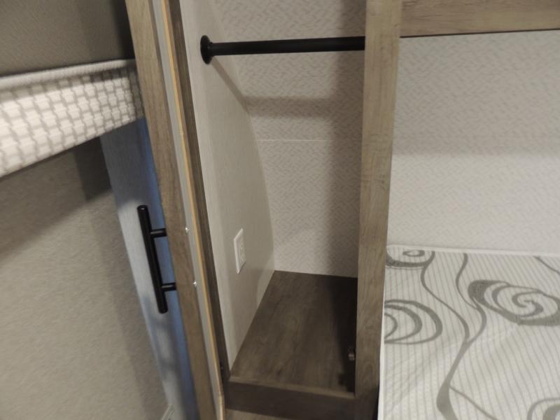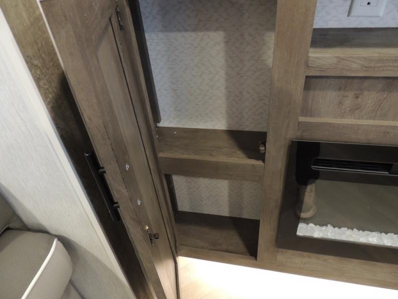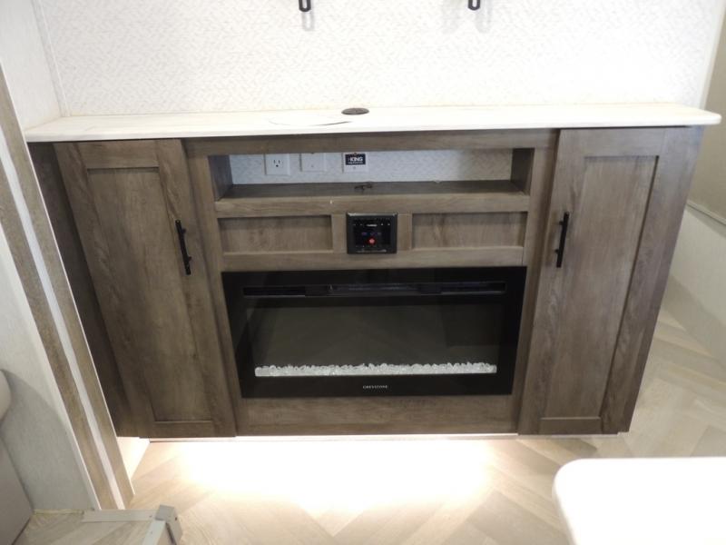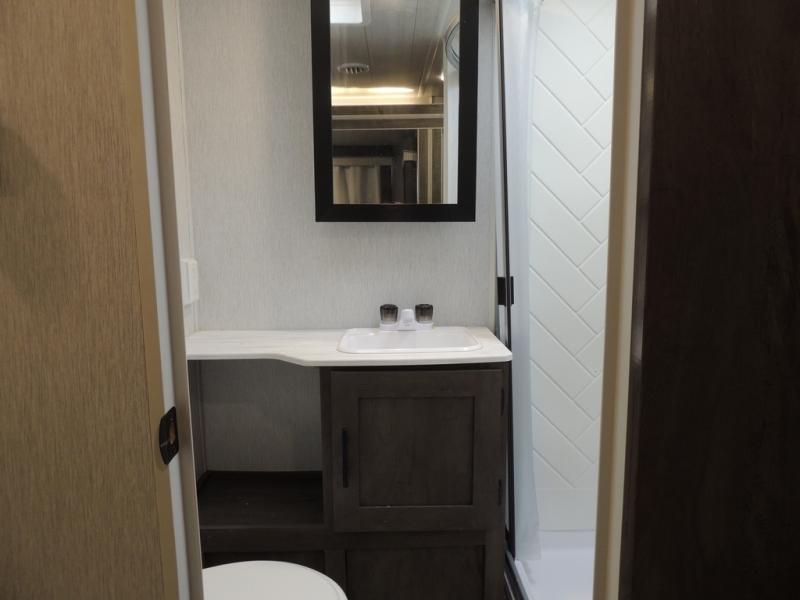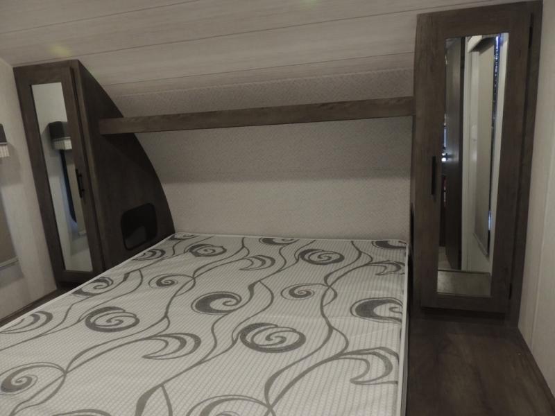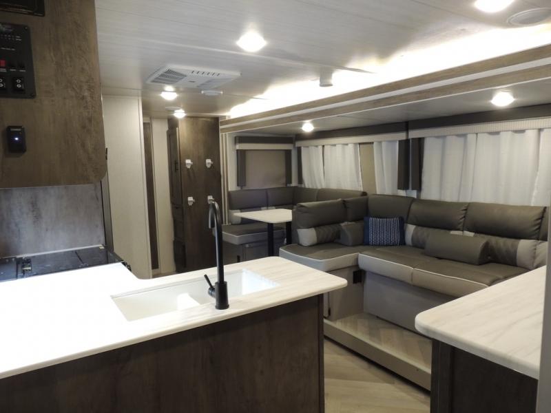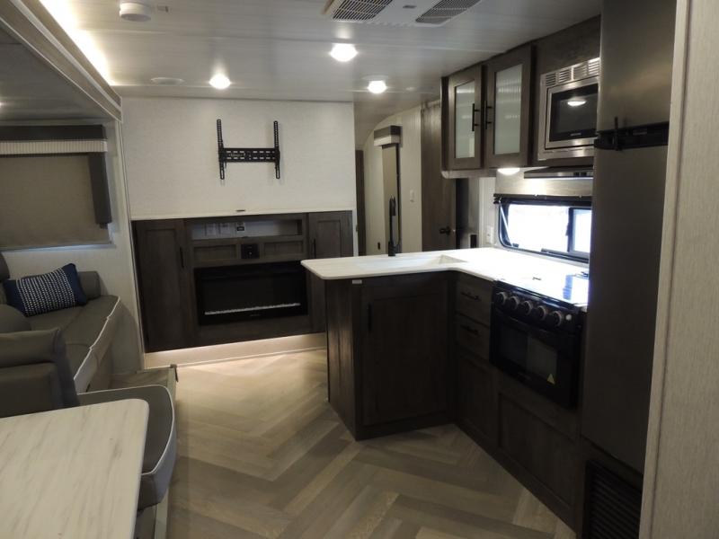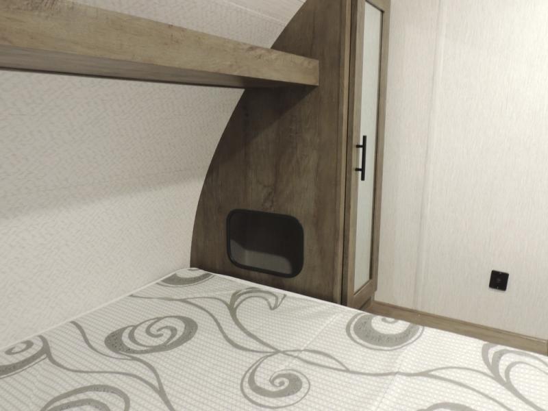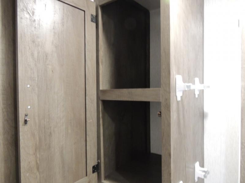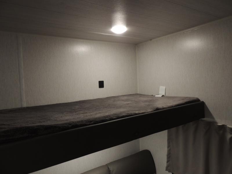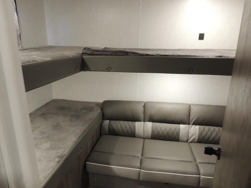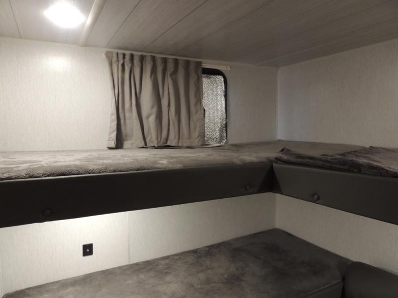 This versatile bunkhouse travel trailer is big enough for the whole family, but still light in weight by weighing in at 6,000 lbs.! The private bunkhouse has a set of 30" x 74" bunk beds and a 30" x 74" bunk bed above a Jiffy sofa. Just outside the bunkhouse is a pantry big enough to store everyone's favorite snacks, and the full bathroom with a walk-in shower. The three burner cooktop is just waiting for you to create a delicious meal, and the U-shaped dinette welcomes you to enjoy your meal in comfort, plus there is a large panoramic window for you to look out at your beautiful scenery. After you have stuffed yourself full, you can head to the Versa-lounge and relax by the fireplace at the entertainment center. The exterior has a pass-through storage area for you to keep your outdoor camping gear, a 16' power awning to protect you, and an exterior camp kitchen!