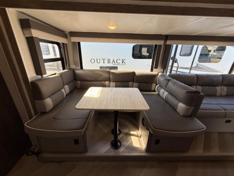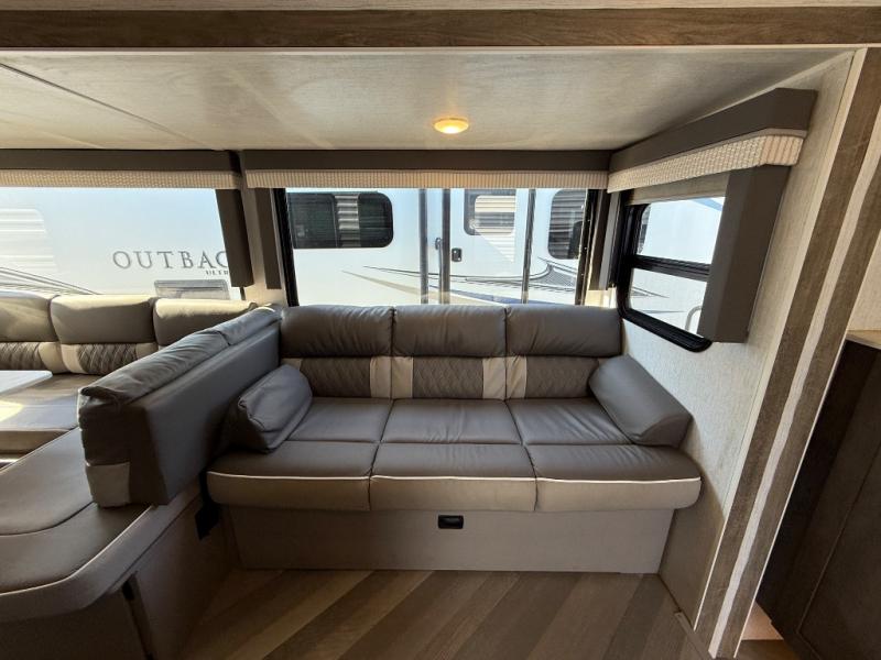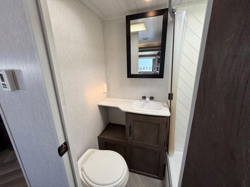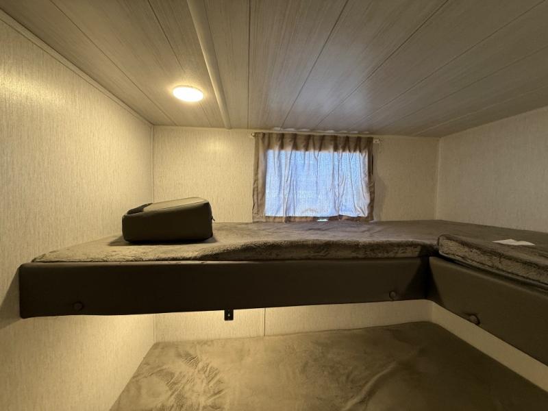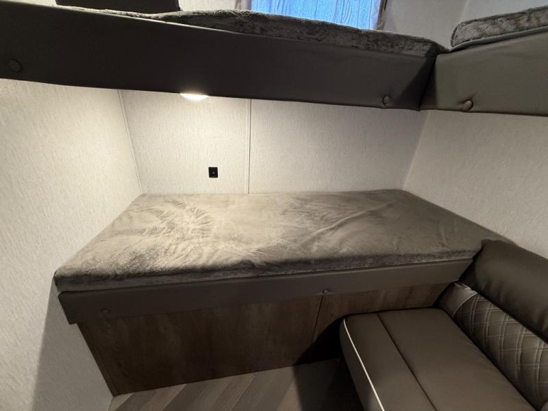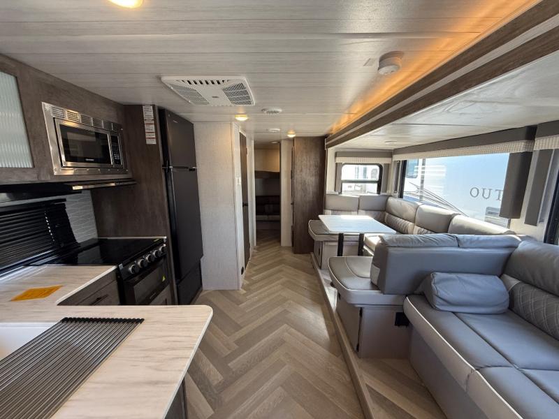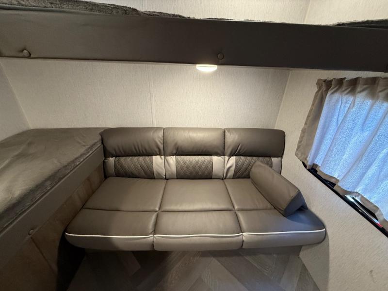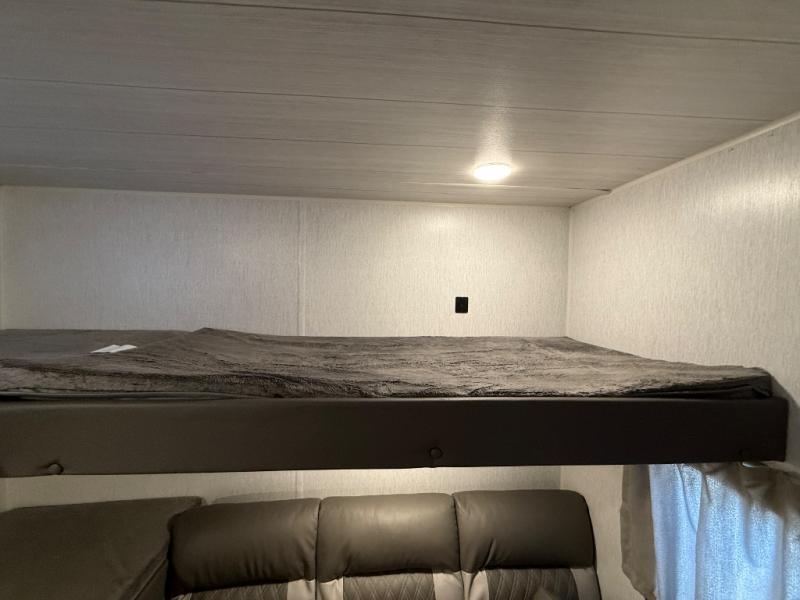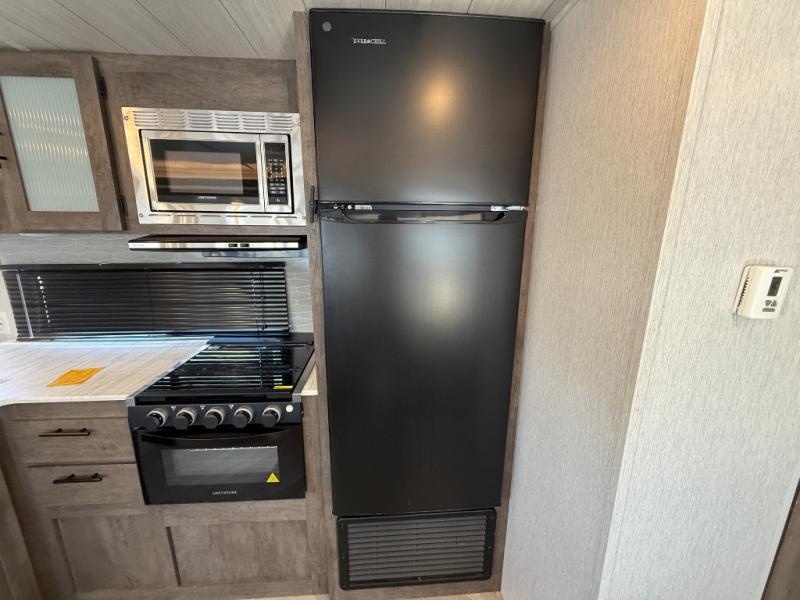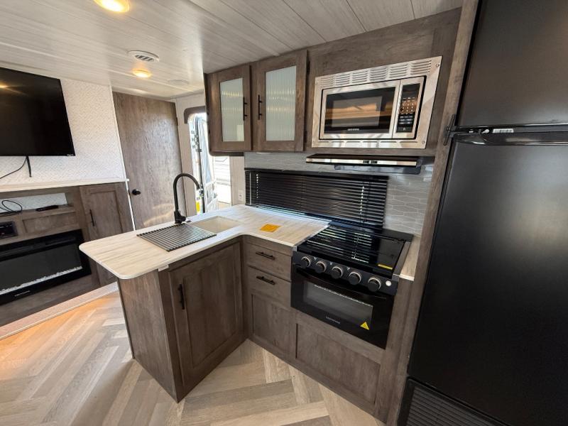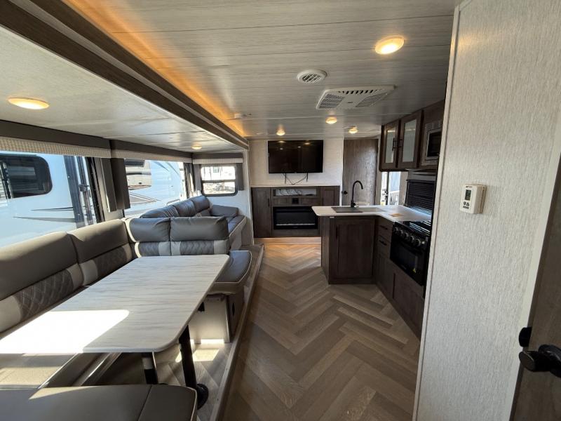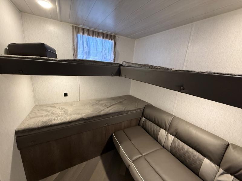 The kids can bring an extra guest or two with this travel trailer! It features a rear private bunkhouse with a set of bunk beds and a bunk above a Jiffy sofa. Just outside the bunkhouse is a pantry big enough to store your canned goods and a full bathroom with a tub/shower to rinse off your fun-filled day. The kitchen is just waiting for you to create a delicious home cooked meal with a three burner cooktop and a 6cu. ft. gas/electric refrigerator to store any leftovers in after eating at the U-shaped dinette. The dinette and sofa slide have large panoramic windows for you to look out at your beautiful scenery, plus there is an entertainment center with a fireplace. There is a pass-through storage area to hold all of your outdoor camping gear, a 16' power awning to protect you, and you can choose to add the optional exterior camp kitchen for breakfast outdoors!