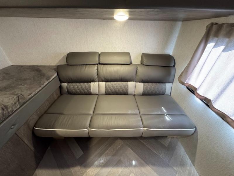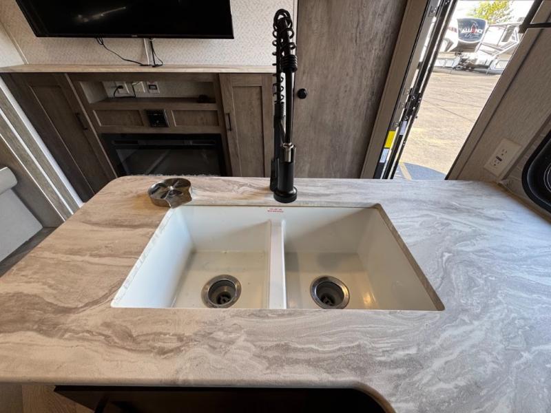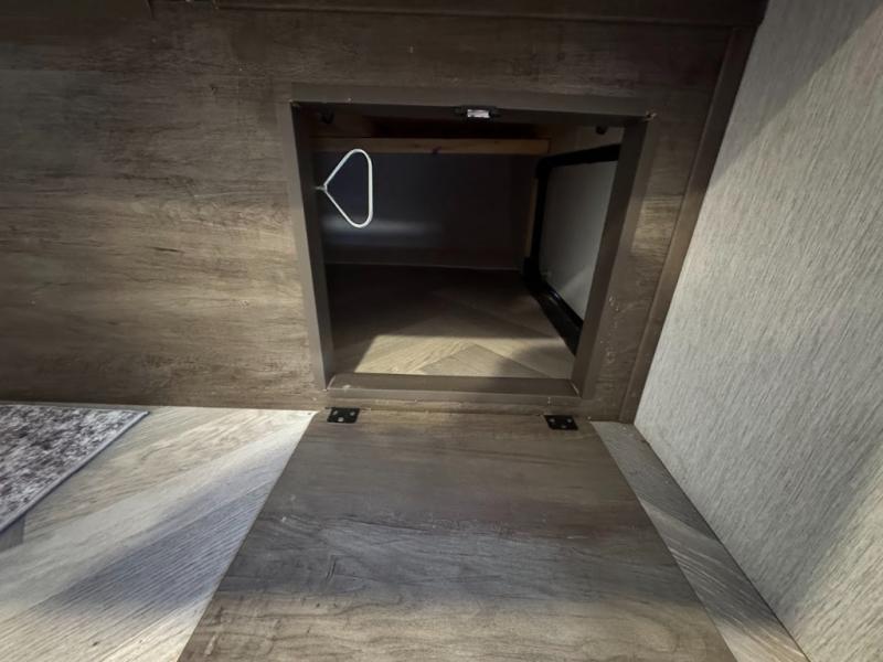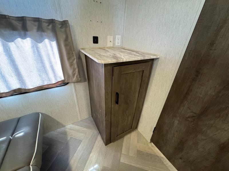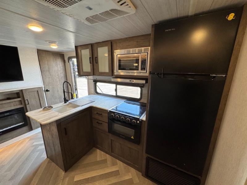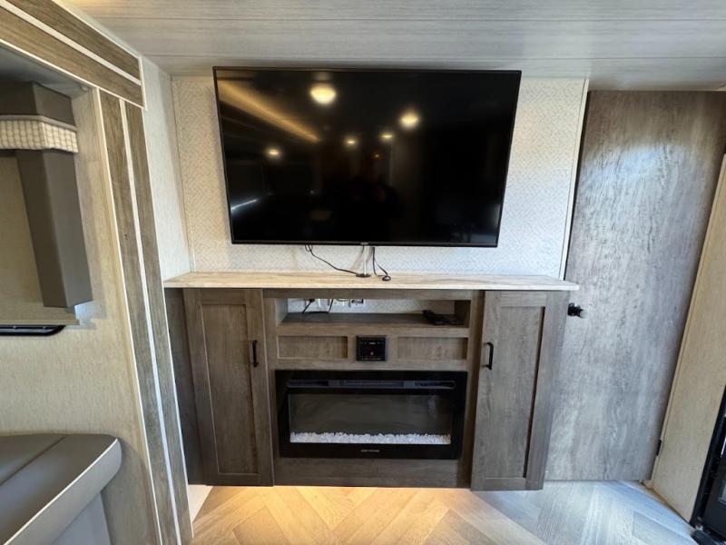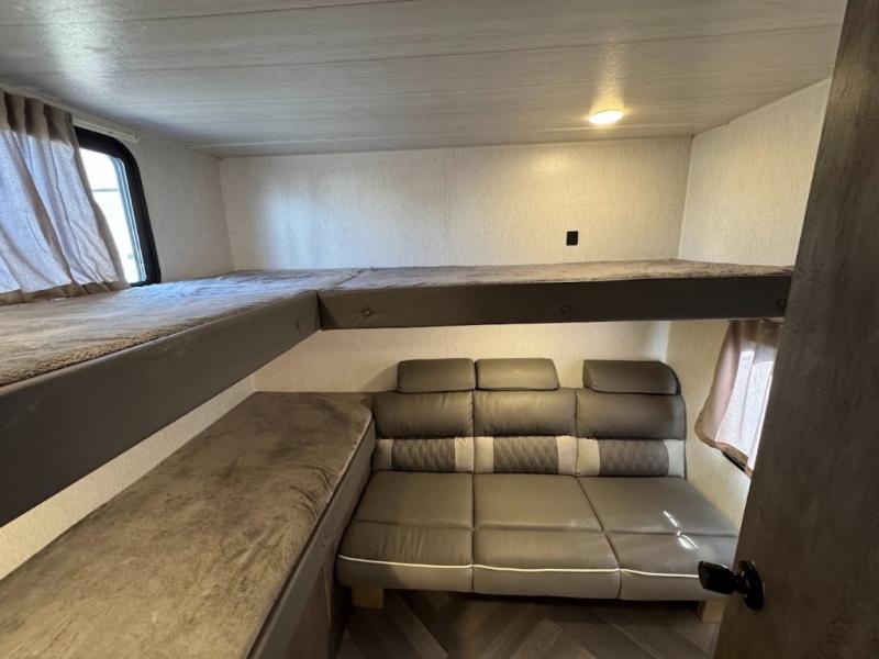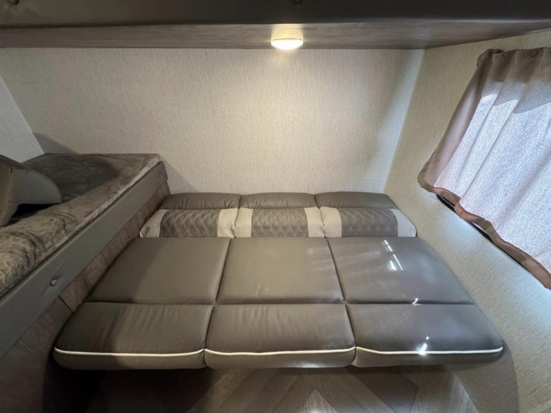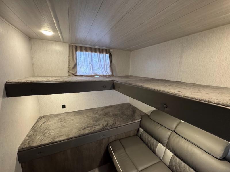 This versatile bunkhouse travel trailer is big enough for the whole family, but still light in weight by weighing in at 6,000 lbs.! The private bunkhouse has a set of 30" x 74" bunk beds and a 30" x 74" bunk bed above a Jiffy sofa. Just outside the bunkhouse is a pantry big enough to store everyone's favorite snacks, and the full bathroom with a walk-in shower. The three burner cooktop is just waiting for you to create a delicious meal, and the U-shaped dinette welcomes you to enjoy your meal in comfort, plus there is a large panoramic window for you to look out at your beautiful scenery. After you have stuffed yourself full, you can head to the Versa-lounge and relax by the fireplace at the entertainment center. The exterior has a pass-through storage area for you to keep your outdoor camping gear, a 16' power awning to protect you, and an exterior camp kitchen!