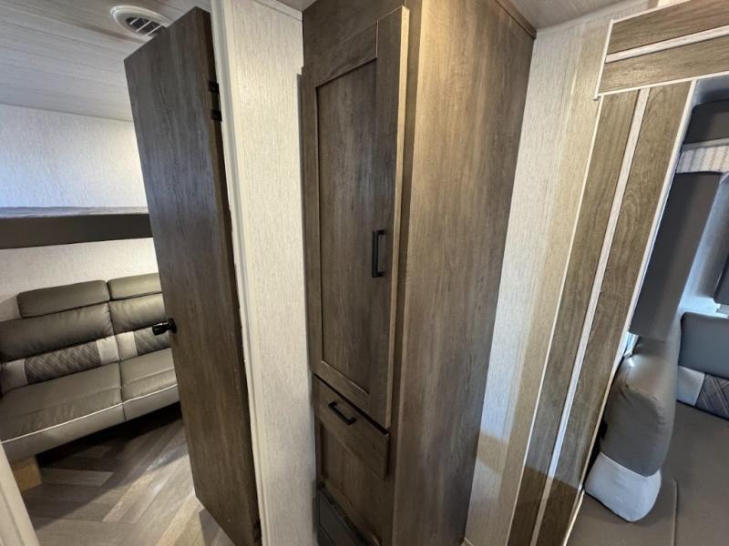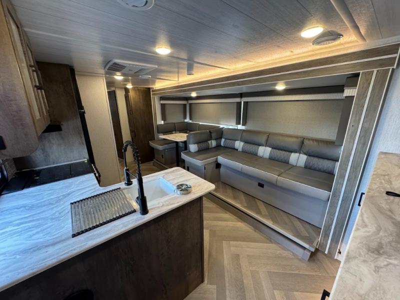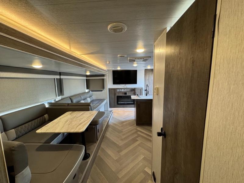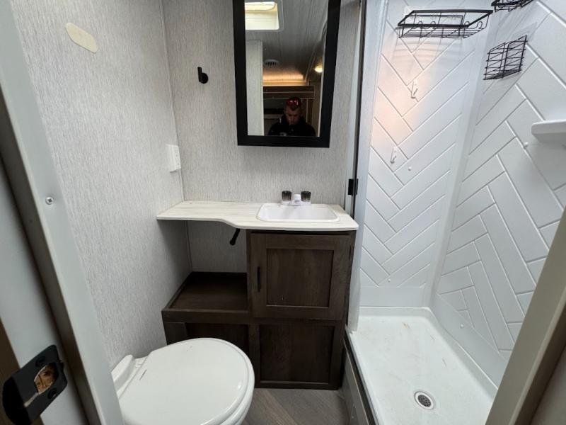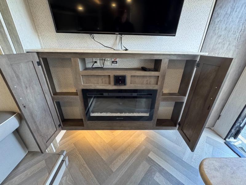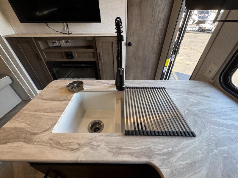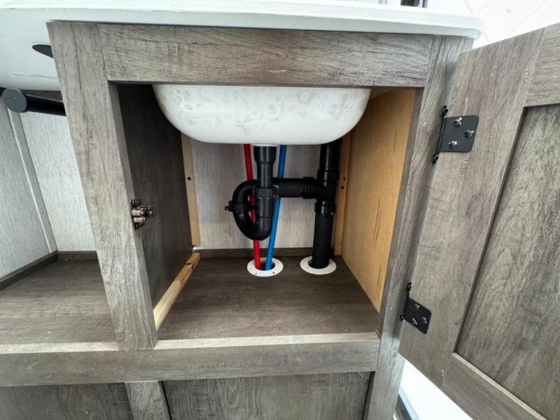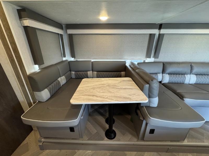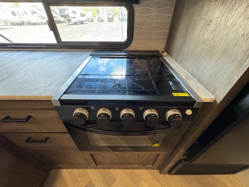 This versatile bunkhouse travel trailer is big enough for the whole family, but still light in weight by weighing in at 6,000 lbs.! The private bunkhouse has a set of 30" x 74" bunk beds and a 30" x 74" bunk bed above a Jiffy sofa. Just outside the bunkhouse is a pantry big enough to store everyone's favorite snacks, and the full bathroom with a walk-in shower. The three burner cooktop is just waiting for you to create a delicious meal, and the U-shaped dinette welcomes you to enjoy your meal in comfort, plus there is a large panoramic window for you to look out at your beautiful scenery. After you have stuffed yourself full, you can head to the Versa-lounge and relax by the fireplace at the entertainment center. The exterior has a pass-through storage area for you to keep your outdoor camping gear, a 16' power awning to protect you, and an exterior camp kitchen!