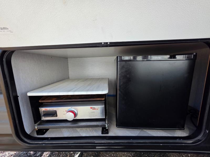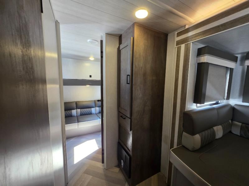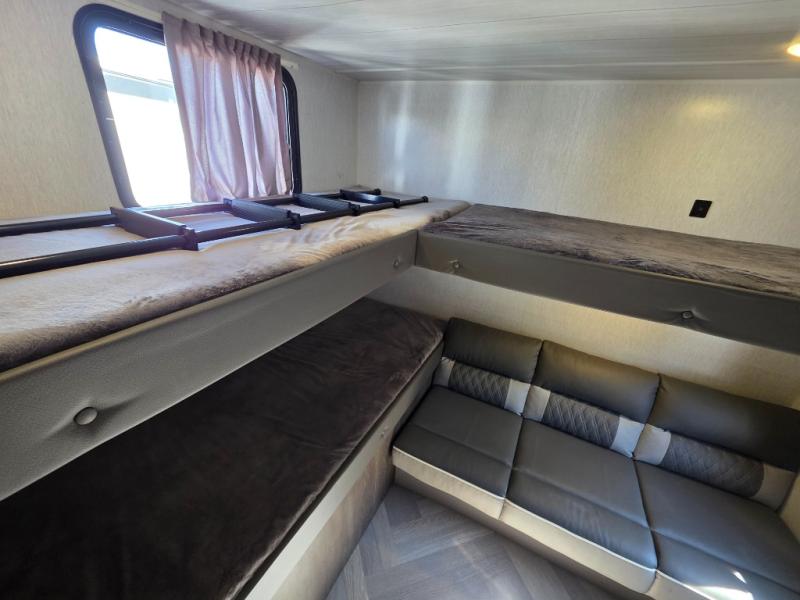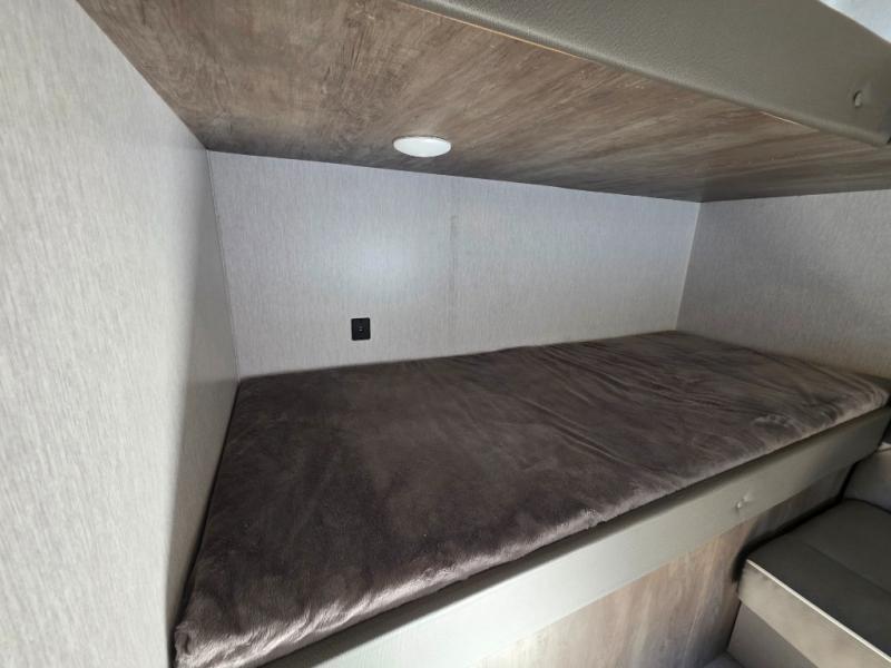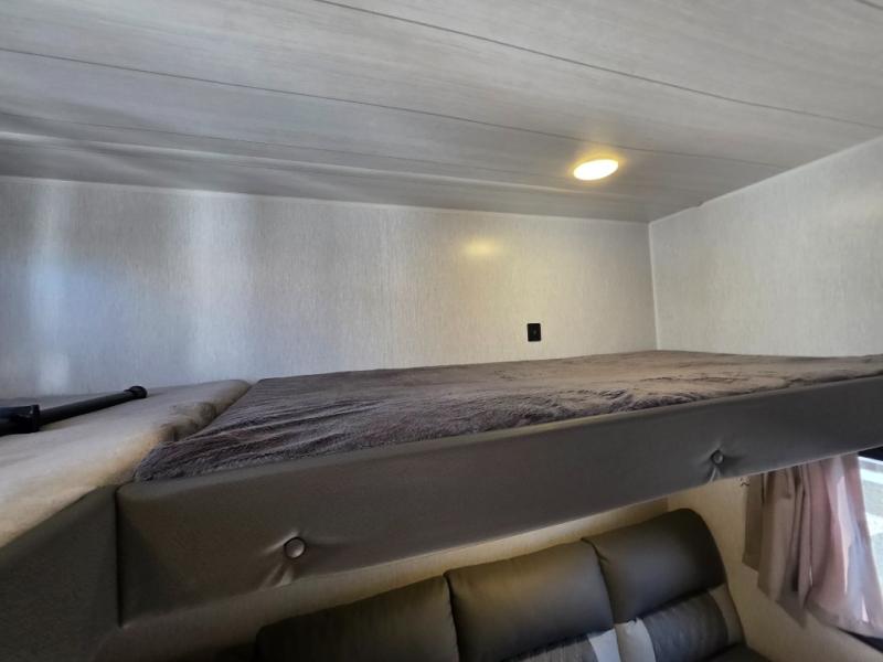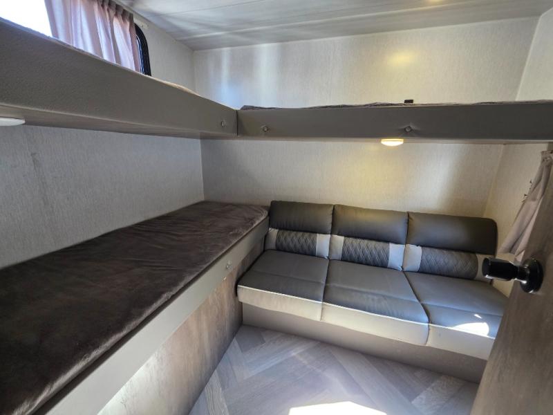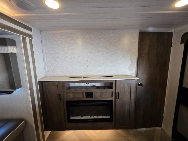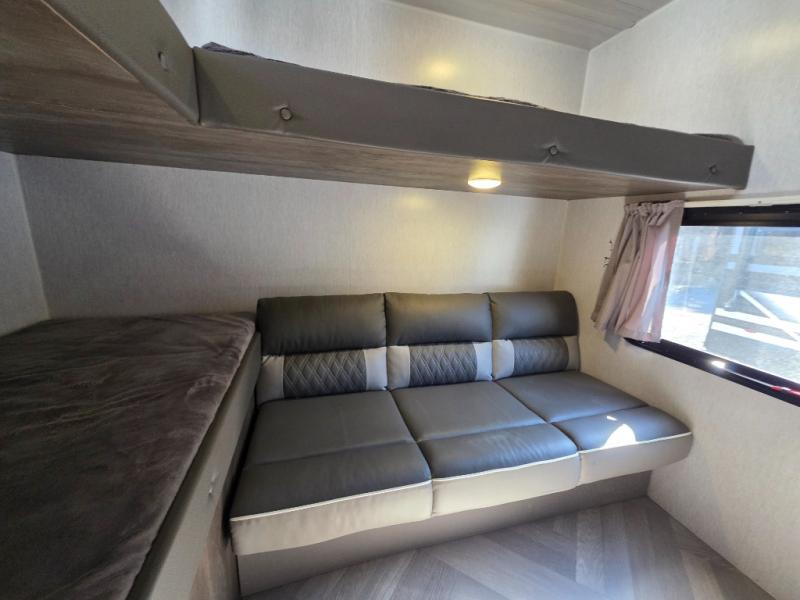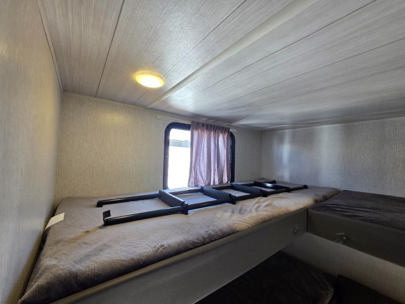 This versatile bunkhouse travel trailer is big enough for the whole family, but still light in weight by weighing in at 6,000 lbs.! The private bunkhouse has a set of 30" x 74" bunk beds and a 30" x 74" bunk bed above a Jiffy sofa. Just outside the bunkhouse is a pantry big enough to store everyone's favorite snacks, and the full bathroom with a walk-in shower. The three burner cooktop is just waiting for you to create a delicious meal, and the U-shaped dinette welcomes you to enjoy your meal in comfort, plus there is a large panoramic window for you to look out at your beautiful scenery. After you have stuffed yourself full, you can head to the Versa-lounge and relax by the fireplace at the entertainment center. The exterior has a pass-through storage area for you to keep your outdoor camping gear, a 16' power awning to protect you, and an exterior camp kitchen!