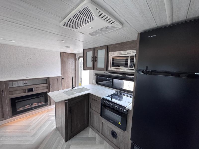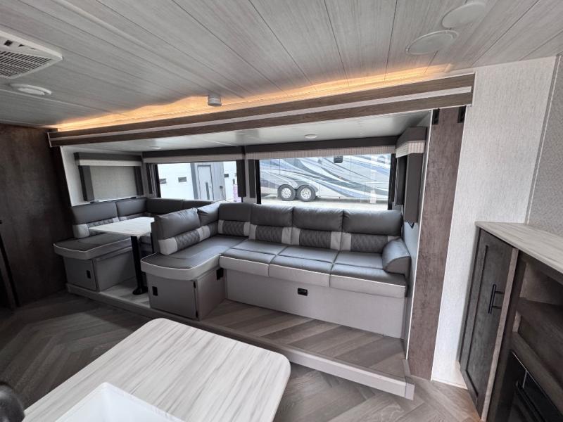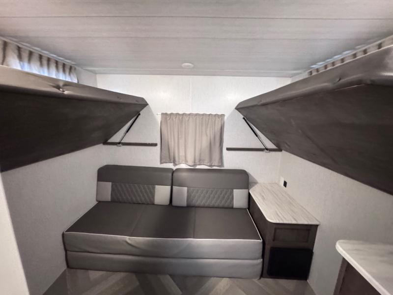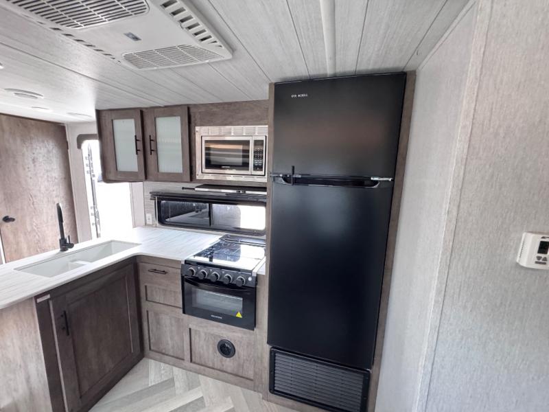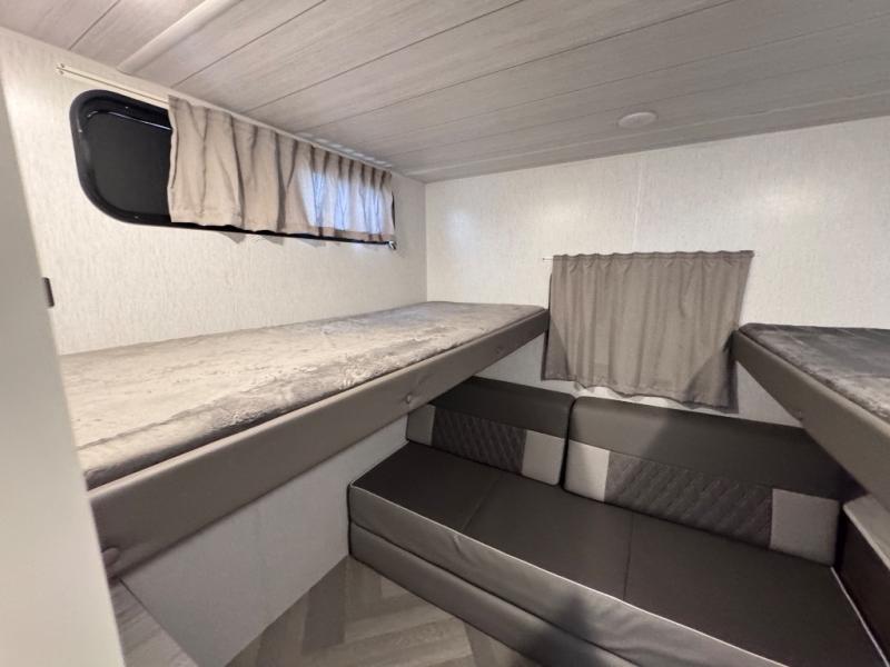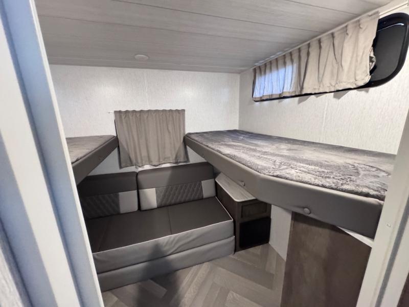 This travel trailer is new to the lineup and offers a large amount of versatility! The rear private bunkhouse has two 30" x 74" Versa-bunks and a Versa- queen bed so that more can join in on the camping fun. Start each morning feeling clean and fresh after showering in the walk-in shower with fiberglass surround then head to the front private bedroom to change. The kitchen has an oversized 11 cu. ft. refrigerator to keep your eggs fresh, a three burner cooktop to fry them up, and a U-shaped dinette to enjoy them at.