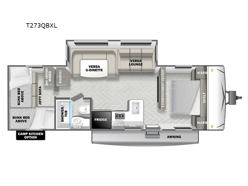 You and your family can invite the cousins or your friends to join you each trip with sleeping space for nine when you also utilize the furniture at night. The kiddos will love having the private bunkhouse all to themselves which includes three bunks and a Jiffy sofa, plus a wardrobe for their clothing. After a day at the lake, everyone can take turns getting cleaned up in the full bath before meal time. The cook will appreciate having a stainless steel microwave for quick meals and a three burner cooktop. The Versa lounge and Versa U-dinette offer dining and relaxing space inside, and the awning provides an outdoor living space that is covered. You can choose to add an optional camp kitchen outside if you like, and store all your outdoor cooking items and camp chairs in the pass through storage.