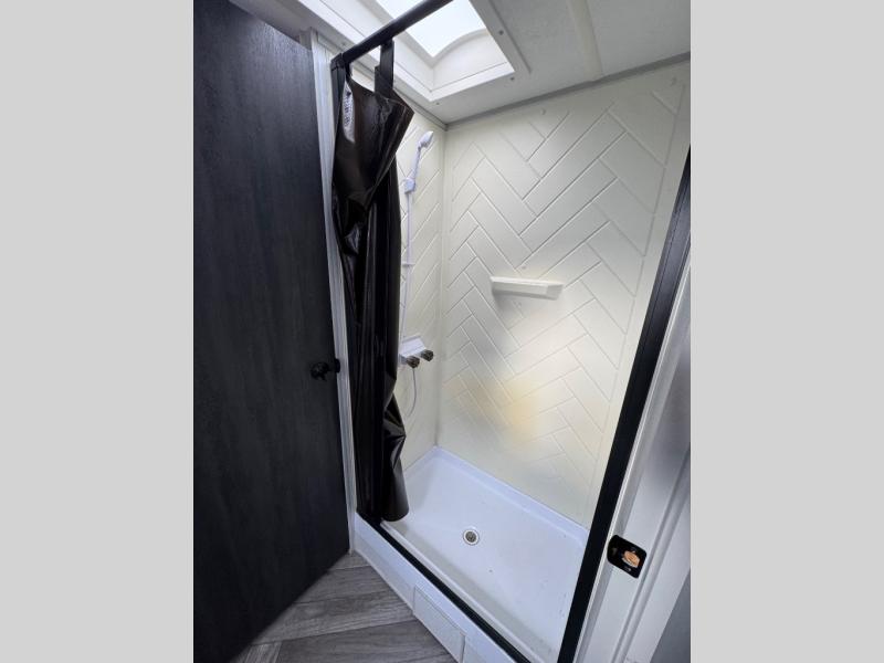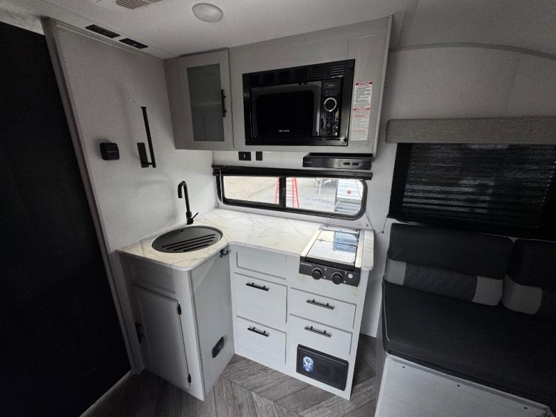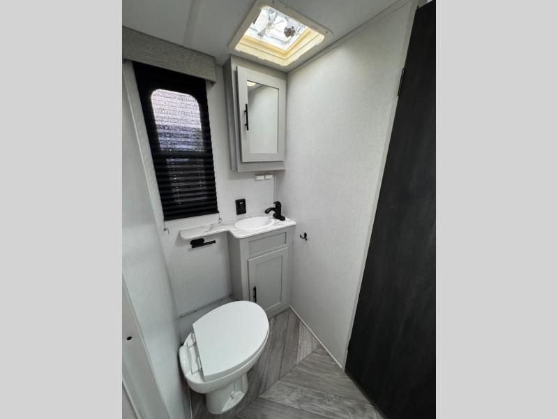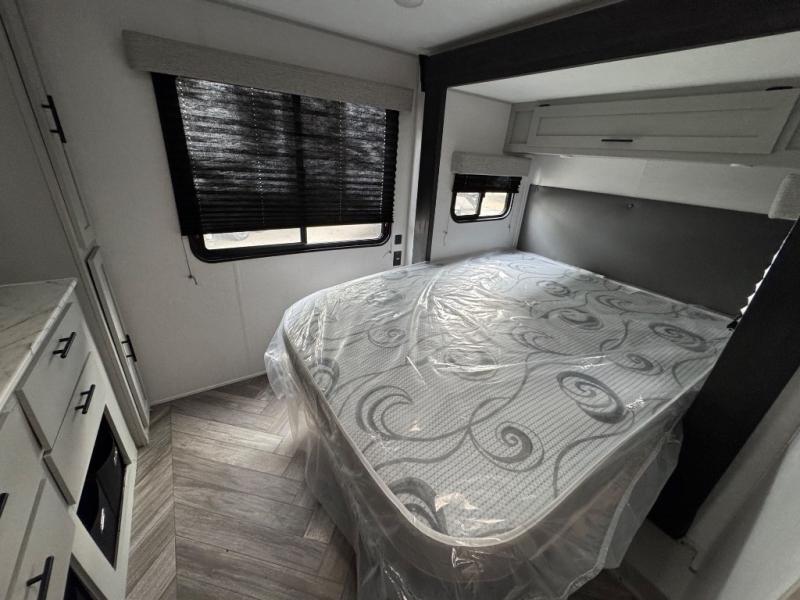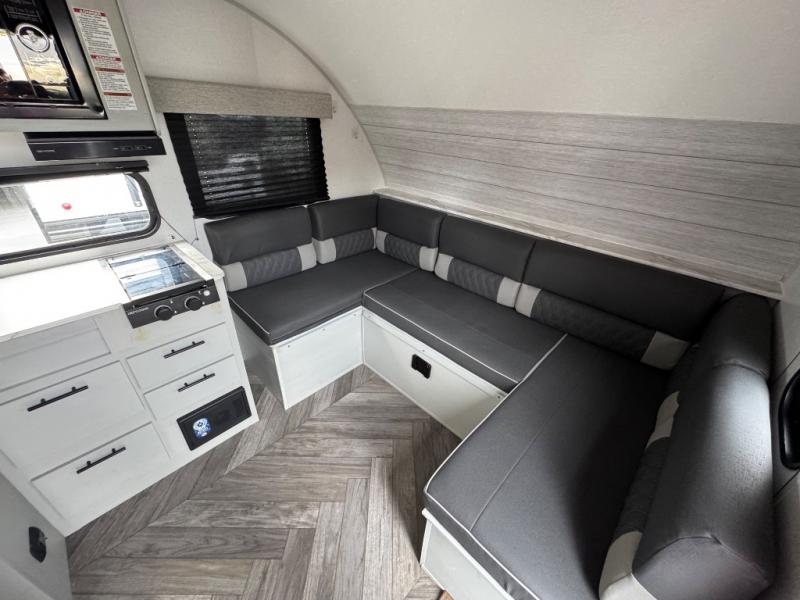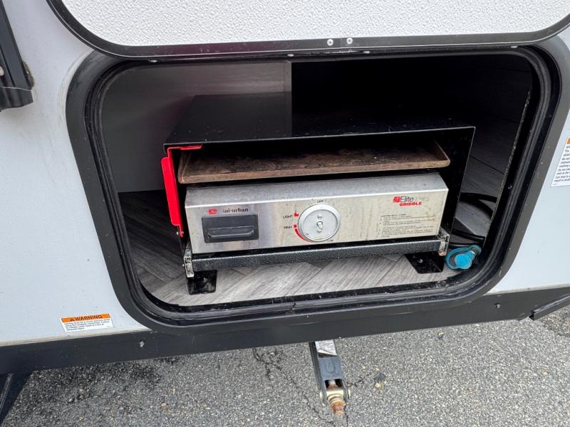 This travel trailer is perfect for couples who want to explore the great outdoors together! There is a rear private bedroom with a queen bed slide for more walking around space, a dresser with a TV location, and wardrobes on either side of it. Plus, it enters right into the separated bathroom which will come in handy when one person wants to freshen up in the 36" x 24" shower while another uses the private toilet and sink. You can prepare your best home cooked meals with the two burner cooktop then enjoy it at the front U-shaped dinette which can also transform into an extra sleeping space. Enjoy making pancakes on the outdoor LP Griddle under the 15' power awning!