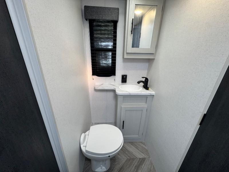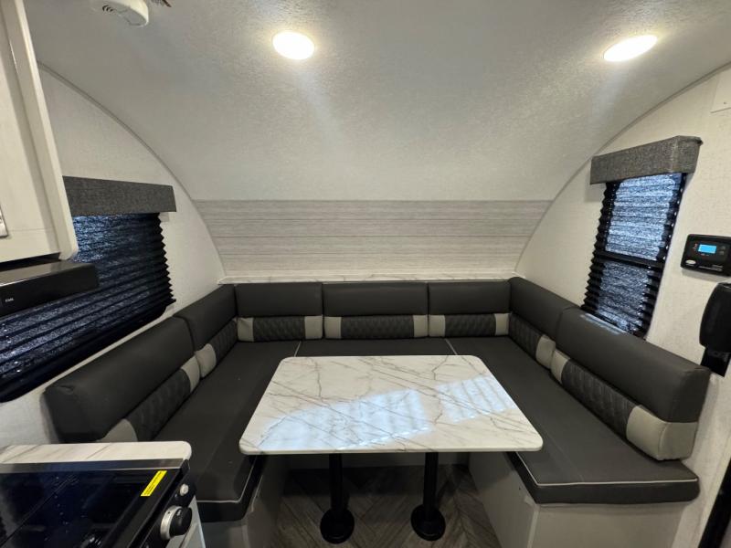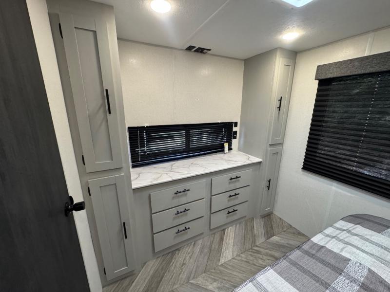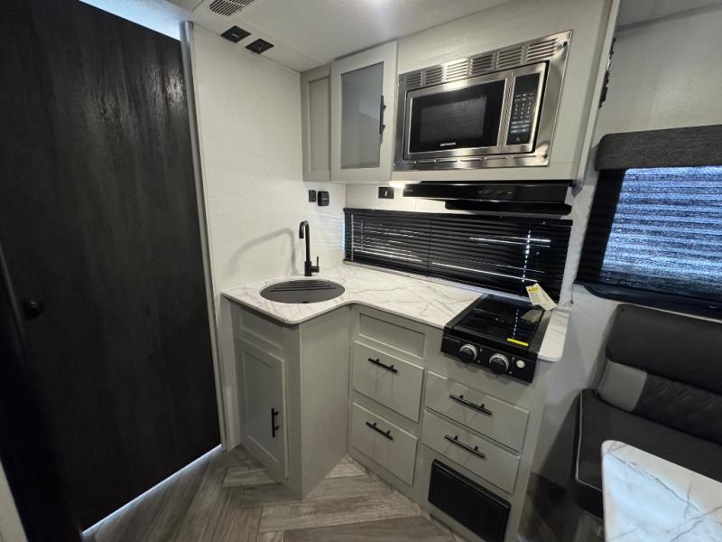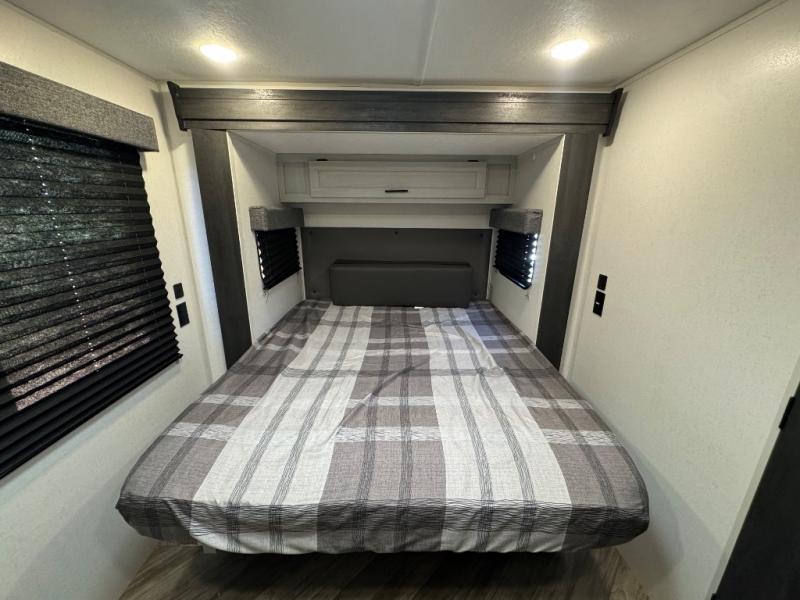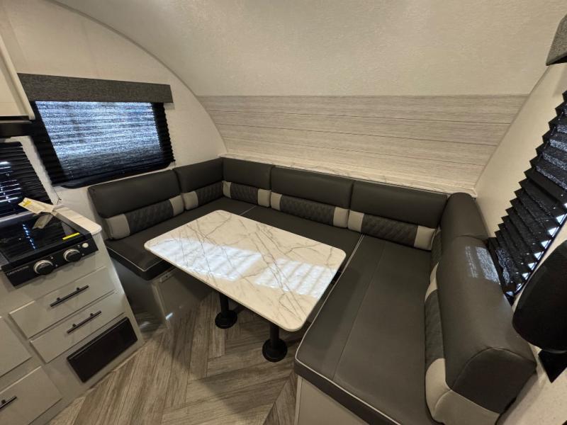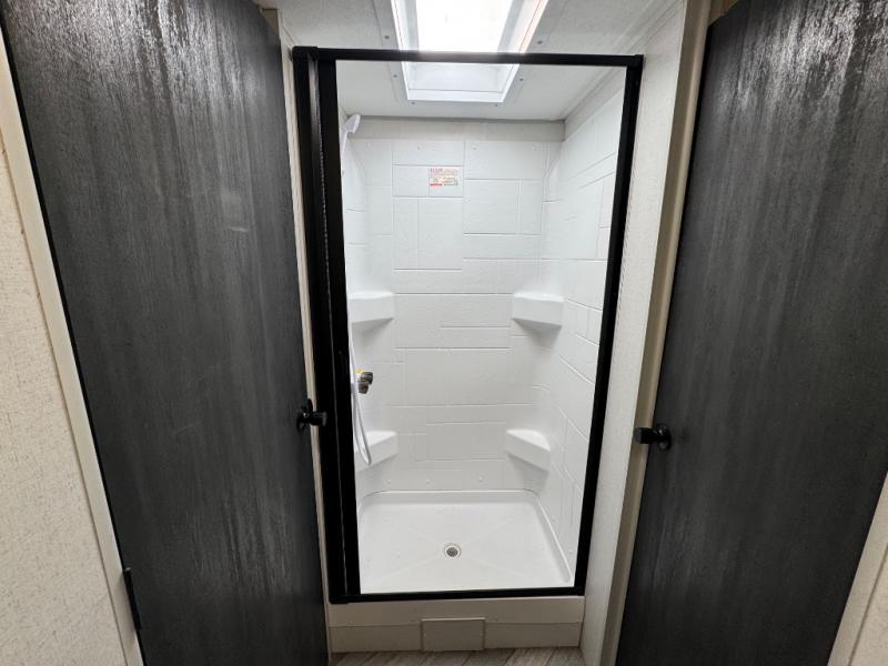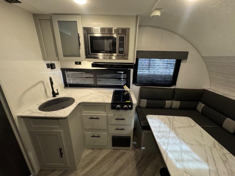 This travel trailer is perfect for couples who want to explore the great outdoors together! There is a rear private bedroom with a queen bed slide for more walking around space, a dresser with a TV location, and wardrobes on either side of it. Plus, it enters right into the separated bathroom which will come in handy when one person wants to freshen up in the 36" x 24" shower while another uses the private toilet and sink. You can prepare your best home cooked meals with the two burner cooktop then enjoy it at the front U-shaped dinette which can also transform into an extra sleeping space. Enjoy making pancakes on the outdoor LP Griddle under the 15' power awning!