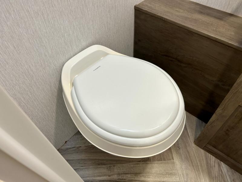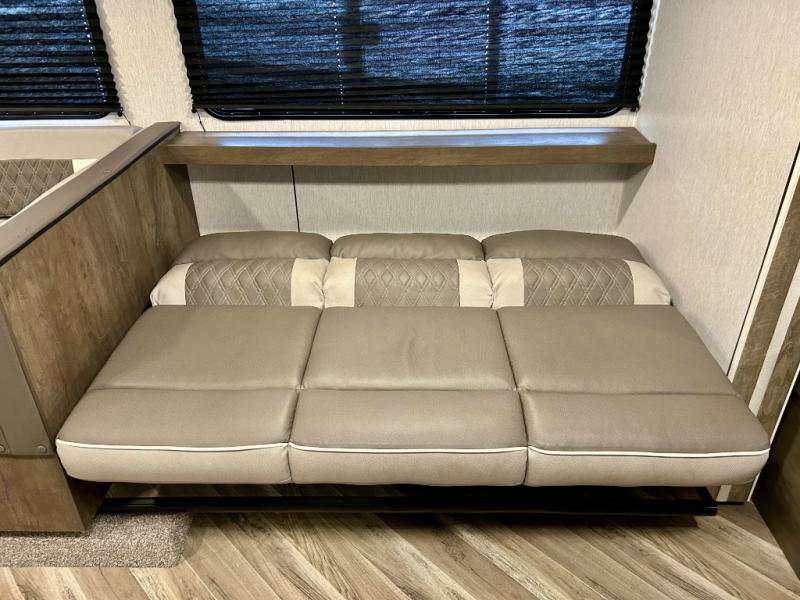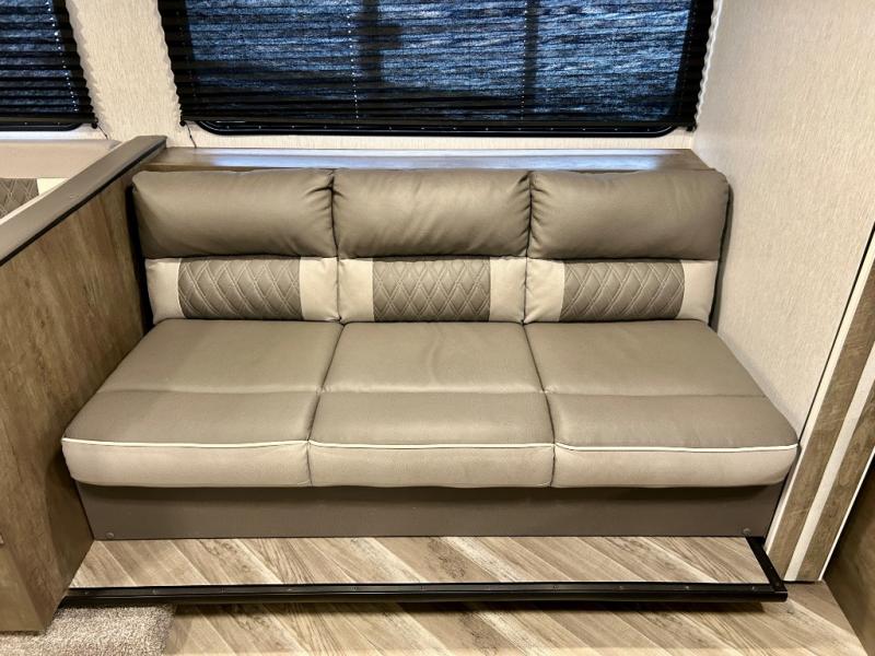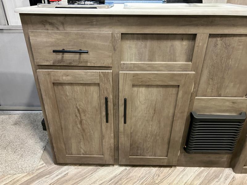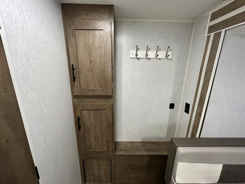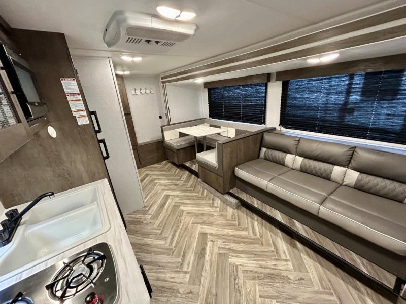 Experience a second home at the campgrounds with this travel trailer! There is a front queen bed with storage access and overhead cabinets to keep your items out of the way. The jiffy sofa sleeper and U-shaped dinette also offer comfortable places to sleep at night. In the mornings, grab some eggs from the 6 cu. ft. double door refrigerator and fry them up on the two burner cooktop. Next to the kitchen pantry is a hanging clothes storage area for your convenience. There is also a rear corner bathroom with a 36" x 24" shower to clean the sand out of your hair.