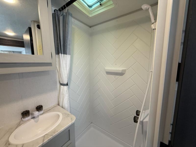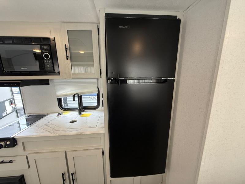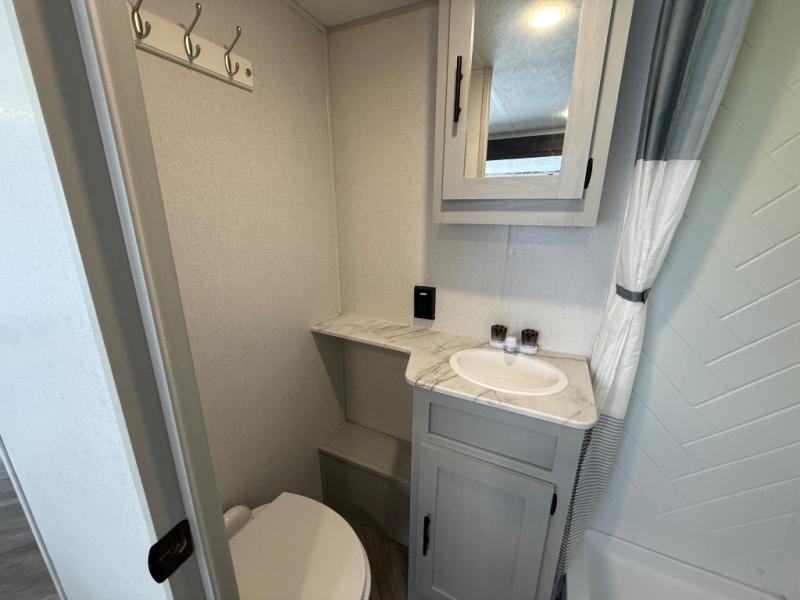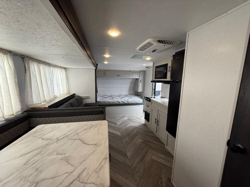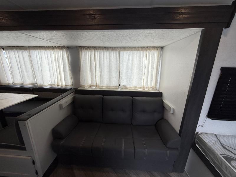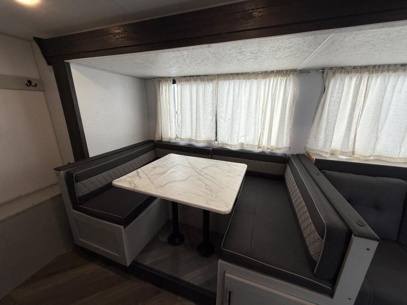 With wall-to-wall panoramic windows, the outdoors are brought inside this travel trailer! The large slide has a U-shaped dinette to enjoy your meals at and a sofa with storage access and above it is a hidden bonus bunk. The front Murphy bed offers comfortable seating during the day with a sofa and a place to lay your head at night with a 60" x 74" queen bed. Next to the kitchen pantry is a coat hook area and USB charger to keep your electronics at 100%. Prepare your best home cooked meals with the three burner cooktop and store any leftovers in the 11 cu. ft. frost free refrigerator. You can rinse the mud off either with the outside shower or in the full bathroom with the 36" x 24" shower!
