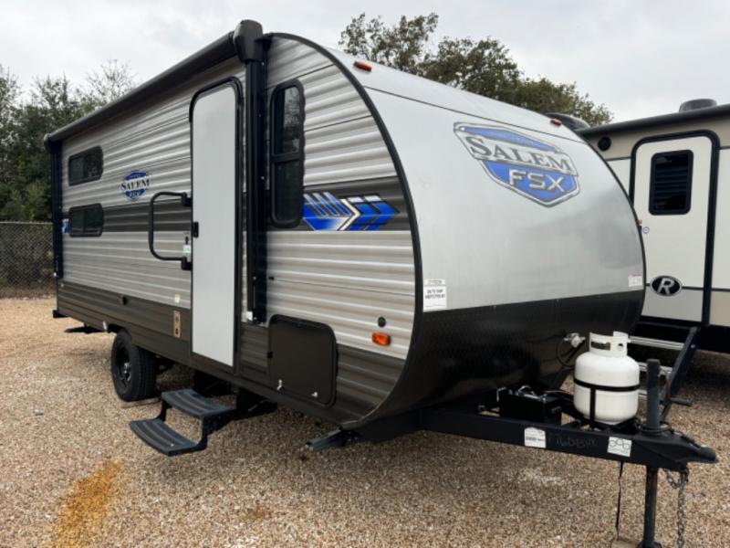 Each one of these Forest River Salem FSX travel trailer and travel trailer toy haulers are fully featured, light weight, and easy to tow making them perfect for a first time or seasoned camper! They are built with a SuperFlex one piece roof, a powder coated I-beam frame, and an aerodynamic front radius profile for better wind resistance. With the largest in class opening panoramic windows, you will have a great view of your beautiful surroundings and enjoy fresh breezes of air throughout. A diamond plate front rock guard will protect your unit from road debris and the Tuffcoat scratch resistant exterior paint helps to keep any dings or bumps from scratching it. The Best-In-Class package comes with an AccessiBelly enclosed underbelly to keep your units vitals safe through every season, a XL folding grab assist handle to safely enter and exit, and an upgraded appliance package to prepare your best meals. Come find the model that best fits your needs today!