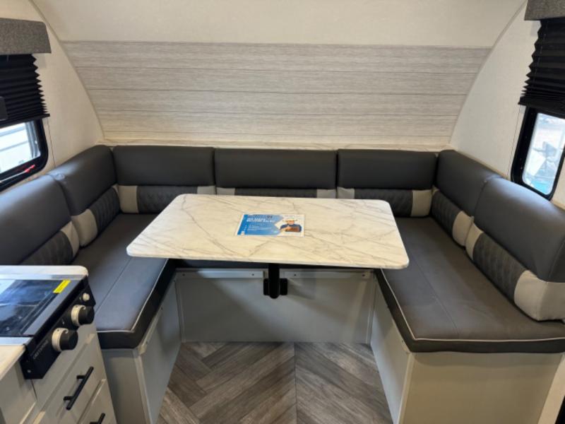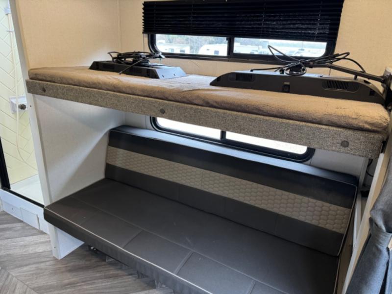 The whole family can go camping in this travel trailer! The kiddos can sleep on the set of double bunk beds with bunk cubbies and you can sleep on the queen bed slide next to them. The separated bathroom makes it easy for one person to freshen up in the 36" x 24" shower while another uses the private toilet and sink. The fully equipped kitchen has everything you need to prepare delicious meals and there is even an outside refrigerator to enjoy cold beverages while relaxing underneath the 15' power awning. The front U-shaped dinette offers a comfortable place to eat your meals, play card games, and even transform into an extra sleeping space!