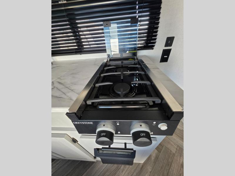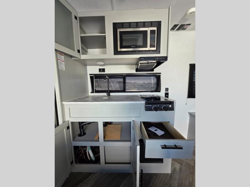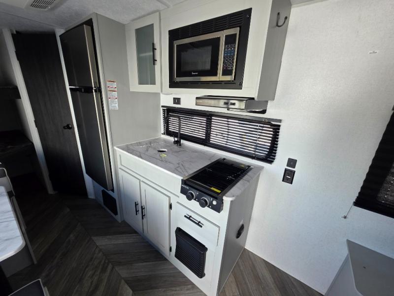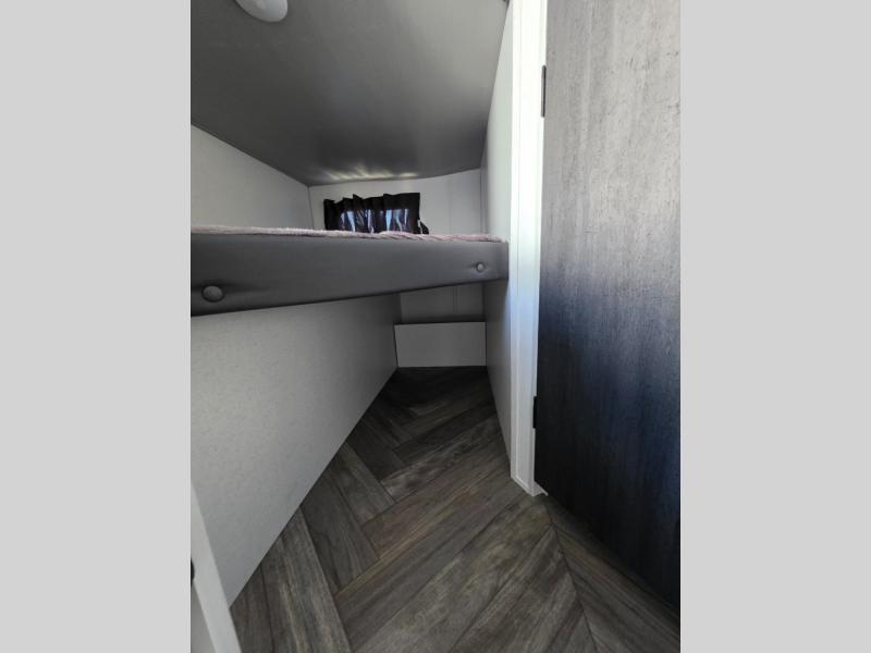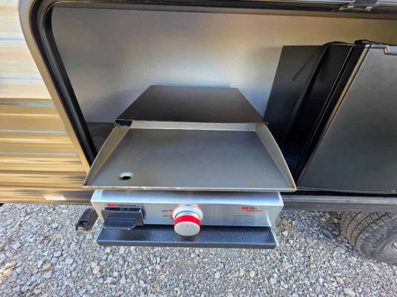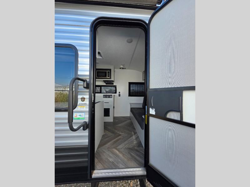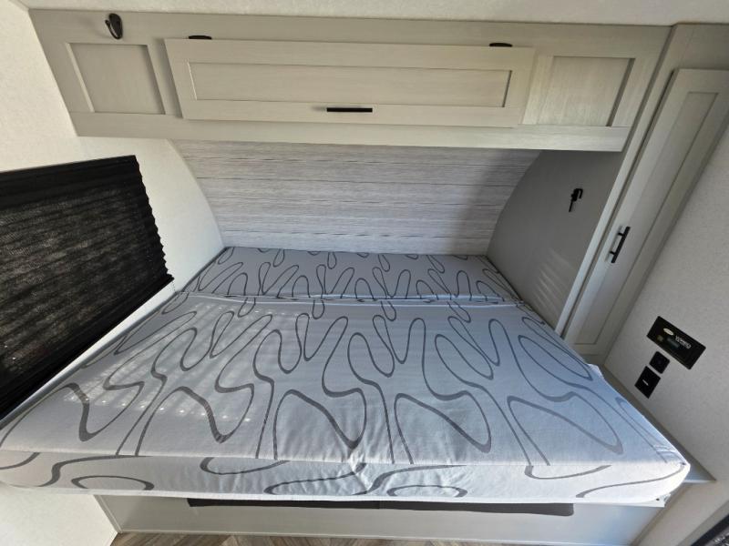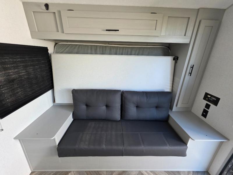 No need will go unmet with this travel trailer! It features a front Murphy bed that has a 60" x 74" queen bed to sleep on and a sofa with storage access to sit on during the day. The corner set of 48" x 72" double bunk beds come with storage to keep things out of the way and are conveniently next to the rear corner bathroom which has a 36" x 24" shower to freshen up in each morning. You can prepare your best home cooked meals indoors with the two burner cooktop or head to the optional outside LP griddle to fry up some burgers while breathing in some fresh air. Enjoy your meals, play card games, and even sleep at the booth dinette. You will also appreciate the outside shower and the front exterior full pass-through storage area for all your outdoor gear.