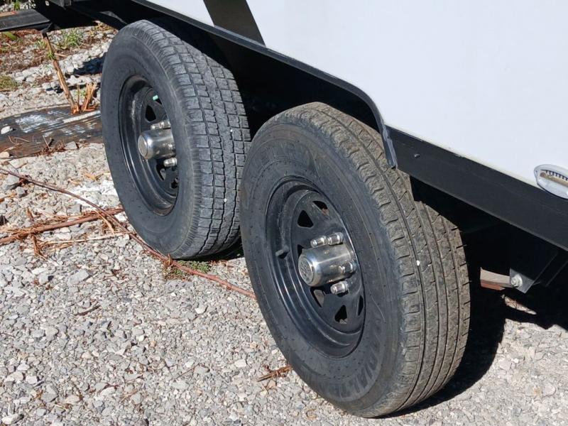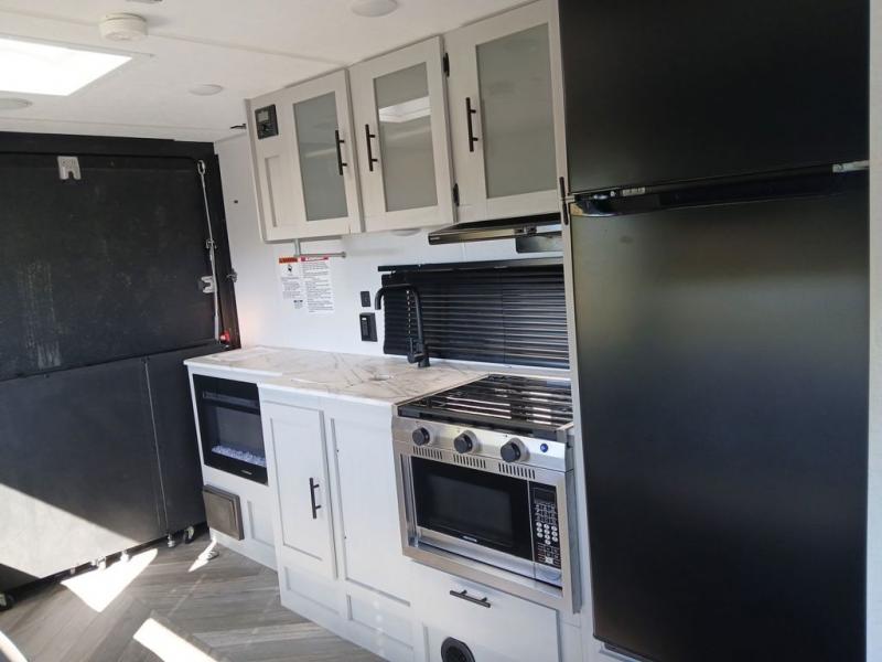 There is plenty of room in this toy hauler for your off-road toys and to comfortably live at the campsite! The 3,000 lb. ramp door makes it easy to load your toys, the 1,500 lb. tie downs will keep them securely in place, and the party patio with 1,500 lb. max weight capacity is the perfect place to socialize together and share stories. Keep your bellies full with the two burner cooktop and your perishables fresh with the 11 cu. ft. frost free refrigerator. Everyone will have a comfortable place to sleep between the two 30" x 72" sofa sleepers and the front 60" x 74" queen bed with a shelf above and wardrobe to keep your clothes looking nice, plus there is a USB charger and 110V outlet to keep your electronics at 100%. Freshen up each morning in the full bathroom with the 36" x 24" shower with a skylight above for natural lighting!