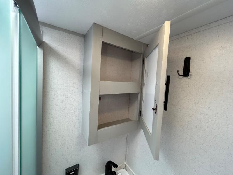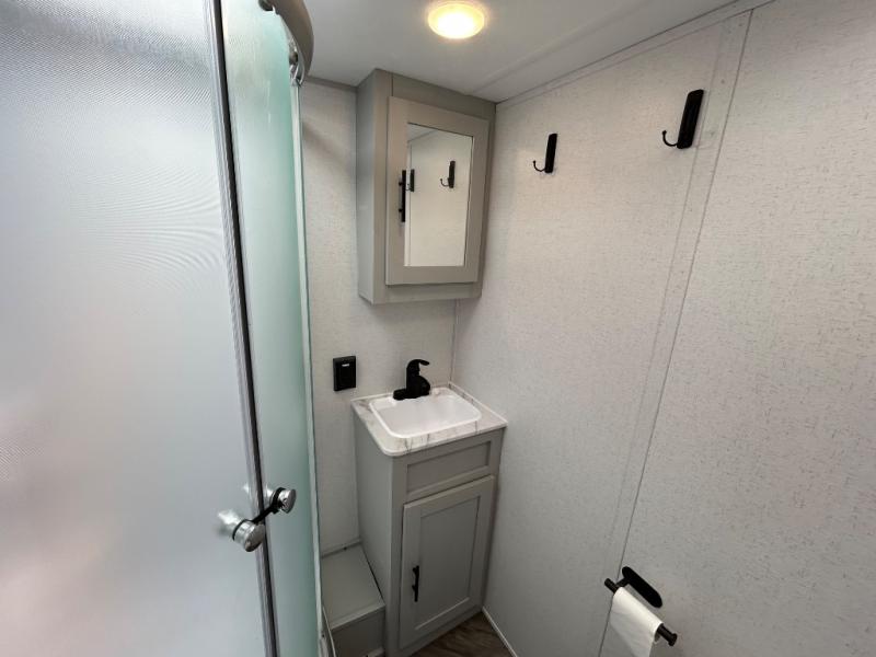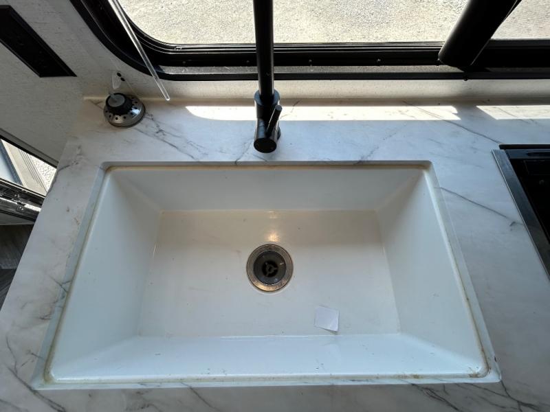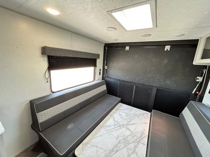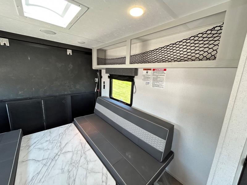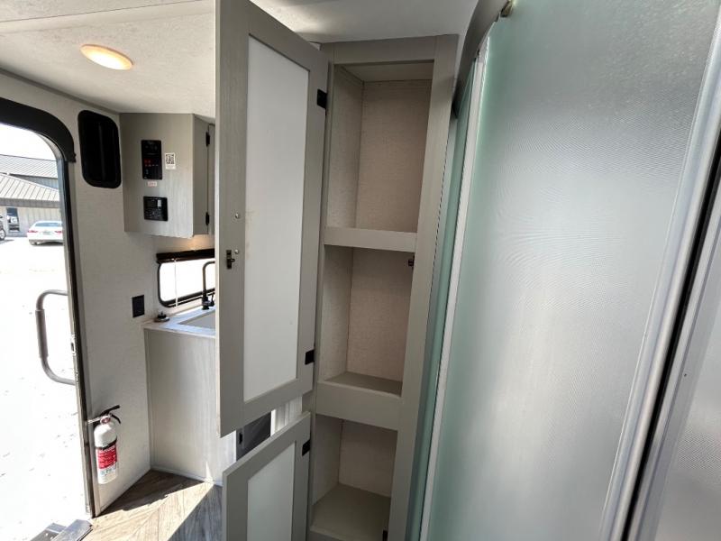 This toy hauler has everything you need for a fun family getaway! Load up your toys with the 3,000 lb. ramp door and secure them with the 1,500 lb. tie downs. Once you have reached your destination, you can set up the opposing 30" x 72" sofa sleepers with a table in between for eating your meals and playing games. The walk-in pantry and 11 cu. ft. frost free refrigerator are big enough to store everyone's favorite snacks too. Clean the mud out of your hair in the full bathroom with the neo-angled shower with a skylight for added natural lighting. When you're ready to wind down your nights, head to the front private bedroom and sleep on the 60" x 74" queen bed with wardrobes and USB chargers on either side of it!