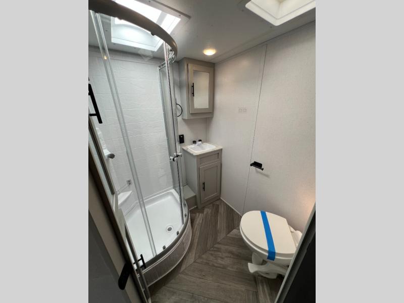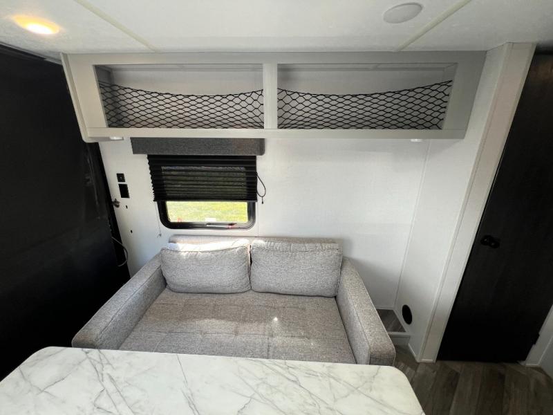 This toy hauler has everything you need for a fun family getaway! Load up your toys with the 3,000 lb. ramp door and secure them with the 1,500 lb. tie downs. Once you have reached your destination, you can set up the opposing 30" x 72" sofa sleepers with a table in between for eating your meals and playing games. The walk-in pantry and 11 cu. ft. frost free refrigerator are big enough to store everyone's favorite snacks too. Clean the mud out of your hair in the full bathroom with the neo-angled shower with a skylight for added natural lighting. When you're ready to wind down your nights, head to the front private bedroom and sleep on the 60" x 74" queen bed with wardrobes and USB chargers on either side of it!