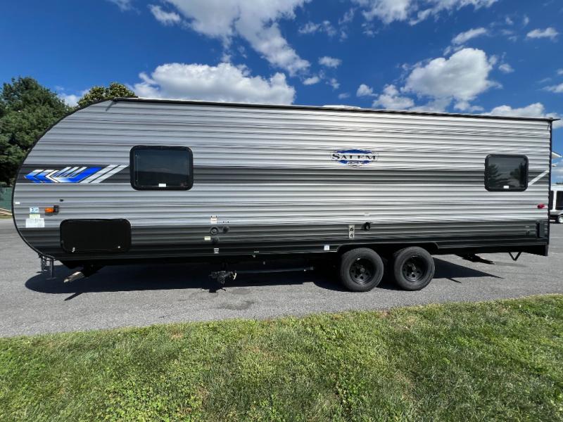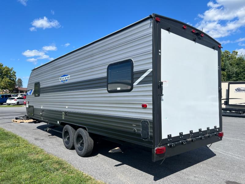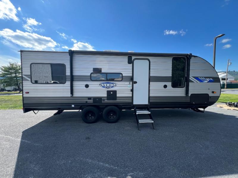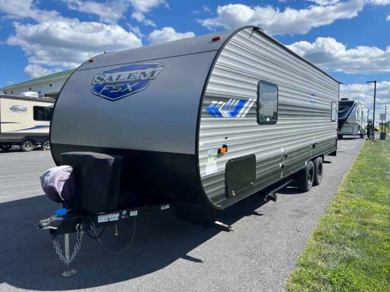 Each one of these Forest River Salem FSX travel trailer and travel trailer toy haulers are fully featured, light weight, and easy to tow making them perfect for a first time or seasoned camper! They are built with a SuperFlex one piece roof, a powder coated I-beam frame, and an aerodynamic front radius profile for better wind resistance. With the largest in class opening panoramic windows, you will have a great view of your beautiful surroundings and enjoy fresh breezes of air throughout. A diamond plate front rock guard will protect your unit from road debris and the Tuffcoat scratch resistant exterior paint helps to keep any dings or bumps from scratching it. The Best-In-Class package comes with an AccessiBelly enclosed underbelly to keep your units vitals safe through every season, a XL folding grab assist handle to safely enter and exit, and an upgraded appliance package to prepare your best meals. Come find the model that best fits your needs today!