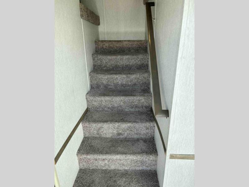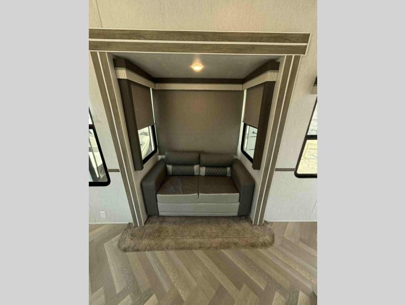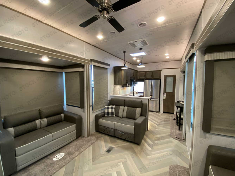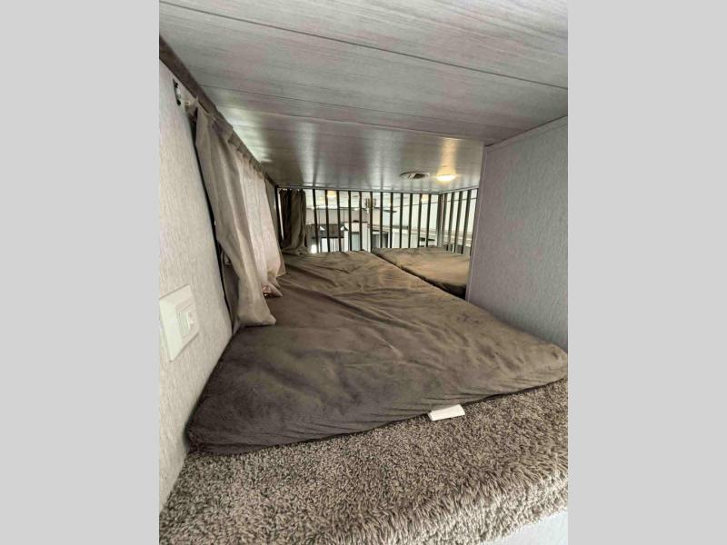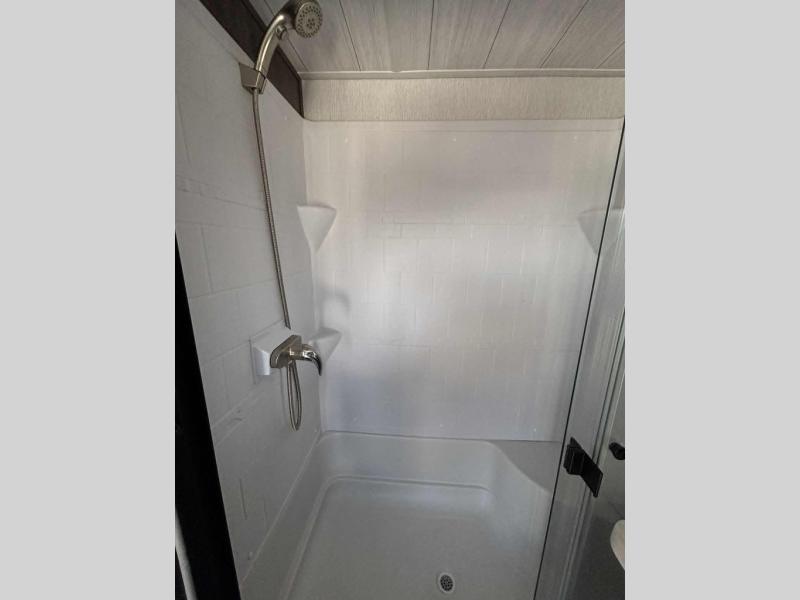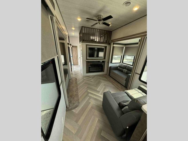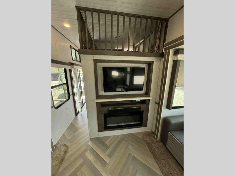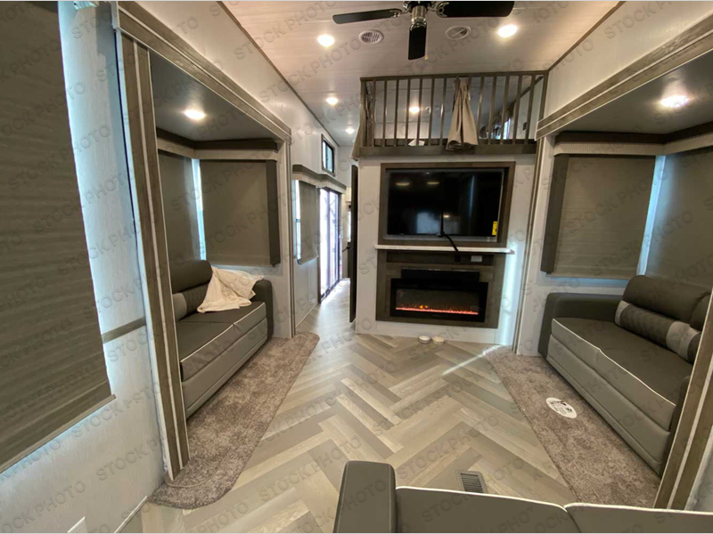 This destination trailer is truly exceptional with its large front kitchen that comes with residential appliances, lots of cabinet and pantry space, and even a free standing dinette so others can play games nearby while you cook! The living area has two opposing sofa slides and theater seating across from the entertainment center with a built-in electric fireplace for a relaxing evening indoors. With a 50" walk-in shower with a seat in the full bathroom, everyone is sure to stay clean. The rear private bedroom not only has a custom king bed slide and a closet that is prepped to add an optional washer and dryer, but also a double loft above it with four bunk mats in total!