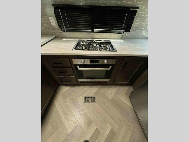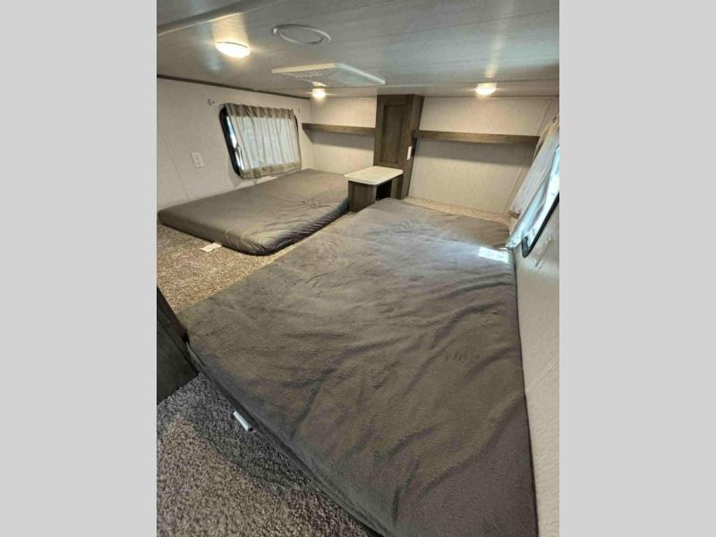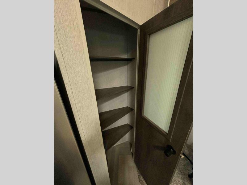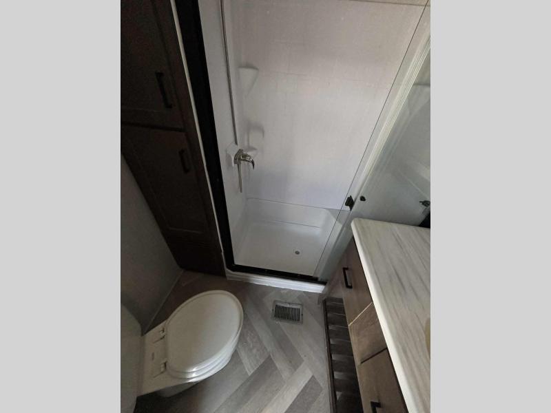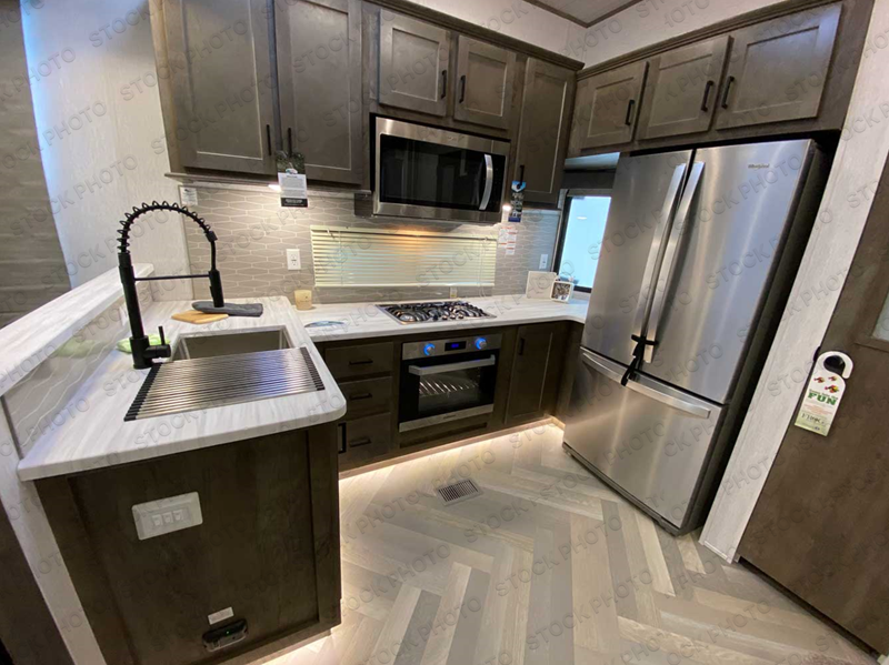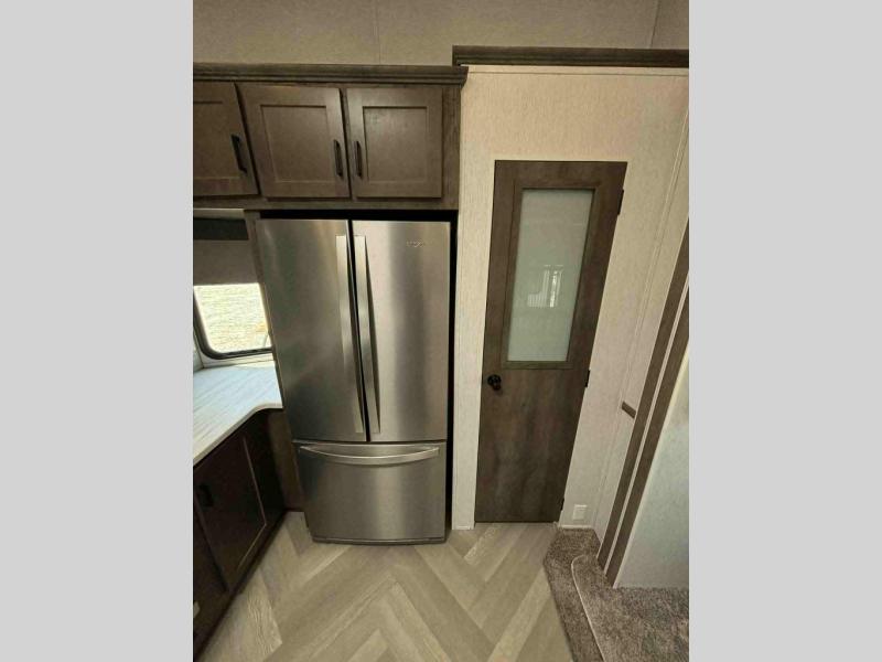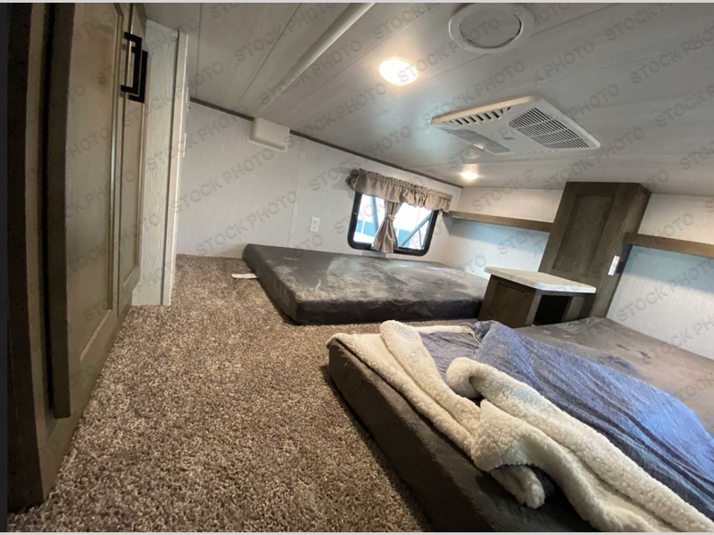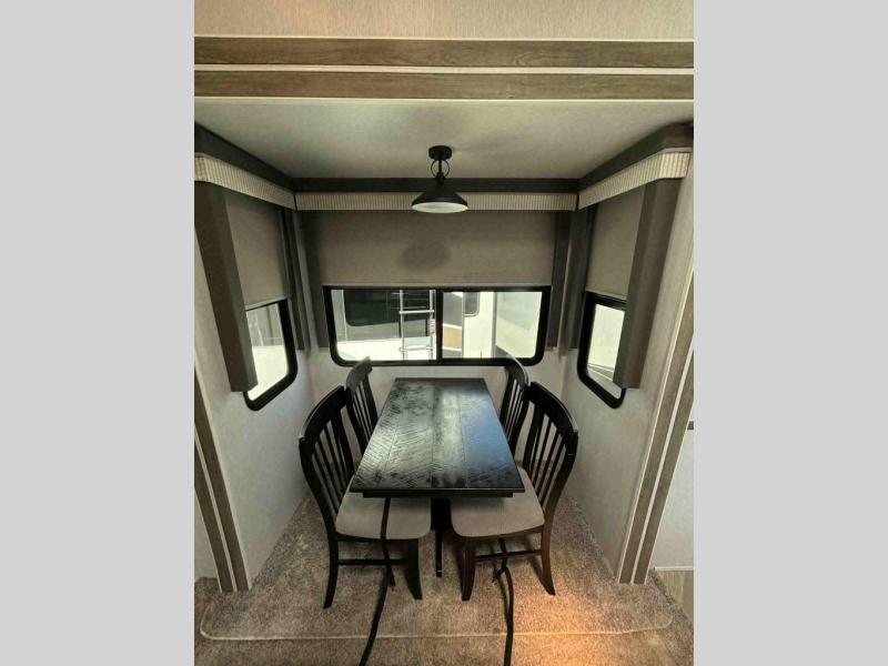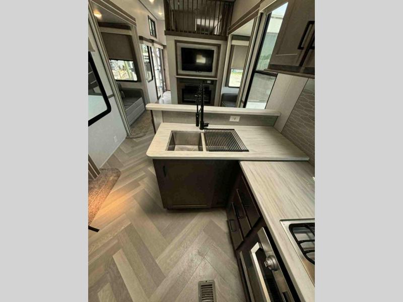 This destination trailer is truly exceptional with its large front kitchen that comes with residential appliances, lots of cabinet and pantry space, and even a free standing dinette so others can play games nearby while you cook! The living area has two opposing sofa slides and theater seating across from the entertainment center with a built-in electric fireplace for a relaxing evening indoors. With a 50" walk-in shower with a seat in the full bathroom, everyone is sure to stay clean. The rear private bedroom not only has a custom king bed slide and a closet that is prepped to add an optional washer and dryer, but also a double loft above it with four bunk mats in total!
