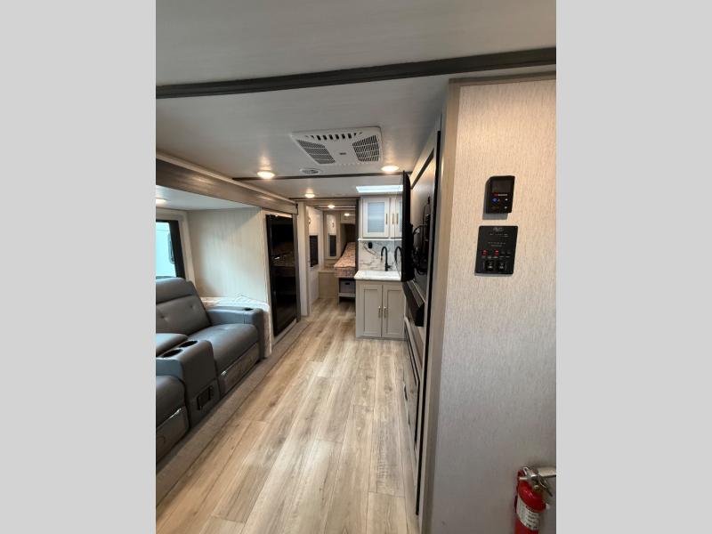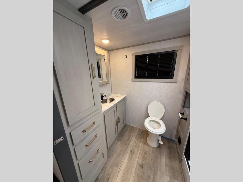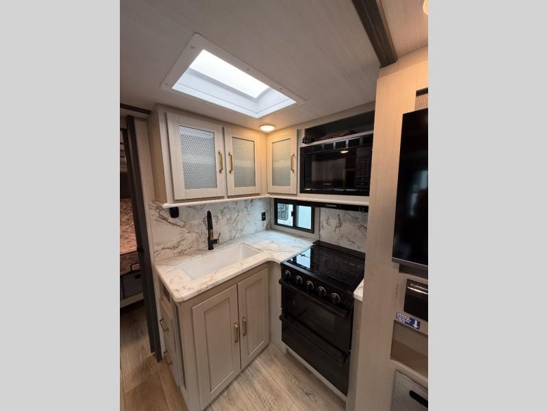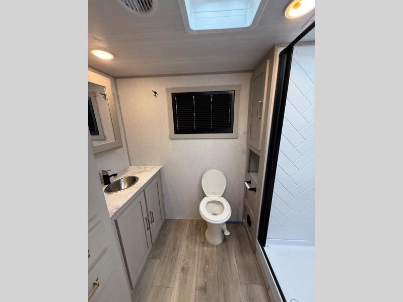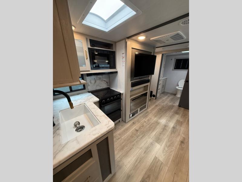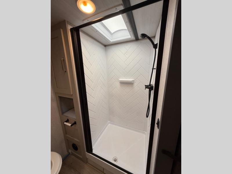 You will experience better gas mileage and a smoother ride with any one of these Forest River Salem Hemisphere Hyper-Lyte travel trailers! The stunning interiors include Herringbone designer's choice congoleum flooring for an easy clean up, rich wood tones with the Hudson wood agreeable grain cabinetry, and yacht trim ceiling finishes. With a high efficiency A/C cooling system, you can be sure to stay cool even on the hottest summer day. The mandatory Upgraded Options package includes an outside shower to rinse the mud off before entering, a central switch center, and an ivory performance colored exterior fiberglass with smoked quartz metallic accents to turn heads while at the campsite!