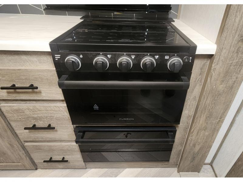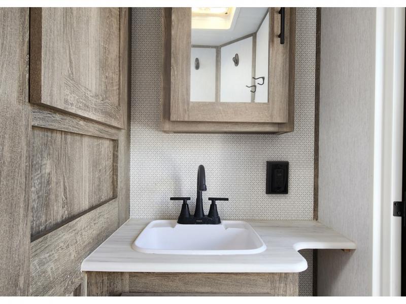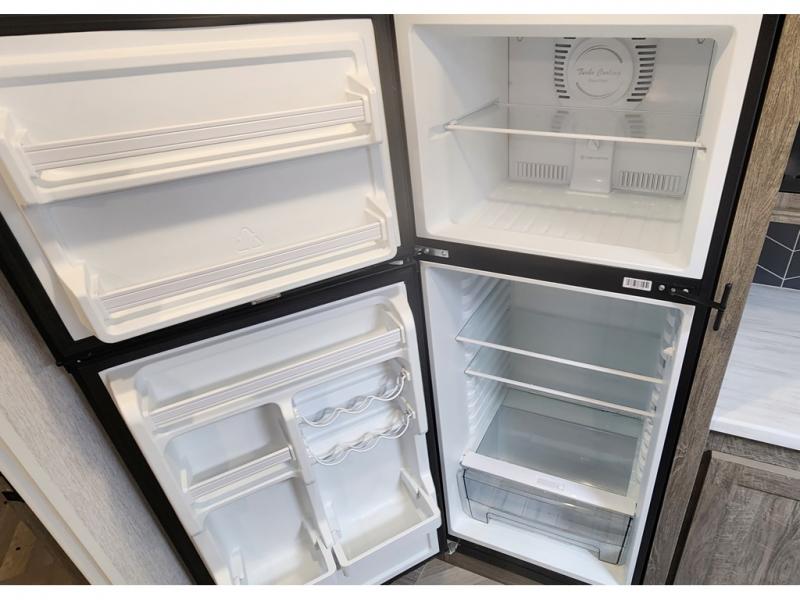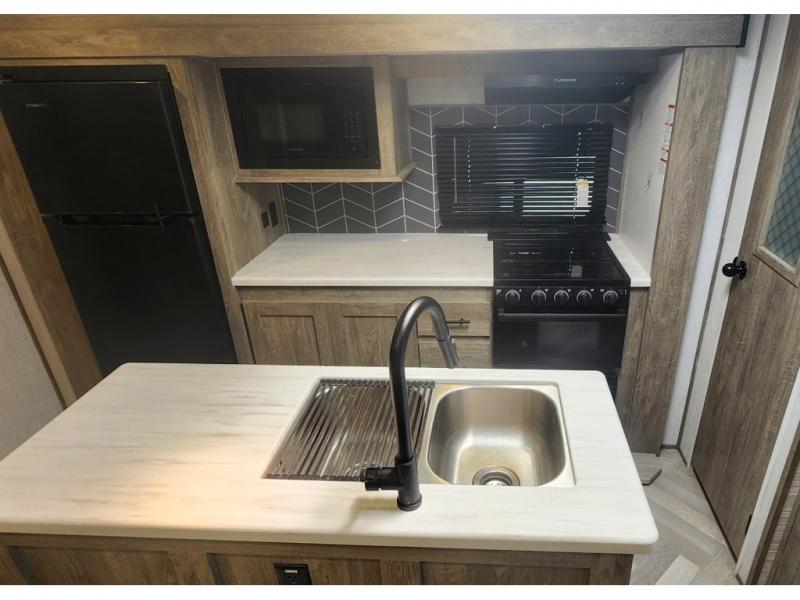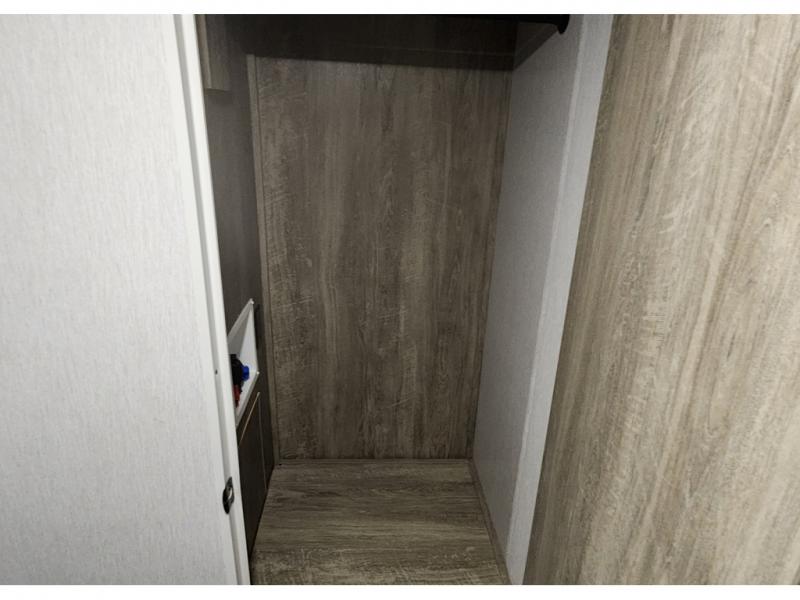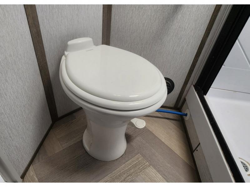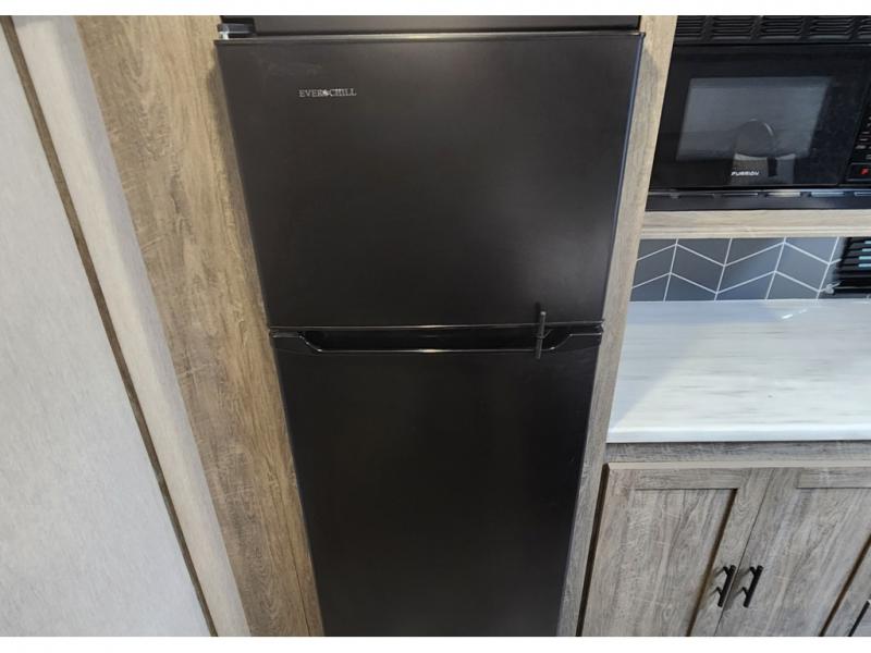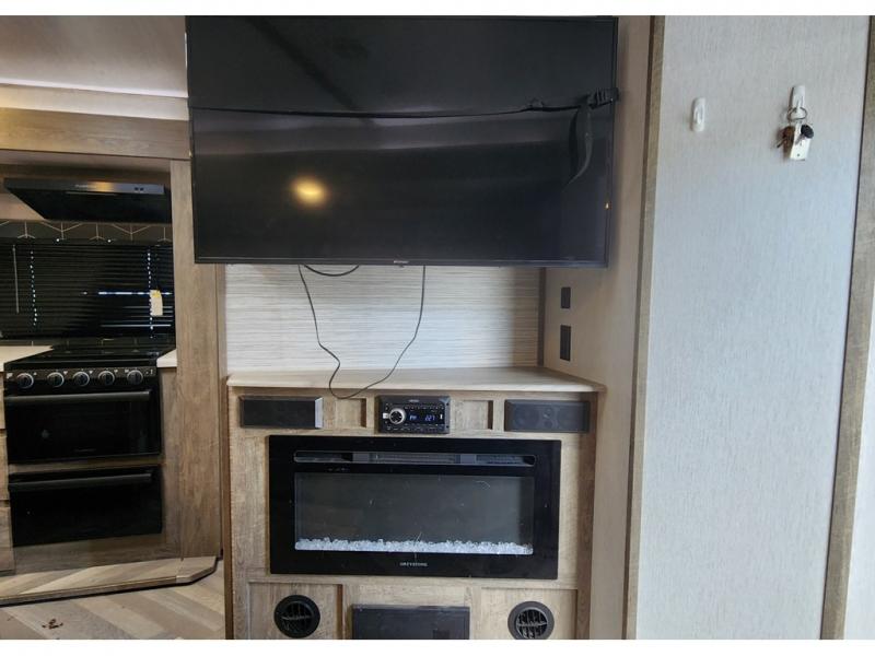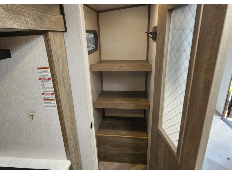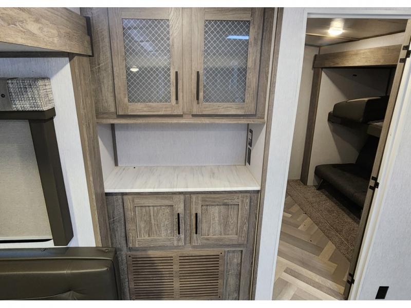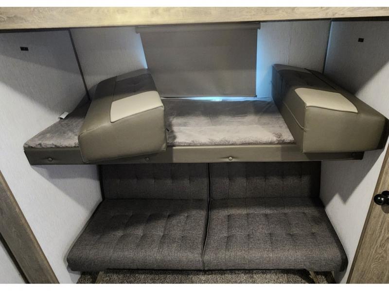 Your kids or friends are going to love camping in this travel trailer! It features a rear private bunkhouse with a bunk above a Versa queen convertible bed/sofa plus an additional bunk above an entertainment center with storage below. Just outside the bunkhouse is the kitchen with a 10.7 cu. ft. residential refrigerator, a microwave, a kitchen island, and a chef-sized walk-in pantry big enough to store everyone's favorite snacks. The booth dinette and the theatre seating are right next to panoramic windows so you can enjoy looking out at your beautiful scenery. You will also love taking a hot, steamy shower in the 30" x 36" walk-in shower and get a good night's rest on the queen bed in the front private bedroom!