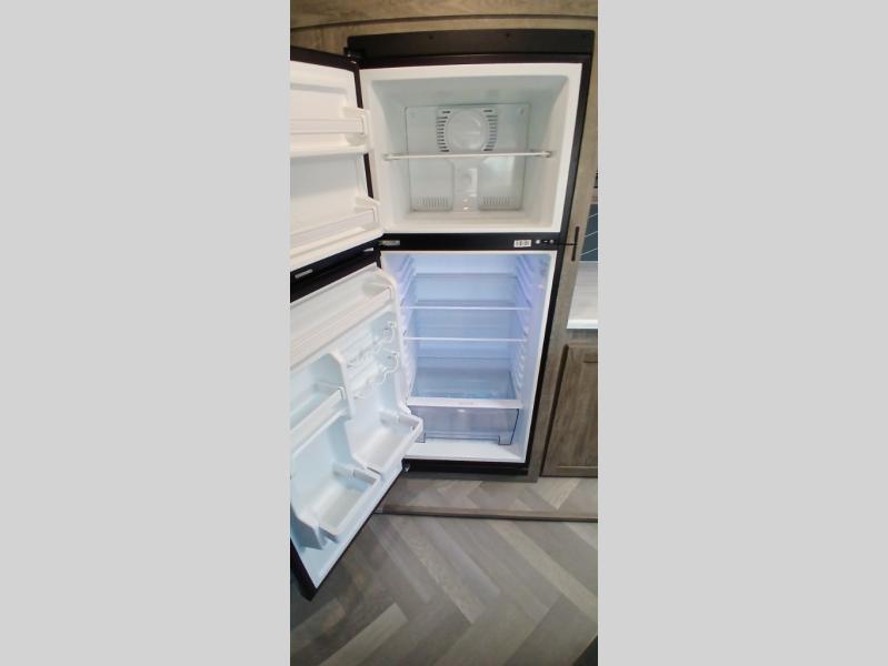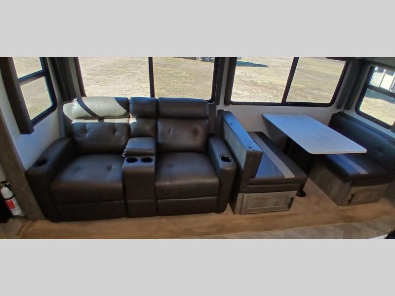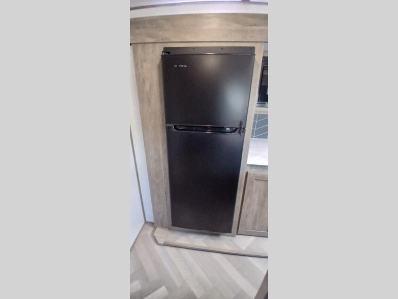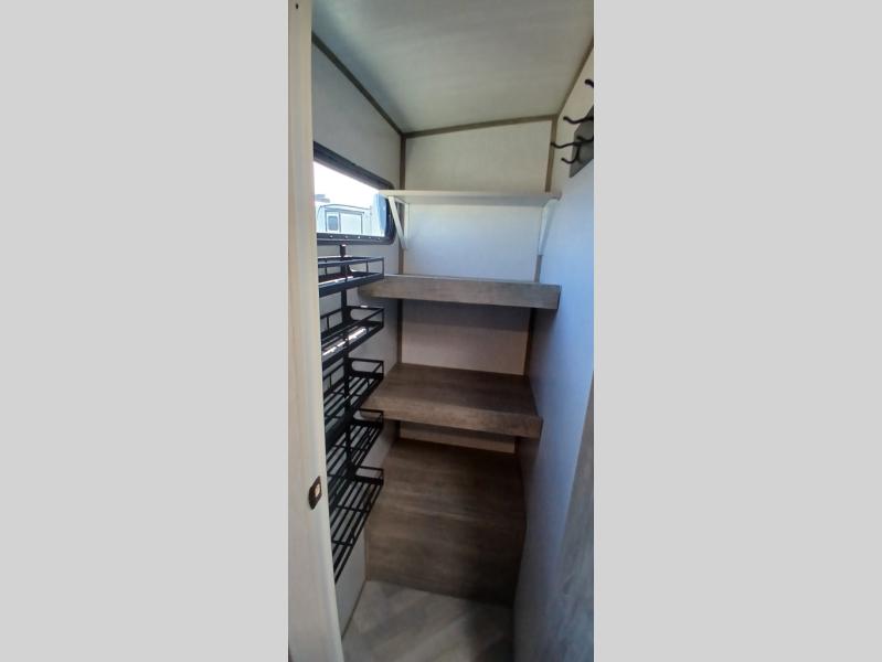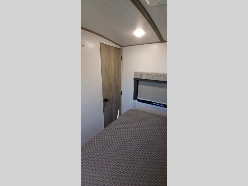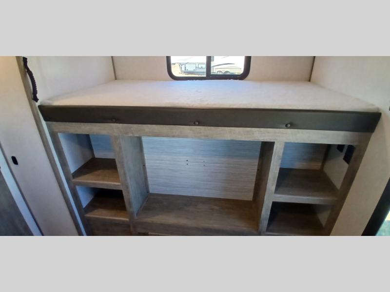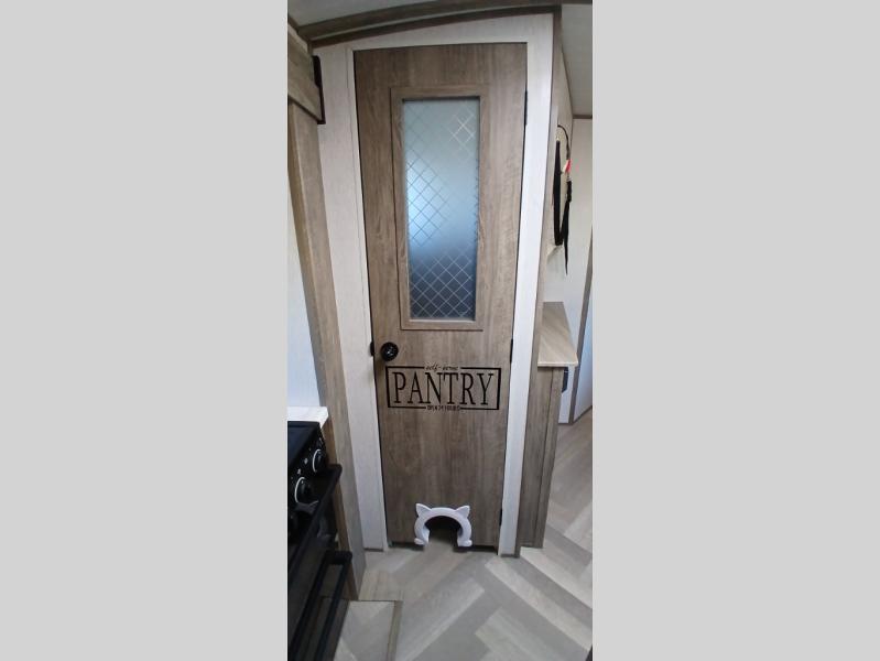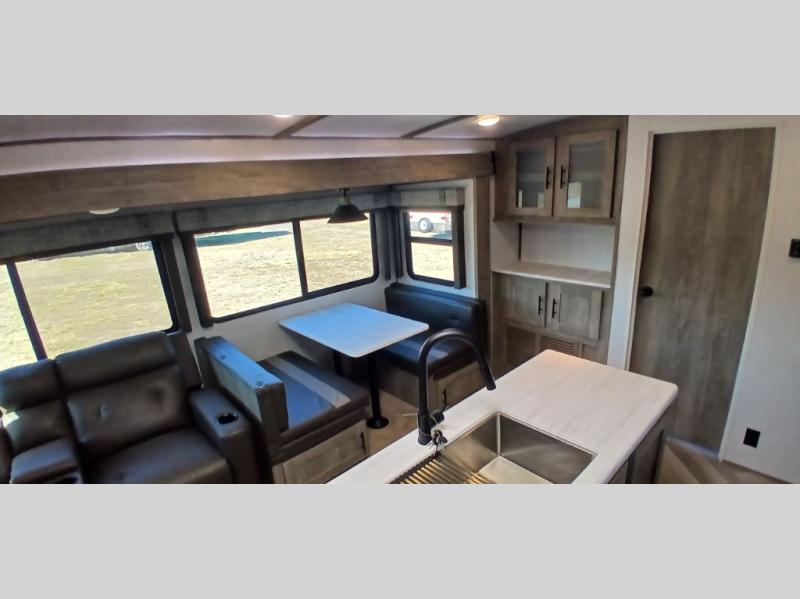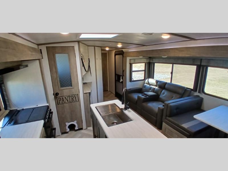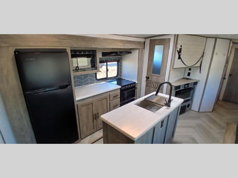 Your kids or friends are going to love camping in this travel trailer! It features a rear private bunkhouse with a bunk above a Versa queen convertible bed/sofa plus an additional bunk above an entertainment center with storage below. Just outside the bunkhouse is the kitchen with a 10.7 cu. ft. residential refrigerator, a microwave, a kitchen island, and a chef-sized walk-in pantry big enough to store everyone's favorite snacks. The booth dinette and the theatre seating are right next to panoramic windows so you can enjoy looking out at your beautiful scenery. You will also love taking a hot, steamy shower in the 30" x 36" walk-in shower and get a good night's rest on the queen bed in the front private bedroom!