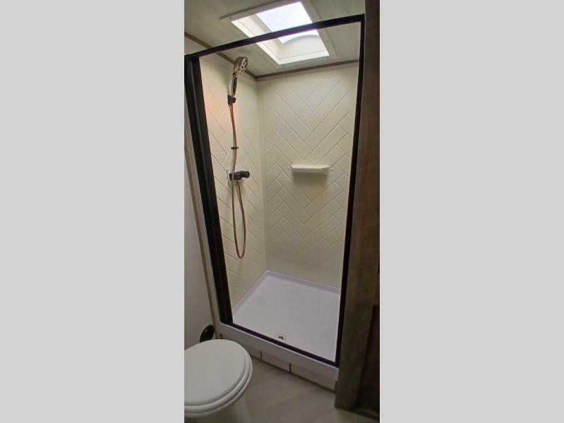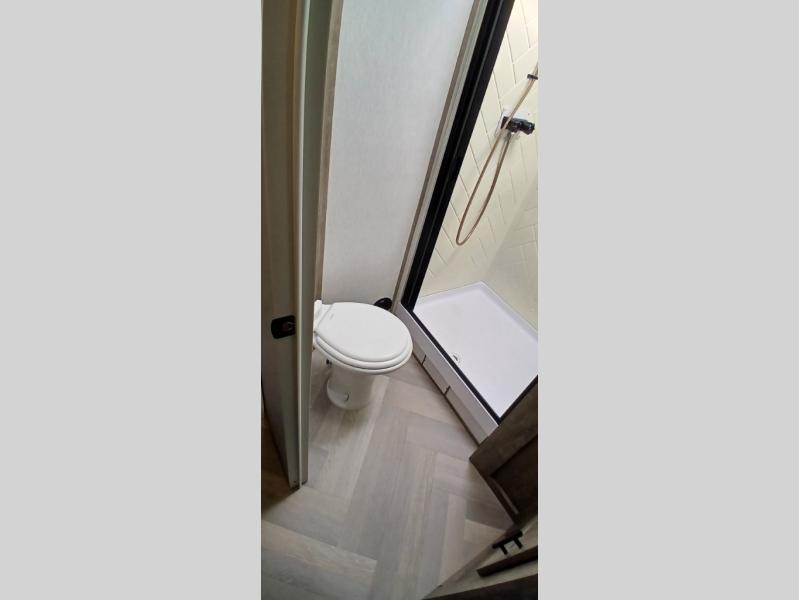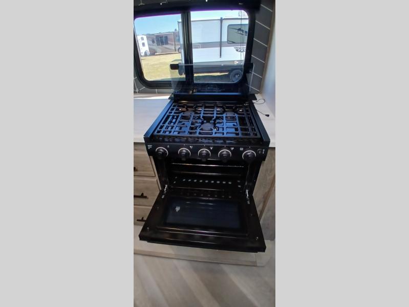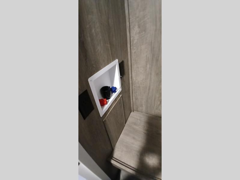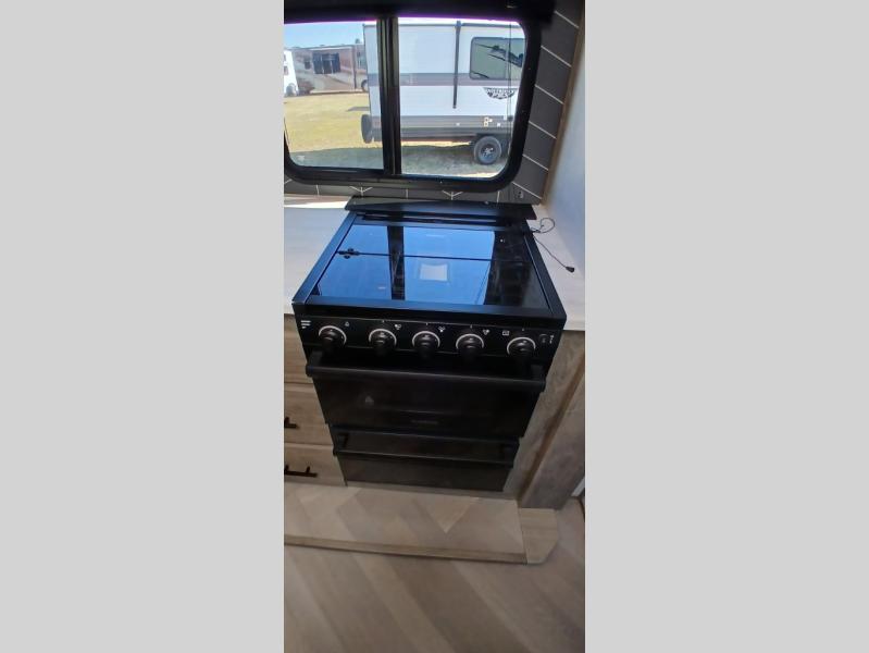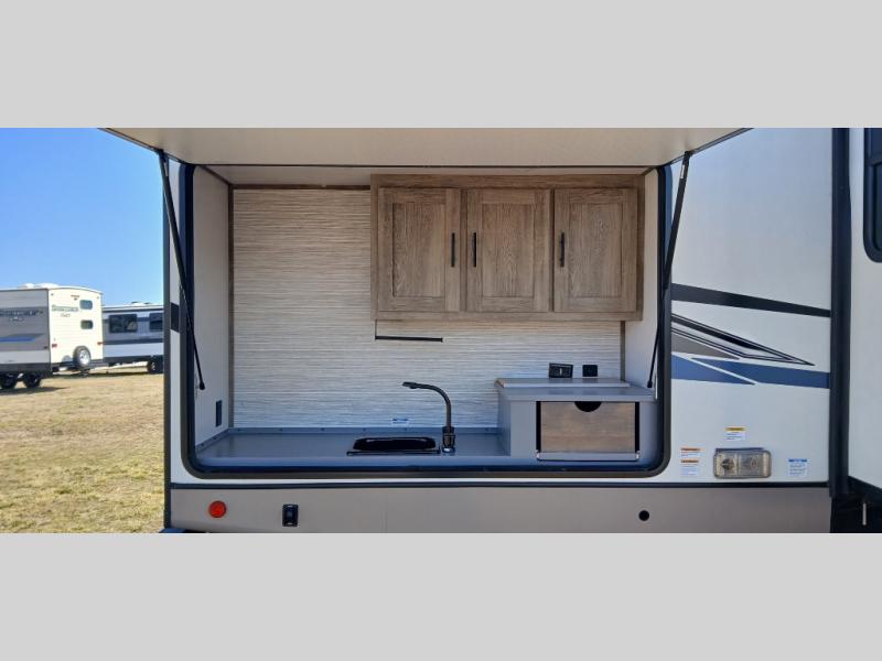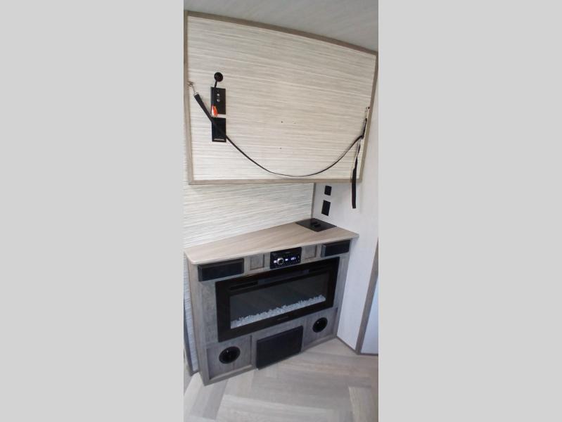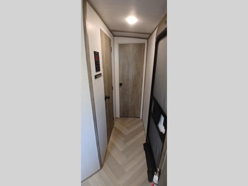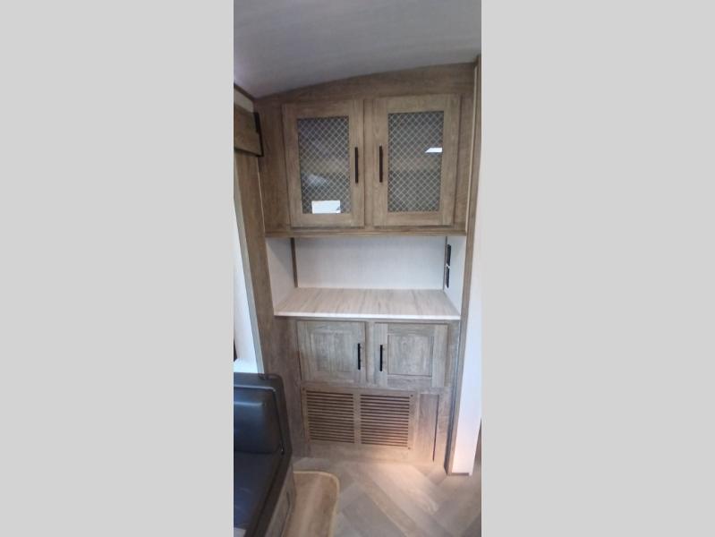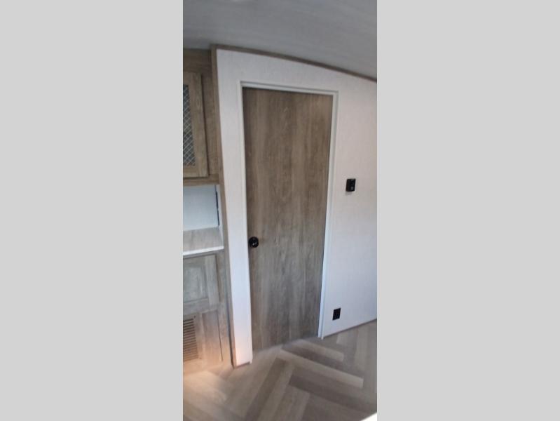 Your kids or friends are going to love camping in this travel trailer! It features a rear private bunkhouse with a bunk above a Versa queen convertible bed/sofa plus an additional bunk above an entertainment center with storage below. Just outside the bunkhouse is the kitchen with a 10.7 cu. ft. residential refrigerator, a microwave, a kitchen island, and a chef-sized walk-in pantry big enough to store everyone's favorite snacks. The booth dinette and the theatre seating are right next to panoramic windows so you can enjoy looking out at your beautiful scenery. You will also love taking a hot, steamy shower in the 30" x 36" walk-in shower and get a good night's rest on the queen bed in the front private bedroom!